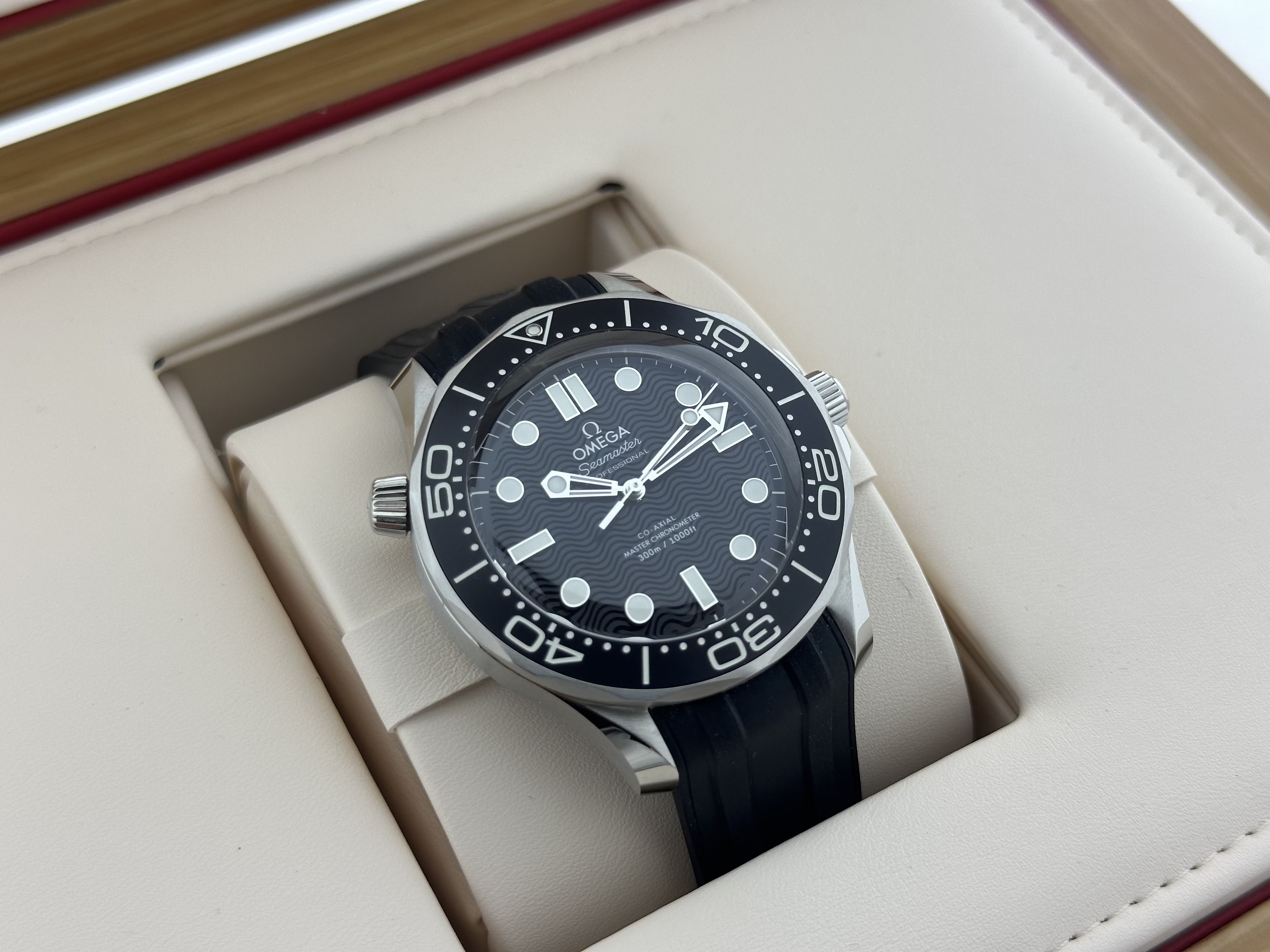 An Omega Seamaster Diver 300m watch, fullset. The watch has a 42mm steel case with a black oxalic anodized aluminium bezel ring with a diving scale in white Super-LumiNova. Black aluminium is also used to create the dial, which features a laser-engraved with the Diver’s iconic wave pattern. The watch has a black rubber strap with a steel folding clasp. The Omega has a sapphire-crystal caseback that showcases the movement. This Omega Seamaster Diver 300M watch is like new and complete with its box, certificate and travelbox.