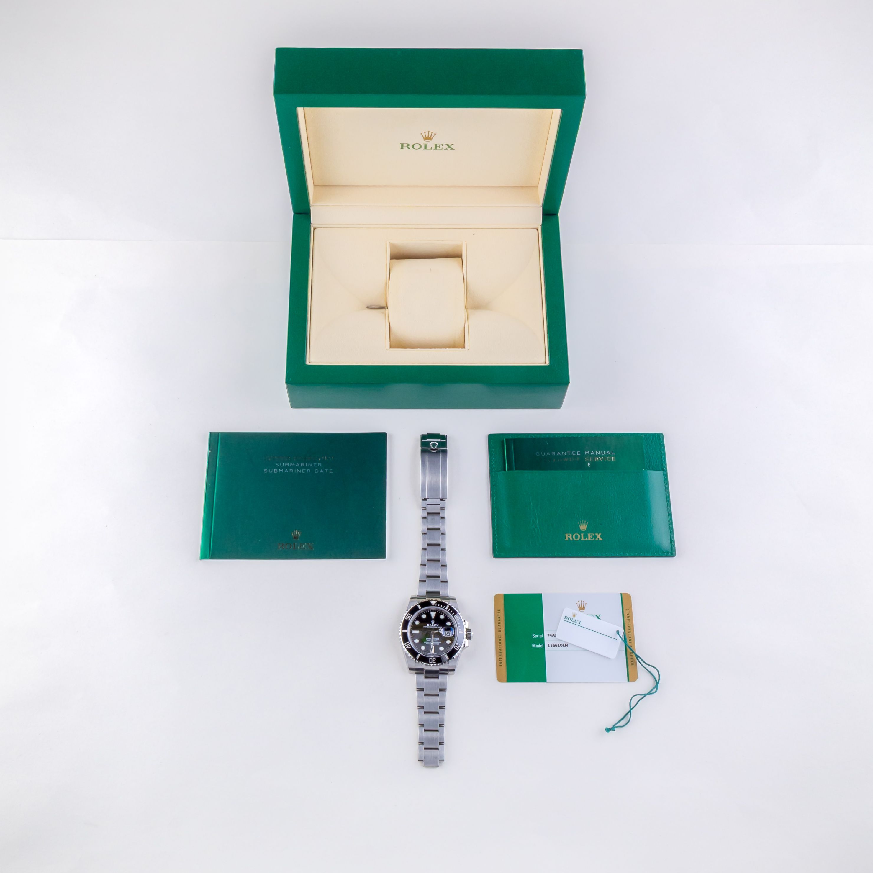 Rolex Oyster Perpetual Submariner Reference 116610 from 2019 including full set. The Submariner 116610 measures a 40mm stainless steel case, a stainless steel Oyster bracelet w/ Fliplock clasp and black rotatable bezel. The Submariner 116610 features an automatic caliber 3135 with quickset date function, a scratch resistance sapphire crystal and black dial with chromalight display.