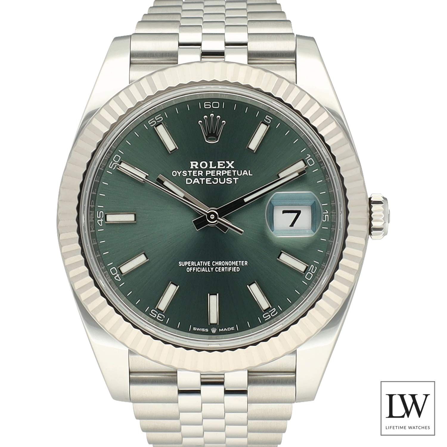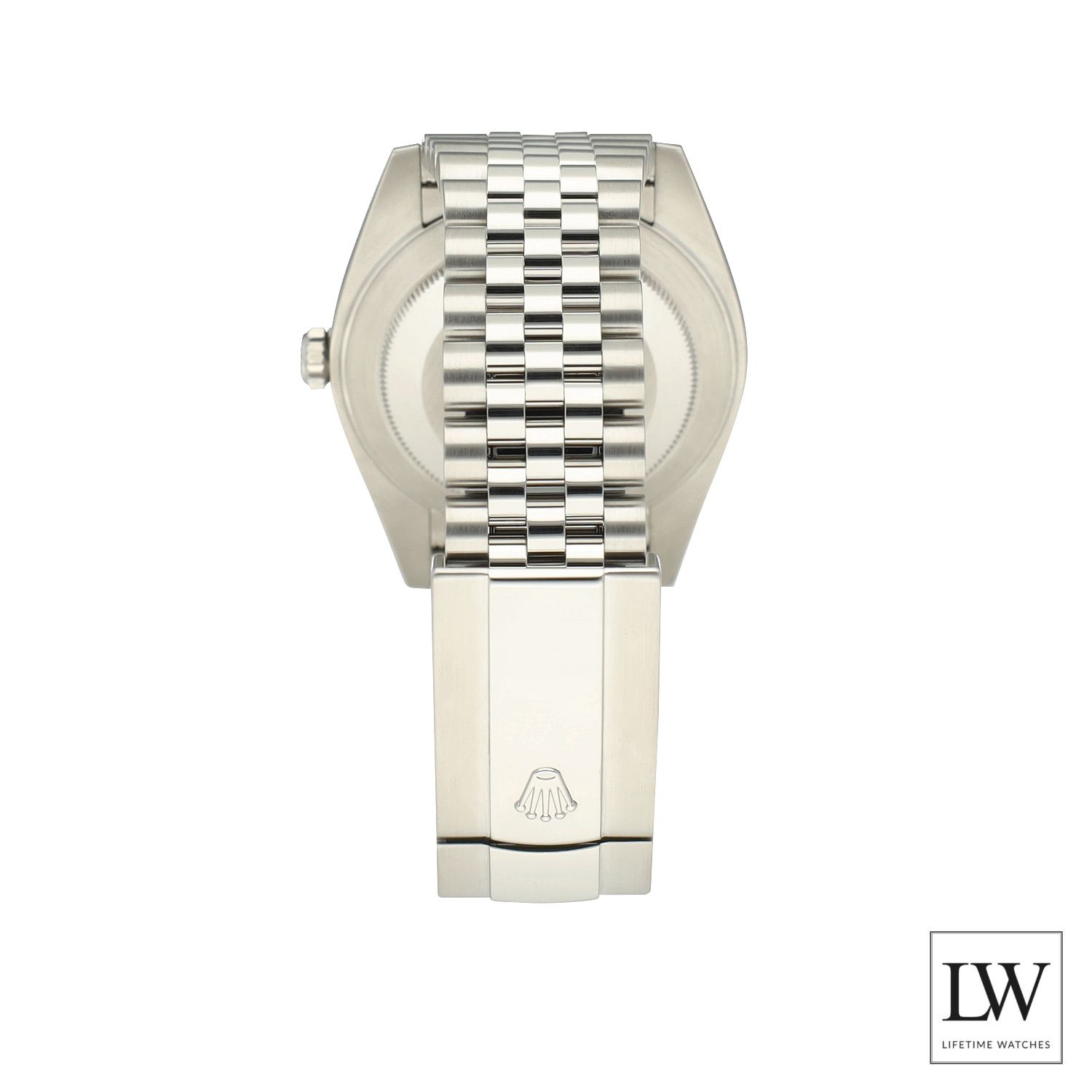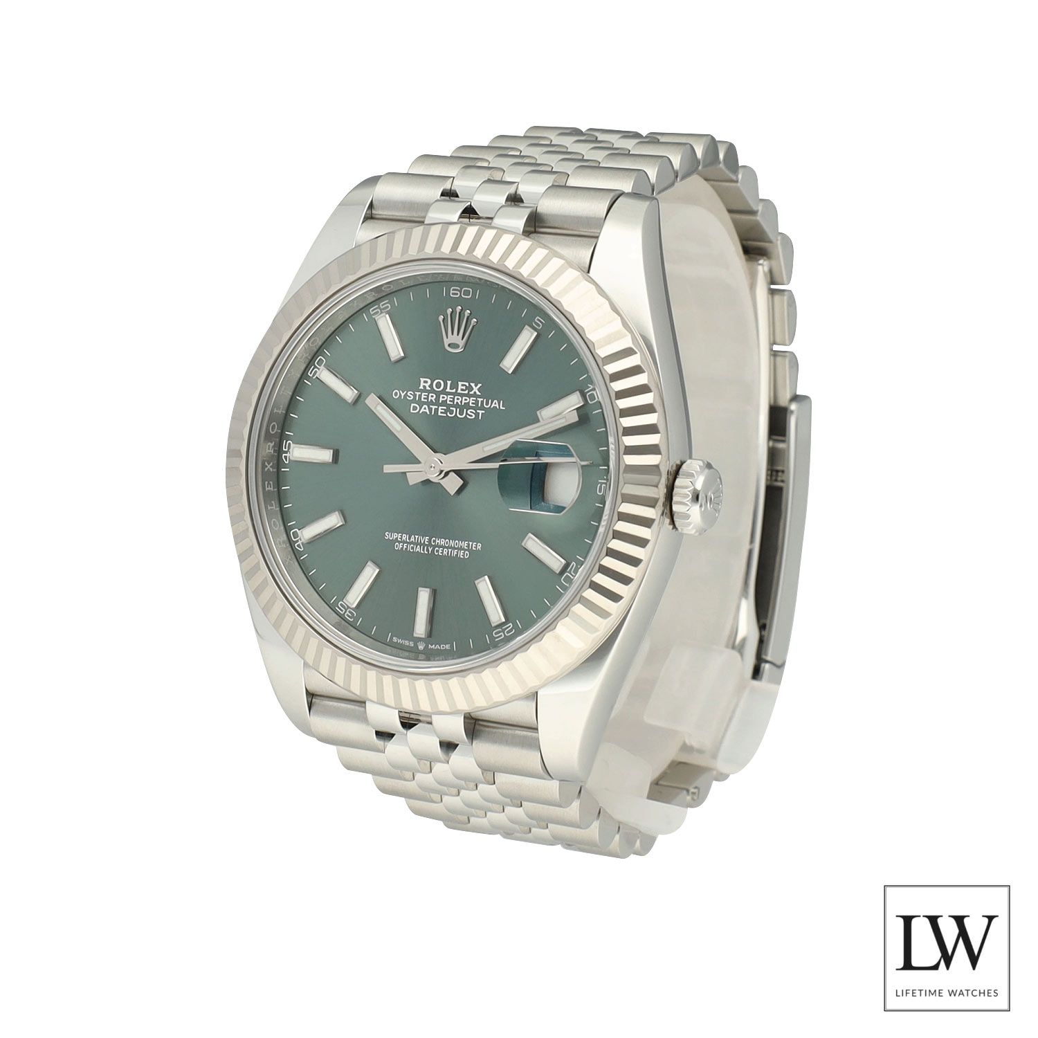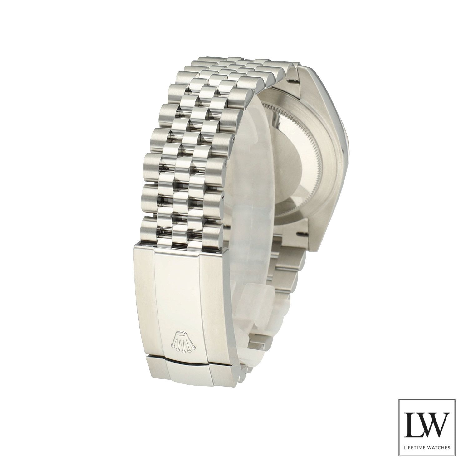 The 41 mm case is made from Oystersteel, topped with an 18-carat white gold fluted bezel, and paired with the refined Jubilee bracelet, offering both classic style and maximum comfort.
