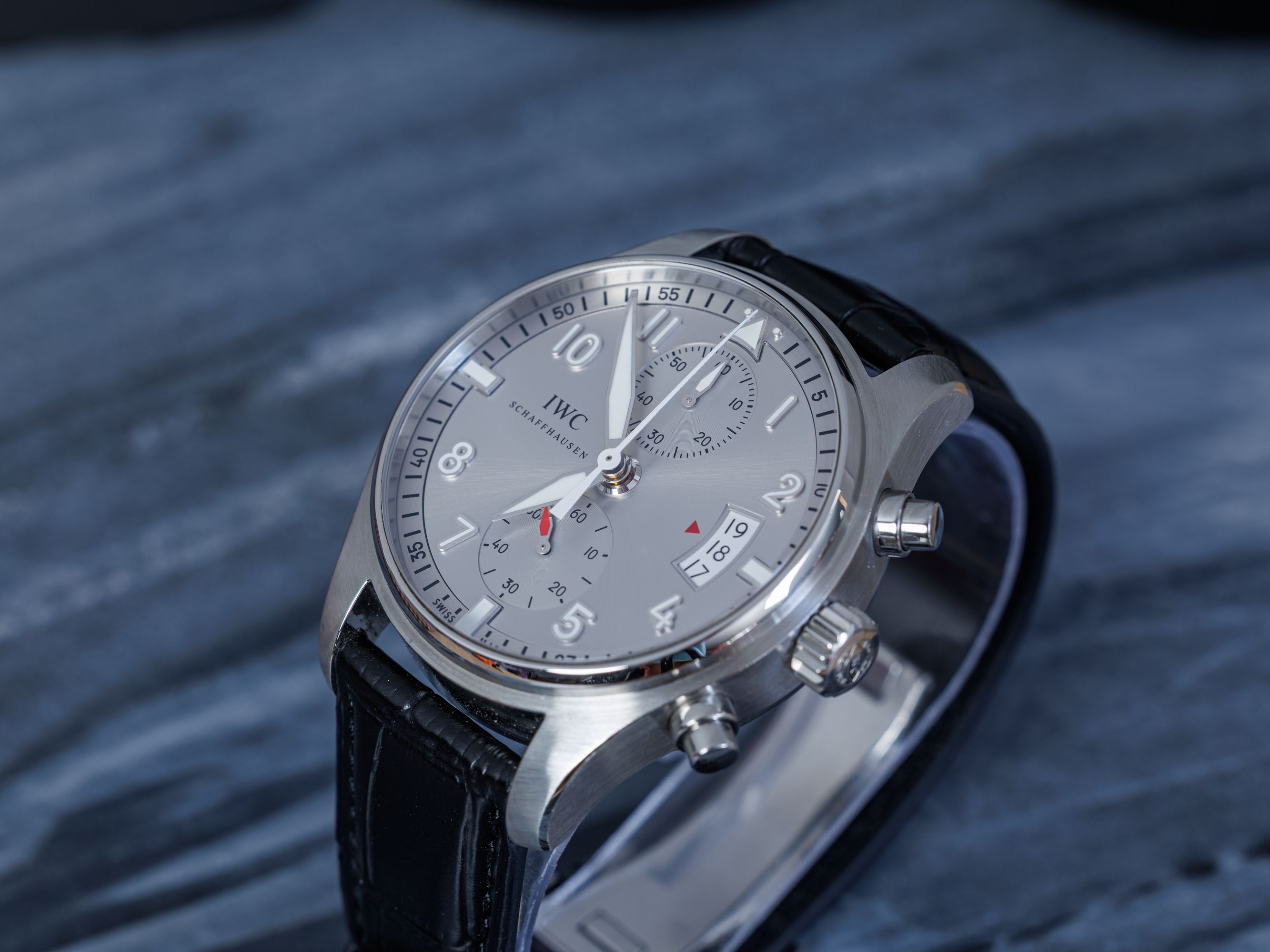 Ref. IW387809 stands out with its elegant sunburst silver dial, which plays beautifully with the light, and the classic chronograph subdial layout. At its heart beats the in-house IWC Calibre 89365 – an automatic movement with a flyback function and 68-hour power reserve, offering outstanding precision and reliability.