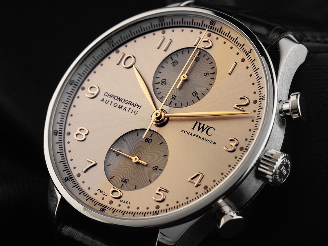 Gehäuse Edelstahl poliert und satiniert, Gehäusedurchmesser ohne Krone 41mm, Gehäusehöhe 13,0mm. Lünette Edelstahl glatt und poliert. IWC Armband Krokleder schwarz, Anstoßbreite 20mm, Doppelfaltschließe Edelstahl mit Hersteller-Logo. Zifferblatt champagnerfarben mit aufgesetzten roségoldenen arabischen Ziffern und roségoldenen Zeigern. Uhrwerk Automatik, Chronograph, IWC Manufakturwerk 69355 mit 27 Edelsteinen, Gangreserve ca. 46 Stunden. Anzeige von Stunde und Minute über Zeiger aus der Mitte, kleine Sekunde mit Sekundenstopp zur sekundengenauen Einstellung der Uhrzeit bei 6 Uhr. Saphirglas kratzfest. Krone mit Hersteller-Logo. Boden Edelstahl 4-fach verschraubt und graviert mit Saphirglas Sichtfenster. Gewicht der Uhr inklusive Armband 86g. Wasserdicht bis 3 ATM. Referenznummer: IW371624, ID: ST5806130280925H-9100, Artikelnummer: 10000082473. Original IWC Box mit Umkarton und Garantie Papiere von September 2025 sowie Beschreibung, Full Set. Ungetragen. Lieferzeit sofort.