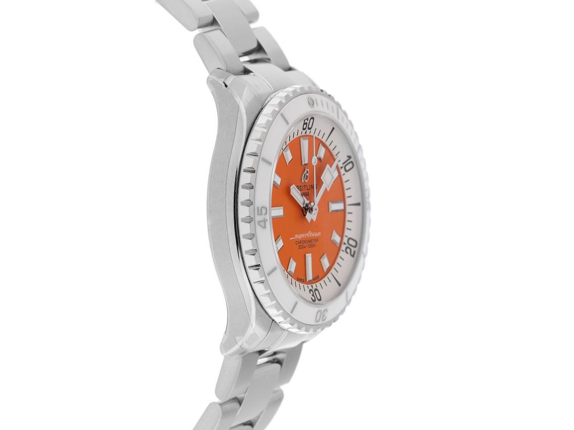 Gehäuse Edelstahl poliert und satiniert, Gehäusedurchmesser ohne Krone 36mm, Gehäusehöhe 12,2mm. Lünette Edelstahl geriffelt mit weißem Keramik Inlay und 60-Minuten Skala, einseitig drehbar. Armband Edelstahl poliert und satiniert, Sicherheitsfaltschließe Edelstahl mit Hersteller-Logo. Zifferblatt orange mit aufgesetzten Edelstahl Leuchtindexen und Edelstahl Leuchtzeigern. Uhrwerk Automatik, Chronometer mit Zeugnis, Kaliber Breitling 17 mit 26 Edelsteinen, Gangreserve ca. 38 Stunden. Anzeige von Stunde, Minute und Sekunde über Zeiger aus der Mitte mit Sekundenstopp zur sekundengenauen Einstellung der Uhrzeit. Saphirglas kratzfest, doppelseitig entspiegelt und bombiert. Krone verschraubbar mit Flankenschutz und Hersteller-Logo. Boden Edelstahl verschraubt und graviert. Gewicht der Uhr inklusive Armband 125g, Länge des Armbandes inklusive Gehäuse 180mm, Wasserdicht bis 30 ATM. Referenznummer: A17377211O1A1, ID: ST580675241025H-5550, Artikelnummer: 10000082488. Original Breitling Box und Garantie Papiere von 2025 sowie Beschreibung, Full Set. Ungetragen. Lieferzeit sofort.