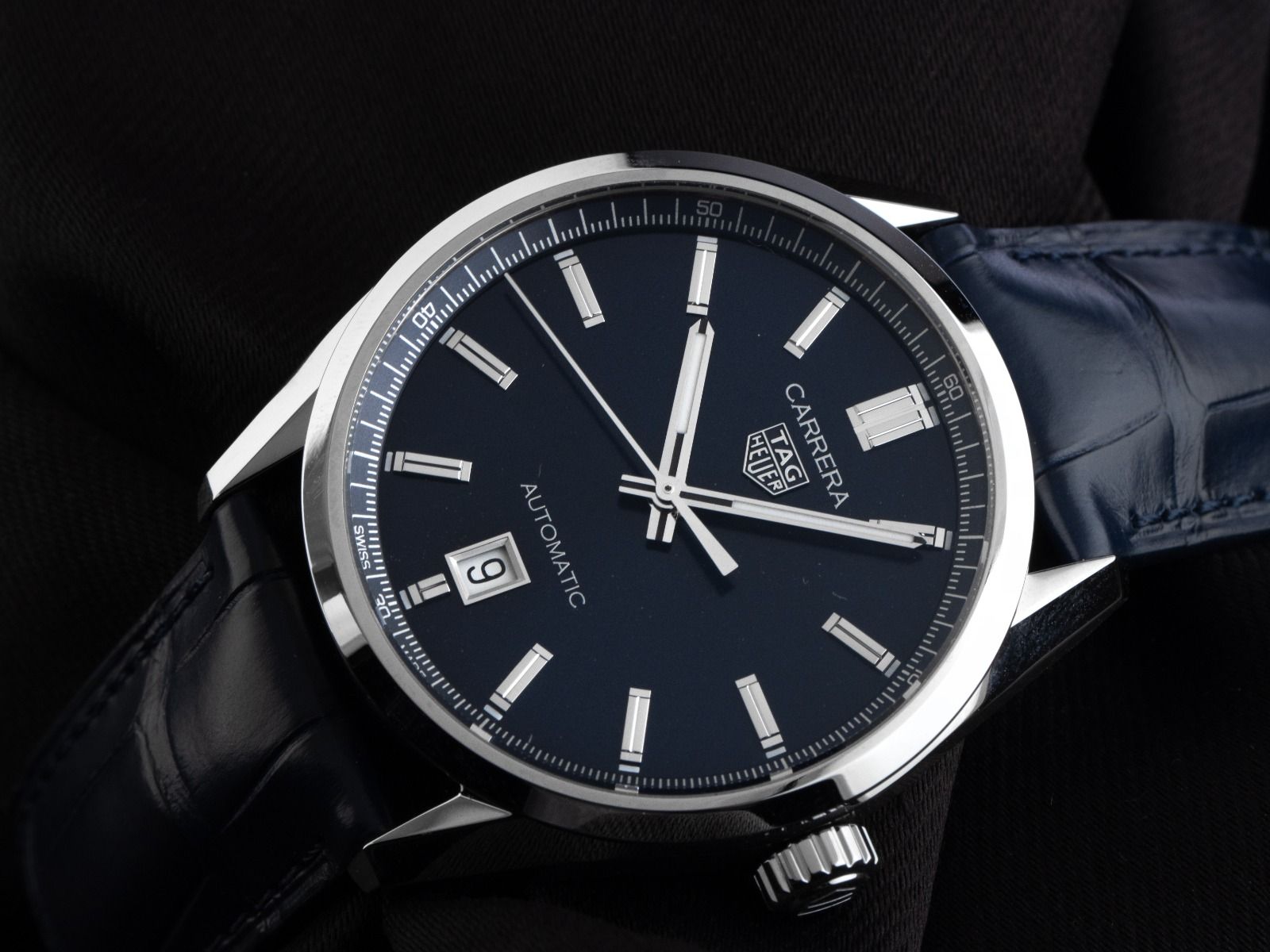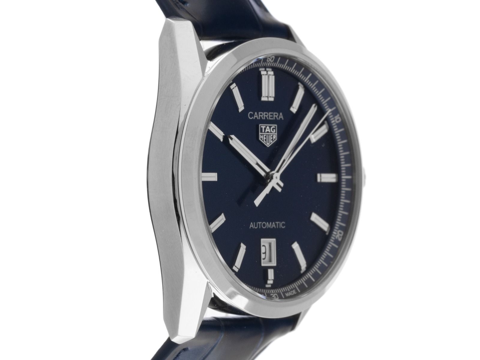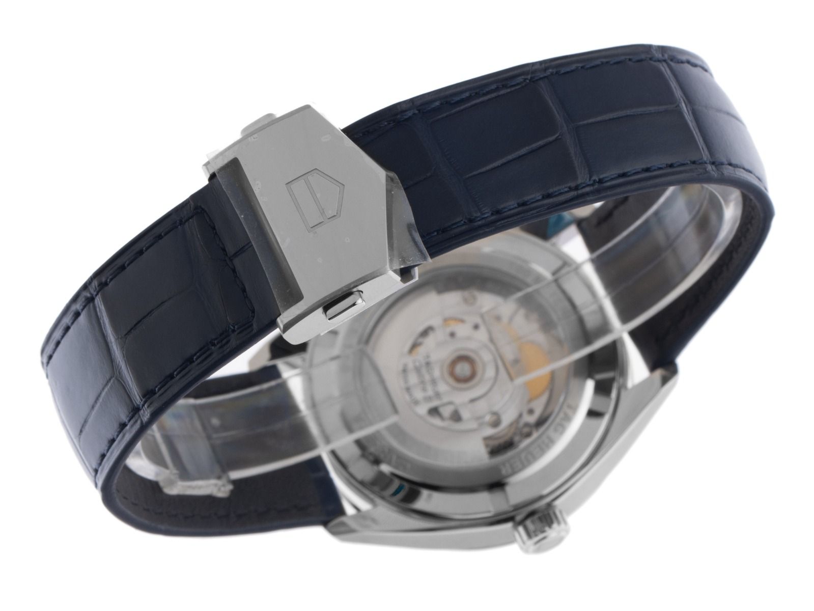 Gehäuse Edelstahl poliert, Gehäusedurchmesser ohne Krone 39mm, Gehäusehöhe 11,5mm. Lünette Edelstahl glatt und poliert. Armband Krokoleder blau mit Ziernaht, Anstoßbreite 20mm, Sicherheitsfaltschließe Edelstahl mit Hersteller-Logo. Zifferblatt blau mit aufgesetzten Edelstahl Leuchtindexen und polierten Edelstahl Leuchtzeigern. Uhrwerk Automatik, Kaliber Tag Heuer Calibre 5 mit 26 Edelsteinen, Gangreserve ca. 38 Stunden. Anzeige von Stunde, Minute und Sekunde über Zeiger aus der Mitte mit Sekundenstopp zur sekundengenauen Einstellung der Uhrzeit, Datumsanzeige mit Schnellverstellung bei 6 Uhr. Saphirglas kratzfest und gewölbt. Krone mit Hersteller-Logo. Boden Edelstahl verschraubt und graviert mit Saphirglas Sichtfenster. Gewicht der Uhr inklusive Armband 75g. Wasserdicht bis 10 ATM. Referenznummer: WBN2112.FC6504, ID: ST580642761025H-3400, Artikelnummer: 10000082500. Original Tag Heuer Box mit Umkarton und Garantie Papiere von 2025, Full Set. Ungetragen. Lieferzeit sofort.