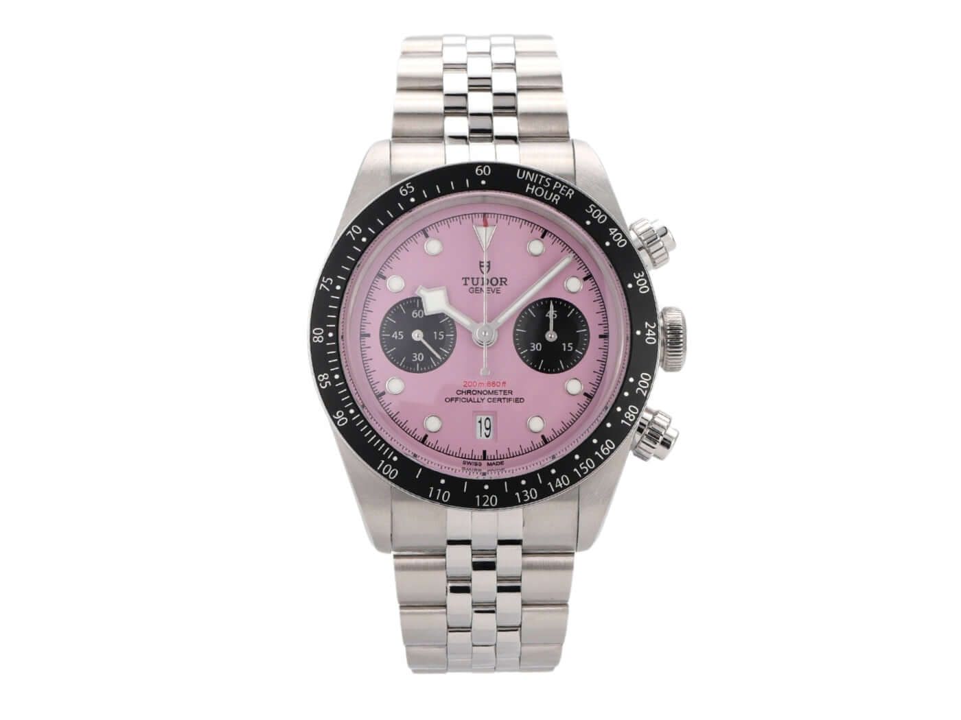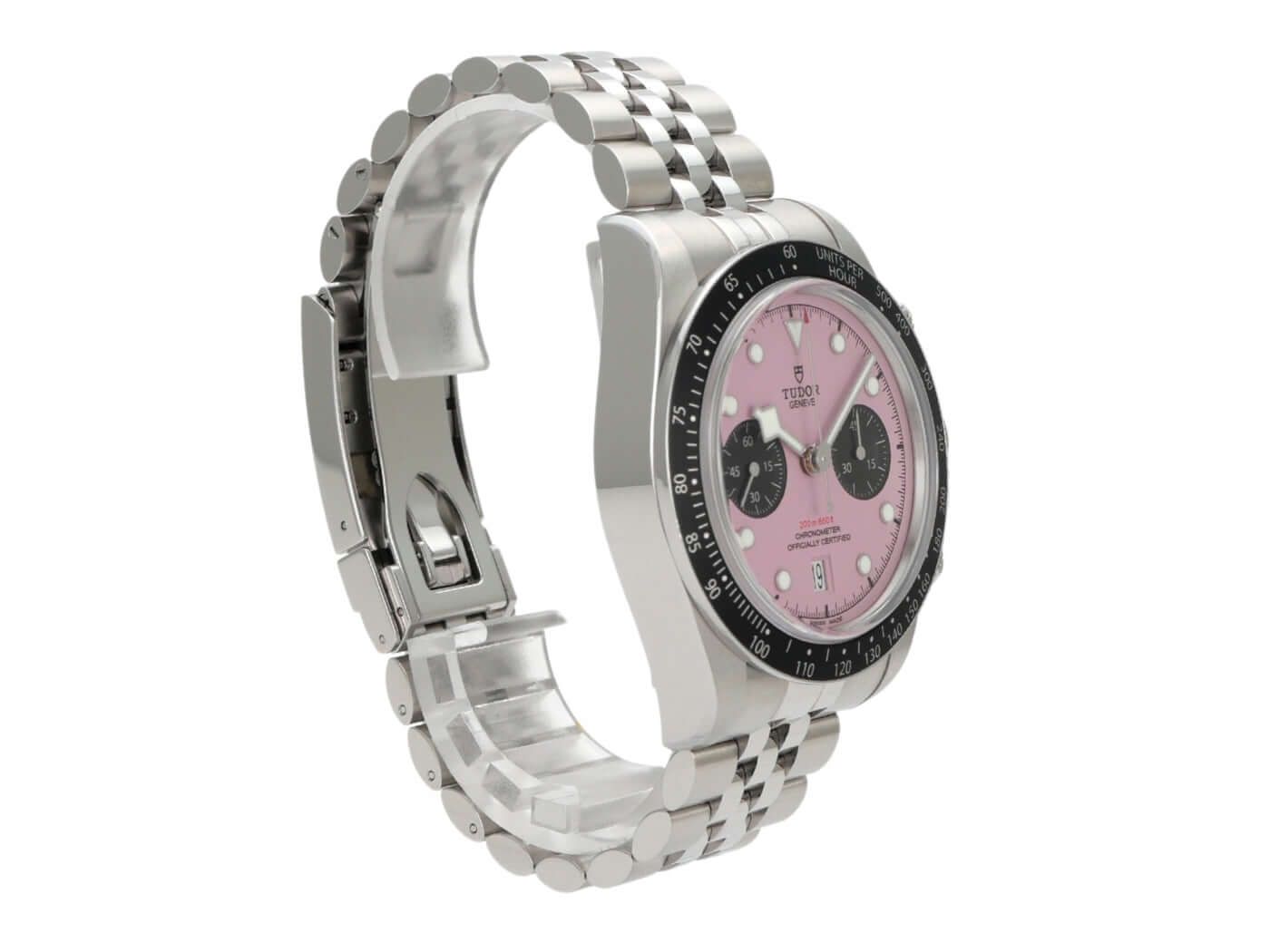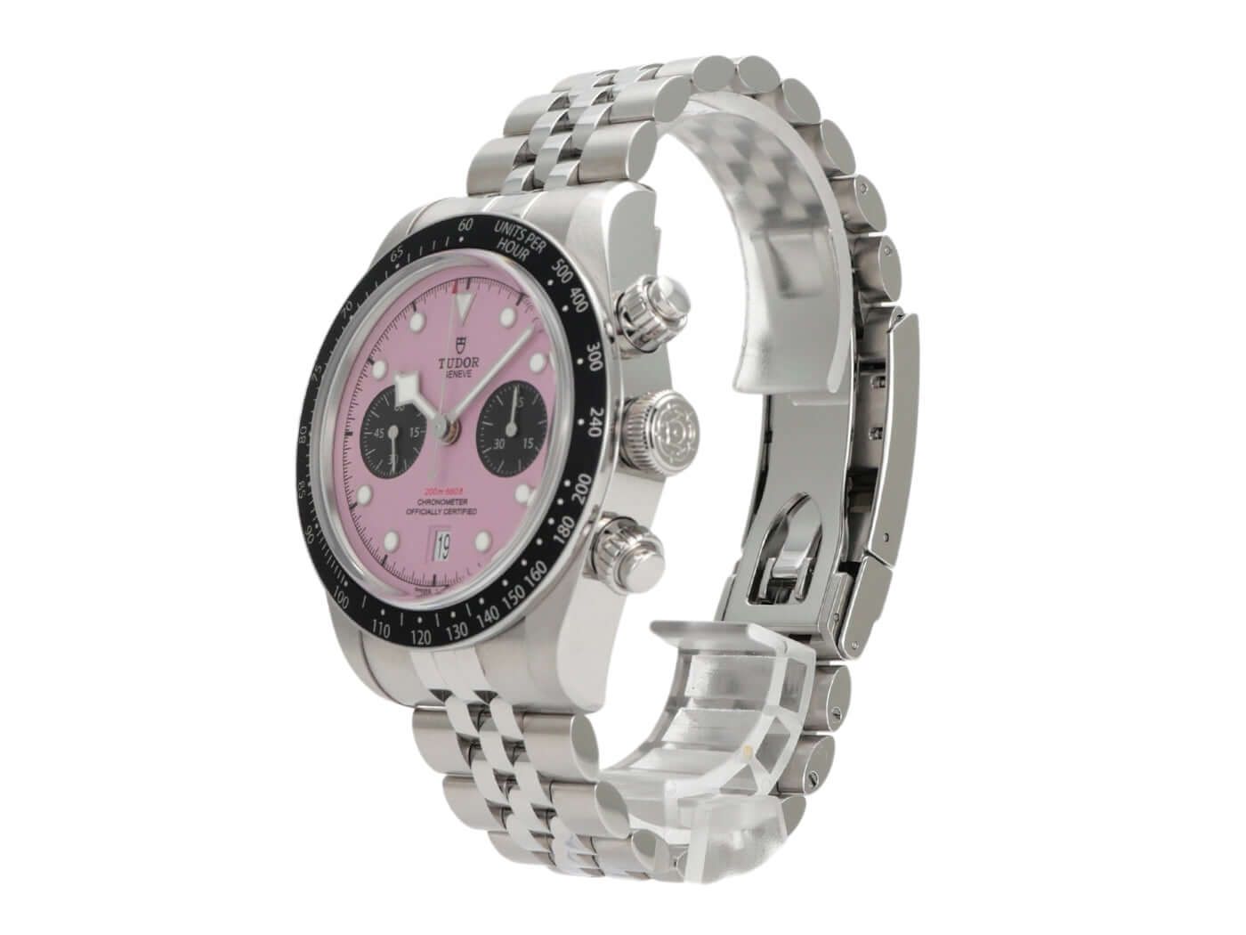 Case made of polished and satin-finished stainless steel, case diameter 41 mm, case height 12.7 mm, stainless steel bezel with 60-minute scale and luminous dot, unidirectional rotating, stainless steel bracelet with folding clasp, pink dial with applied luminous indices, black subdials, luminous hands, automatic movement, Tudor MT5813 manufacture caliber, 70 hours power reserve, chronograph, date, chronometer, sapphire crystal, screwed crown, screwed and engraved stainless steel case back, water-resistant up to 20 bar.