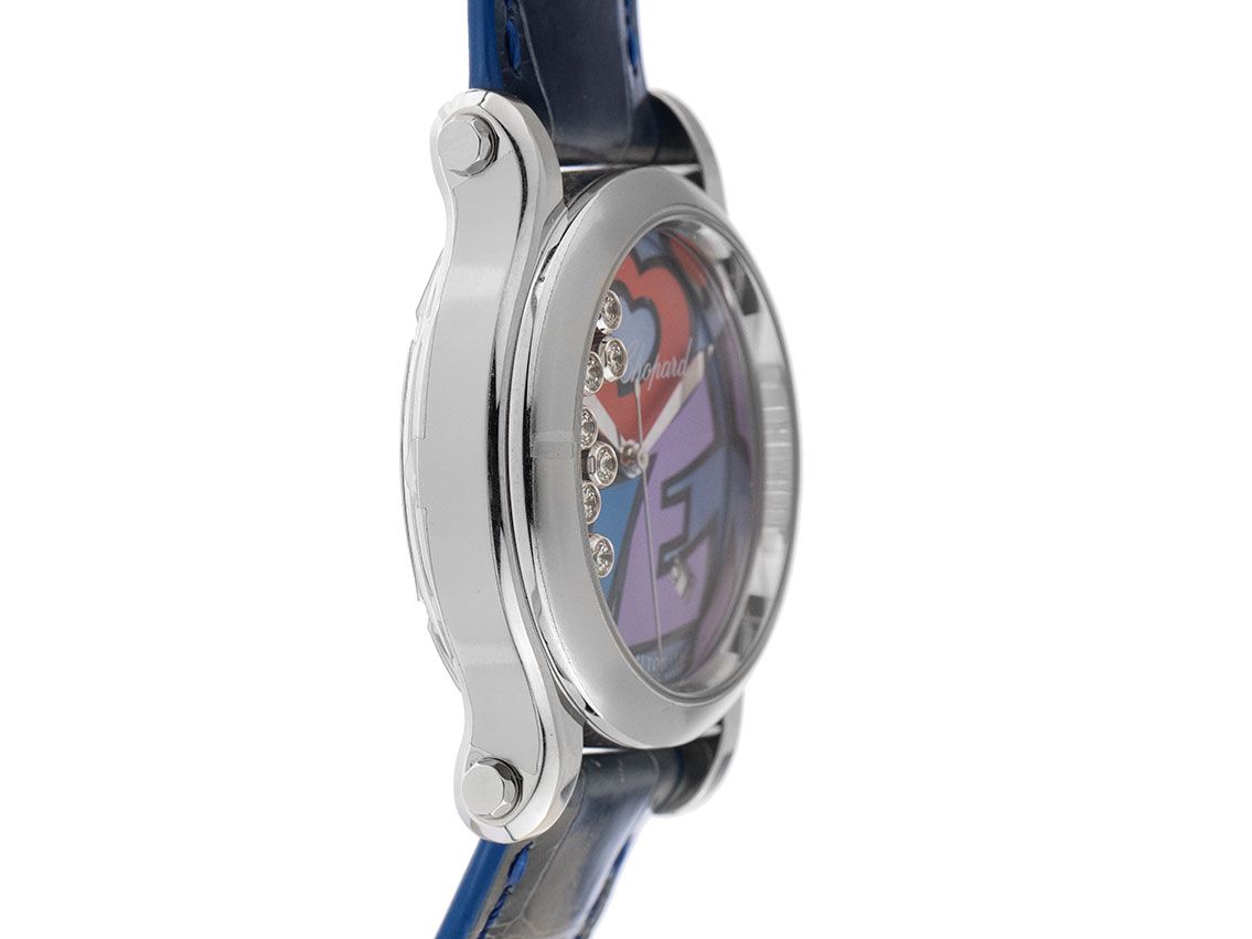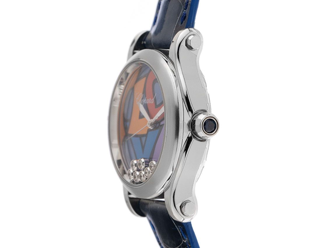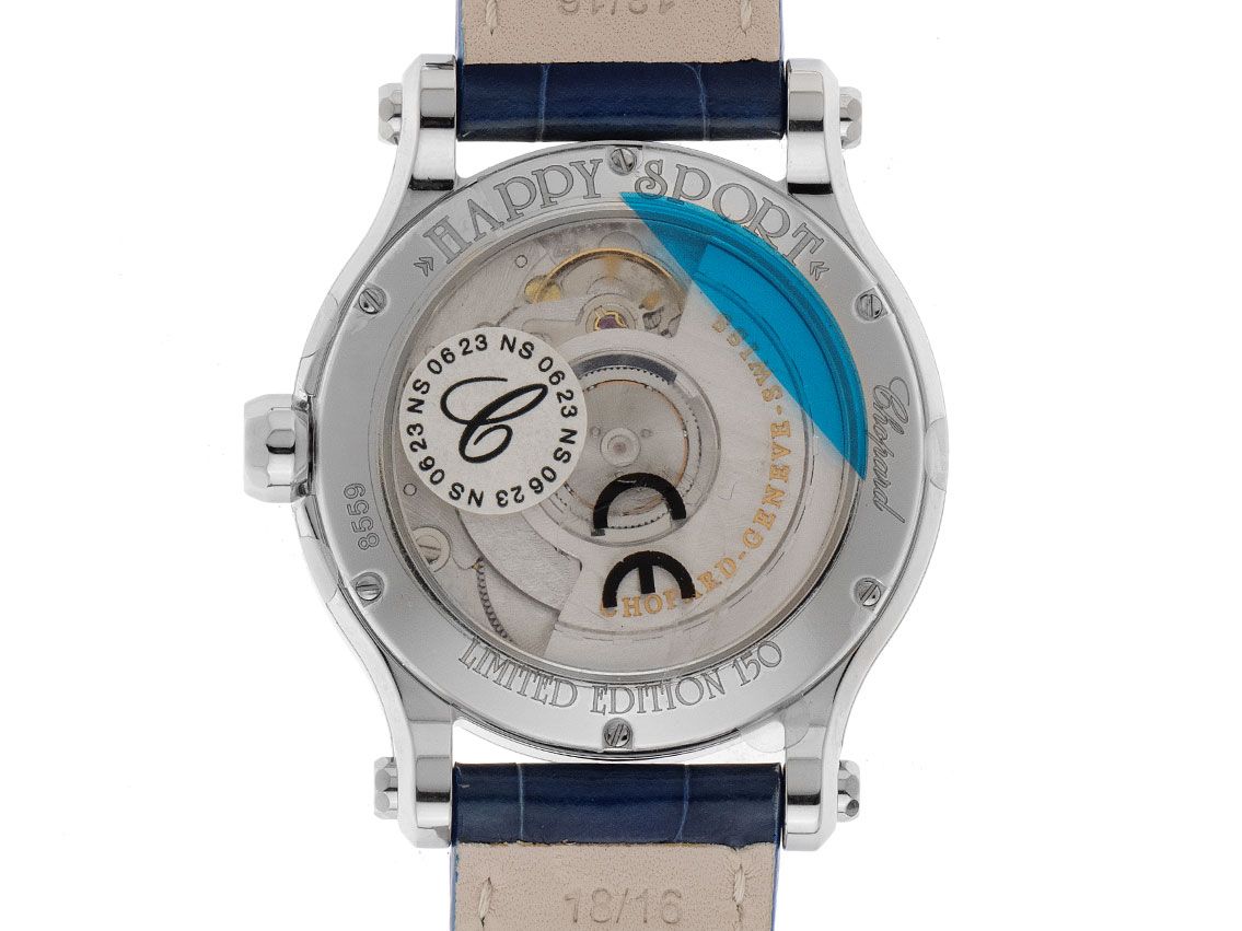 Gehäuse Edelstahl poliert, Gehäusedurchmesser ohne Krone 36mm, Gehäusehöhe 12,5mm. Lünette Edelstahl glatt und poliert. Armband Leder blau mit Ziernaht, Anstoßbreite 18mm, Stiftschließe Edelstahl mit Hersteller-Logo. Zifferblatt Perlmutt blau mit Love Aufschrift, 7 beweglichen in 18kt Weißgold gefassten Diamanten, zusammen ca. 0,35ct und weißgoldenen Zeigern. Uhrwerk Automatik, Kaliber Chopard SW300 mit 25 Edelsteinen, Gangreserve ca. 42 Stunden. Anzeige von Stunde, Minute und Sekunde über Zeiger aus der Mitte mit Sekundenstopp zur sekundengenauen Einstellung der Uhrzeit, Datumsanzeige mit Schnellverstellung zwischen4 und 5 Uhr. Saphirglas kratzfest. Krone mit Saphir ca. 0,17ct. Boden Edelstahl 6-fach verschraubt und graviert mit Saphirglas Sichtfenster. Wasserdicht bis 3 ATM. Gewicht der Uhr inklusive Armband 61g. Referenznummer: 278559-3020, ID: ST5806122881025H-9220, Artikelnummer: 10000082527. Original Chopard Box mit Umkarton und Garantie Papiere von 2025 sowie Beschreibung, Full Set. Limitiert auf 150 Exemplare. Ungetragen. Lieferzeit sofort.