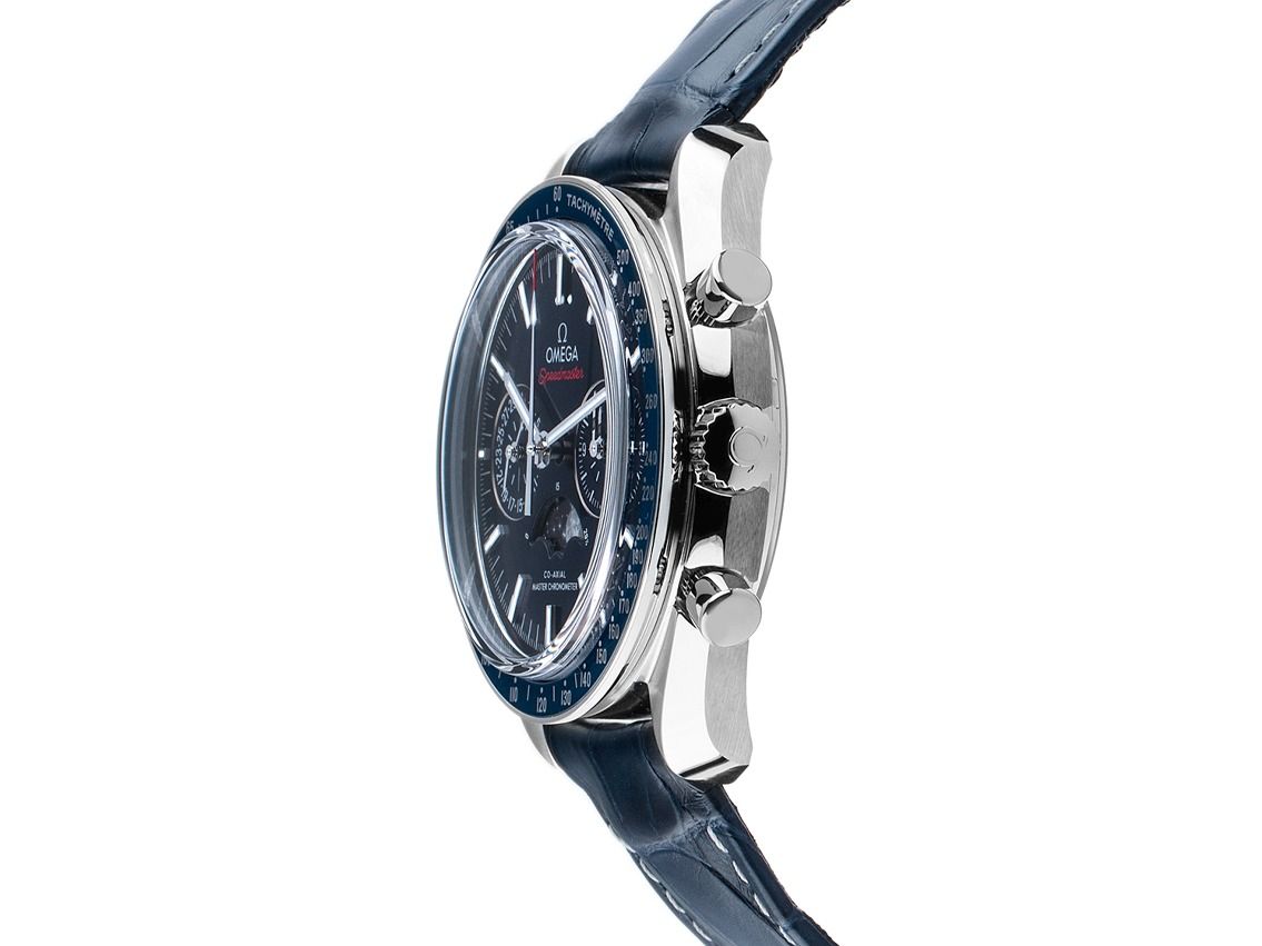 Gehäuse Edelstahl poliert und satiniert, Gehäusedurchmesser ohne Krone 44,25mm, Gehäusehöhe 7,6mm. Lünette Edelstahl mit blauem Keramik Inlay und Tachymeterskala. Armband Leder blau mit heller Ziernaht, Anstoßbreite 21mm, Sicherheitsfaltschließe Edelstahl mit Hersteller-Logo. Zifferblatt blau mit aufgesetzten Edelstahl Leuchtindexen und Edelstahl Leuchtzeigern. Uhrwerk Automatik, Chronograph, Chronometer mit Zeugnis, Omega Manufakturkaliber 9904 mit 54 Edelsteinen, Säulenrad und Co-Axial Hemmung, Gangreserve ca. 60 Stunden. Anzeige von Stunde und Minute über Zeiger aus der Mitte, kleine Sekunde mit Sekundenstopp zur sekundengenauen Einstellung der Uhrzeit bei 9 Uhr, Datumsanzeige mit Schnellverstellung, ablesbar über Zeiger bei 9 Uhr, Mondphasenanzeige bei 6 Uhr mit Fußabdruck eines Astronauten. Saphirglas kratzfest und beidseitig entspiegelt. Krone mit Hersteller-Logo. Boden Edelstahl verschraubt und graviert mit Saphirglas Sichtfenster. Gewicht der Uhr inklusive Armband 110g. Wasserdicht bis 10 ATM. Referenznummer: 304.33.44.52.03.001, ID: ST5806172561025H-12200, Artikelnummer: 10000082619. Original Omega Box mit Umkarton und Garantie Papiere von September 2025 sowie Beschreibung, Full Set. Ungetragen. Lieferzeit sofort.