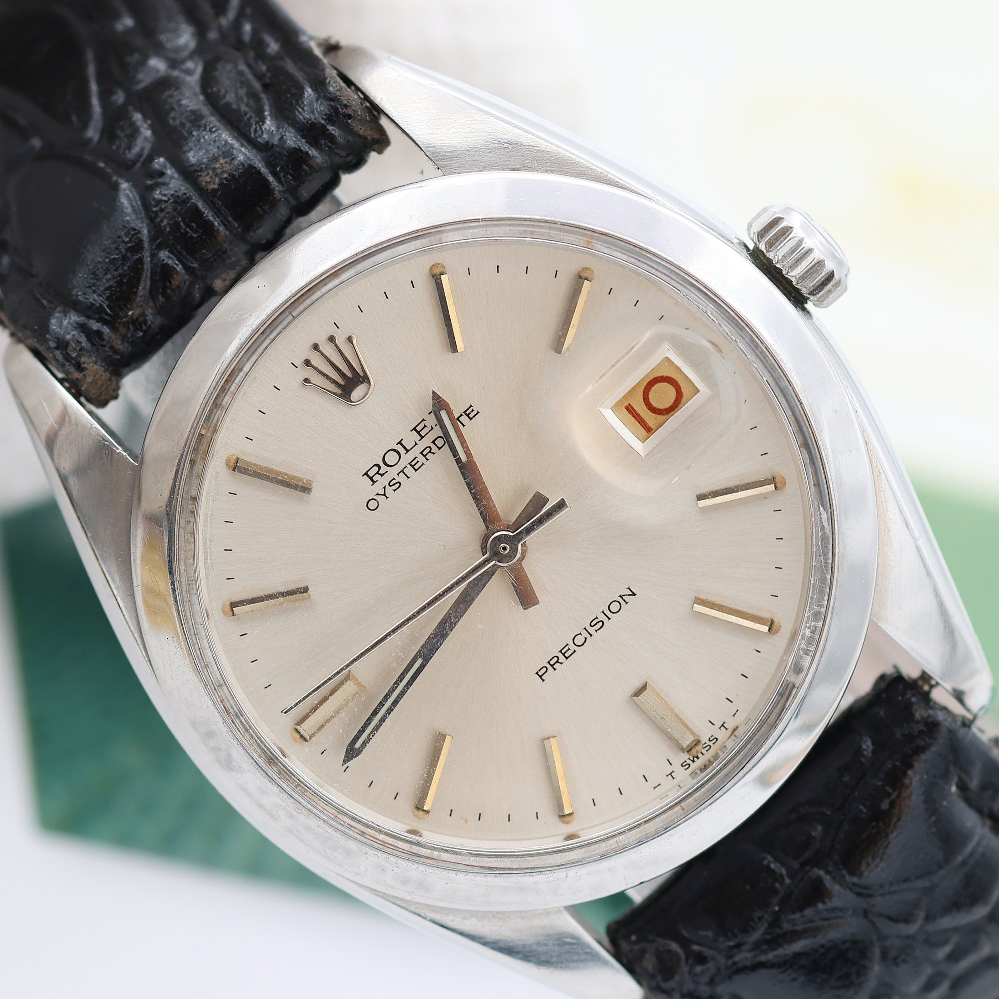 For sale at Debonar Watches: pre-owned Rolex Precision Date ref. 6694 from the '70s, with a classic silver dial, on a generic leather strap. This ROLEX can be an extremely classic fit for both him and her. The Precision model has always represented the ROLEX entry level range, sporting a 34mm case, the usual Oyster case with a thick plexiglass that stands out of the bezel, the instantly recognizable cyclope glass placed at three o'clock and a manual wind calibre. A bit of its story:The Precision reference 6694 began in the early 1960s and ran on with great success until it was discontinued at the end of the 1980s, earning it the distinction of being Rolex’s last manual-wind watch.Throughout that period, the Rolex Oysterdate Precision 6694 was one of the brand’s most popular models, occupying a budget-friendly option that still offered Rolex’s signature date display at 3 o’clock. Easily confused with the Oyster Perpetual and Oyster Perpetual Date, the Oysterdate is actually missing the “Perpetual” label in its name, to point out that it was one of the rare examples from Rolex that was not self-winding. BRAND ROLEX MODEL PRECISION DATE REFERENCE 6694 CASE MATERIAL STEEL MOVEMENT MANUAL WINDING DIMENSION 34 MM DIAL SILVER BEZEL STEEL CRYSTAL PLEXIGLASS BRACELET TYPE STRAP BRACELET MATERIAL LEATHER BRACELET LENGHT 16-18 CM ORIGINAL BOX NO ORIGINAL PAPERS NO YEAR AROUND '70s CONDITION VERY GOOD