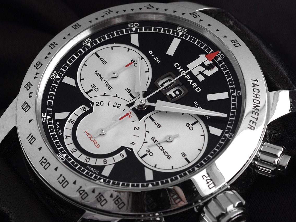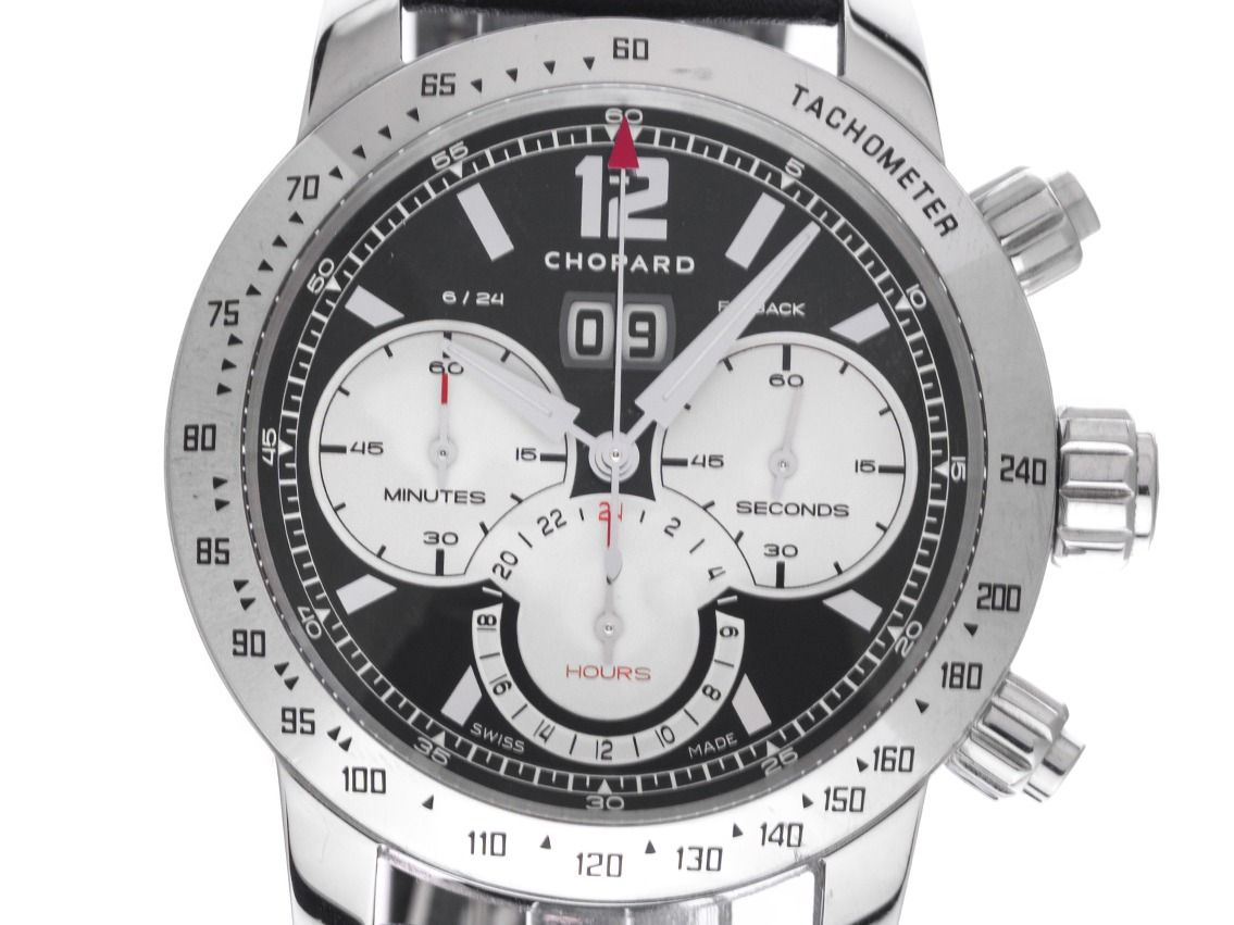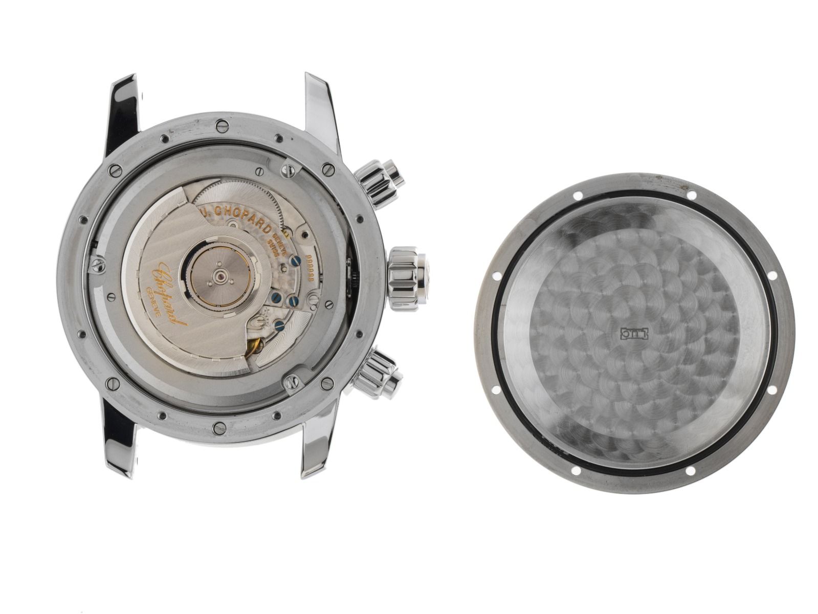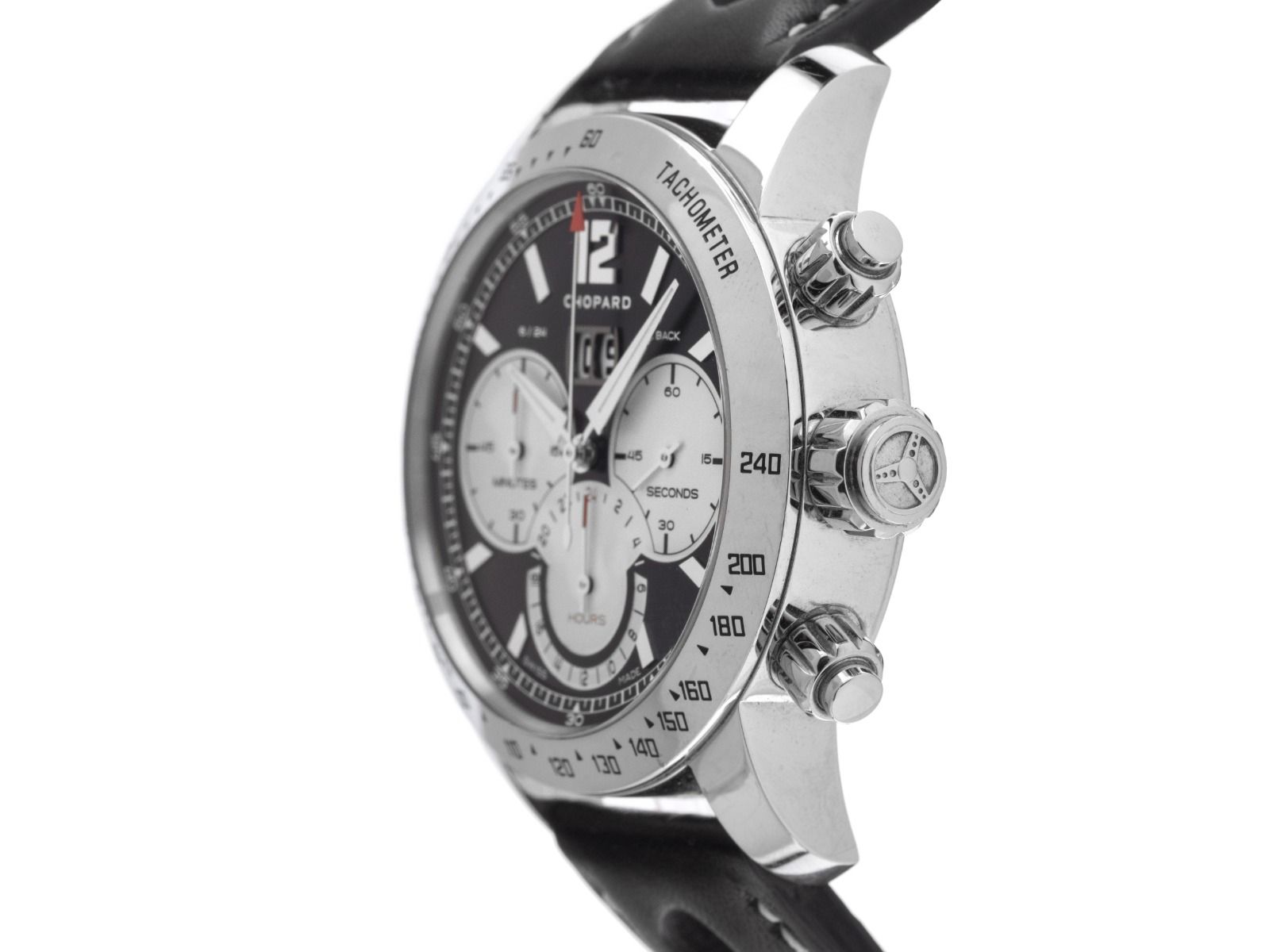 Gehäuse Edelstahl poliert, Gehäusedurchmesser ohne Krone 43mm, Gehäusehöhe 15,1mm. Lünette Edelstahl poliert mit Tachymeter-Skala. Armband Leder schwarz mit heller Ziernaht, Anstoßbreite 21mm, Sicherheitsfaltschließe Edelstahl mit Hersteller-Logo. Zifferblatt schwarz matt mit arabischen Ziffern und Indexen sowie polierten Edelstahl Zeigern. Uhrwerk Automatik, Chopard Manufakturkaliber 2892A1 mit 49 Edelsteinen, Chronograph, COSC Chronometer mit Zeugnis. Anzeige von Stunde und Minute über Zeiger aus der Mitte, kleine Sekunde mit Sekundenstopp zur sekundengenauen Einstellung der Uhrzeit bei 3 Uhr, Datumsanzeige mit Schnellverstellung bei 12 Uhr. Saphirglas kratzfest. Krone verschraubt mit Hersteller-Logo. Boden Edelstahl 8-fach verschraubt und graviert. Gewicht der Uhr inklusive Armband 125g. Referenznummer: 16/8998, Gehäusenummer: 1107XXX, ID: P174484001025H-8900, Artikelnummer: 10000082687. Original Chopard Box mit Umkarton und Garantie Papiere von August 2006, Beschreibung sowie Watchregister Auszug von Oktober 2025, The Watch Register Zertifikat / ohne Eintrag (Internationale Datenbank für verlorene oder gestohlene Uhren), Full Set. Limitiert auf 1000 Exemplare. Wie Neu. Lieferzeit sofort.