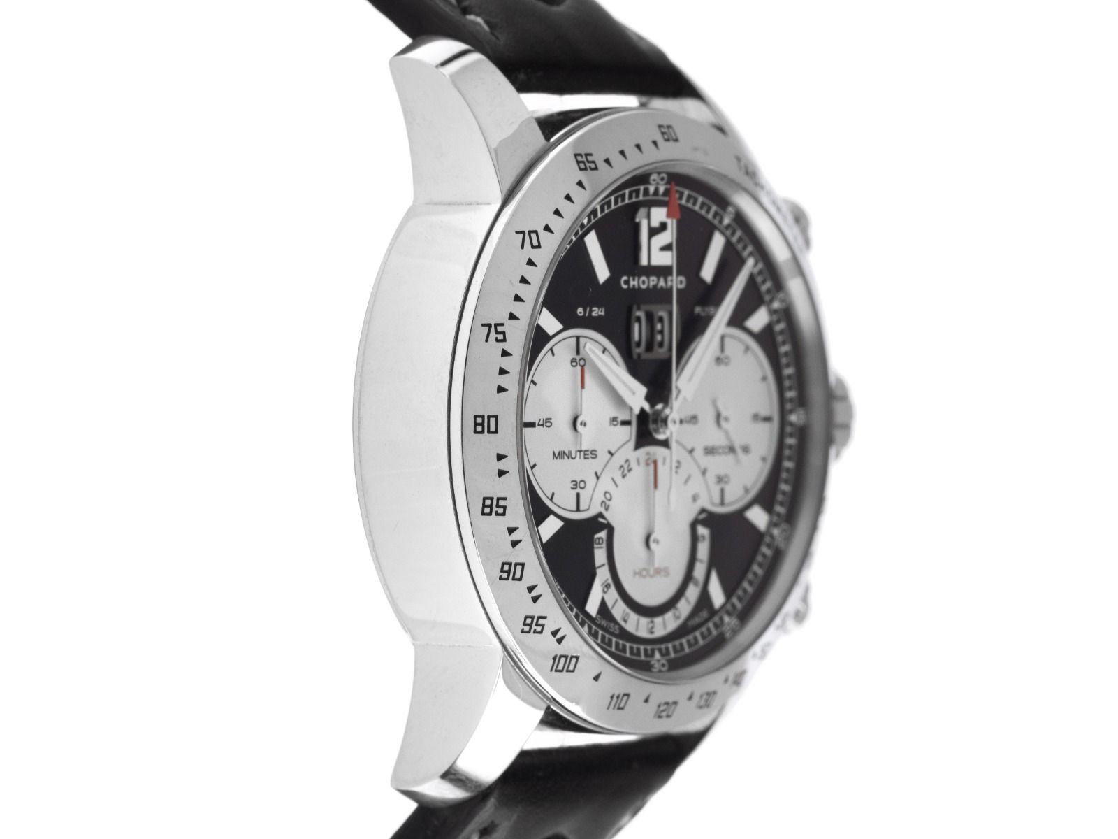 Gehäuse Edelstahl poliert, Gehäusedurchmesser ohne Krone 43mm, Gehäusehöhe 15,1mm. Lünette Edelstahl poliert mit Tachymeter-Skala. Armband Leder schwarz mit heller Ziernaht, Anstoßbreite 21mm, Sicherheitsfaltschließe Edelstahl mit Hersteller-Logo. Zifferblatt schwarz matt mit arabischen Ziffern und Indexen sowie polierten Edelstahl Zeigern. Uhrwerk Automatik, Chronograph, COSC Chronometer mit Zeugnis, 37 Edelsteine. Anzeige von Stunde und Minute über Zeiger aus der Mitte, kleine Sekunde mit Sekundenstopp zur sekundengenauen Einstellung der Uhrzeit bei 3 Uhr, Datumsanzeige mit Schnellverstellung bei 12 Uhr. Saphirglas kratzfest. Krone verschraubt mit Hersteller-Logo. Boden Edelstahl 8-fach verschraubt und graviert. Gewicht der Uhr inklusive Armband 125g. Referenznummer: 16/8998, Gehäusenummer: 1107XXX, ID: P174484001025H-8900, Artikelnummer: 10000082687. Original Chopard Box mit Umkarton und Garantie Papiere von August 2006, Beschreibung sowie Watchregister Auszug von Oktober 2025, The Watch Register Zertifikat / ohne Eintrag (Internationale Datenbank für verlorene oder gestohlene Uhren), Full Set. Limitiert auf 1000 Exemplare. Wie Neu. Lieferzeit sofort.