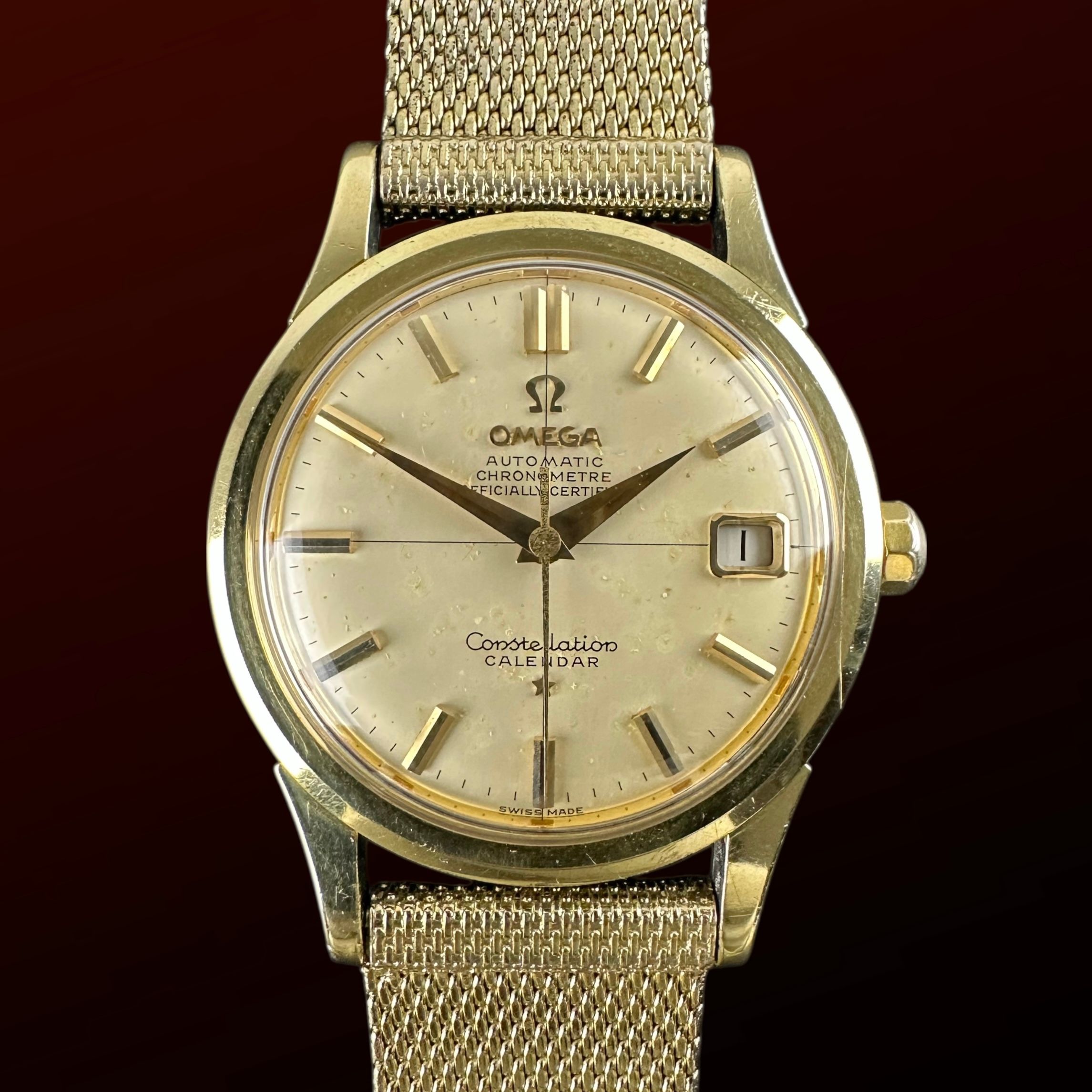 This vintage Omega Constellation Calendar, produced in 1958, is among the first Constellation production models. It features a white dial with light patina speckles and golden accents, housed in a 35mm wide gold-plated case. The watch is paired with a gold-plated, mesh bracelet that complements it perfectly. For those who prefer a different style, a black calf leather strap is also included.