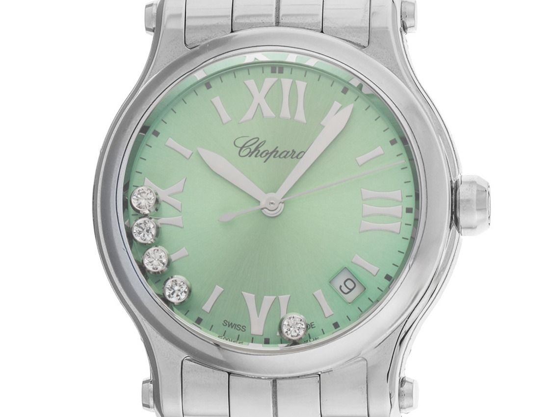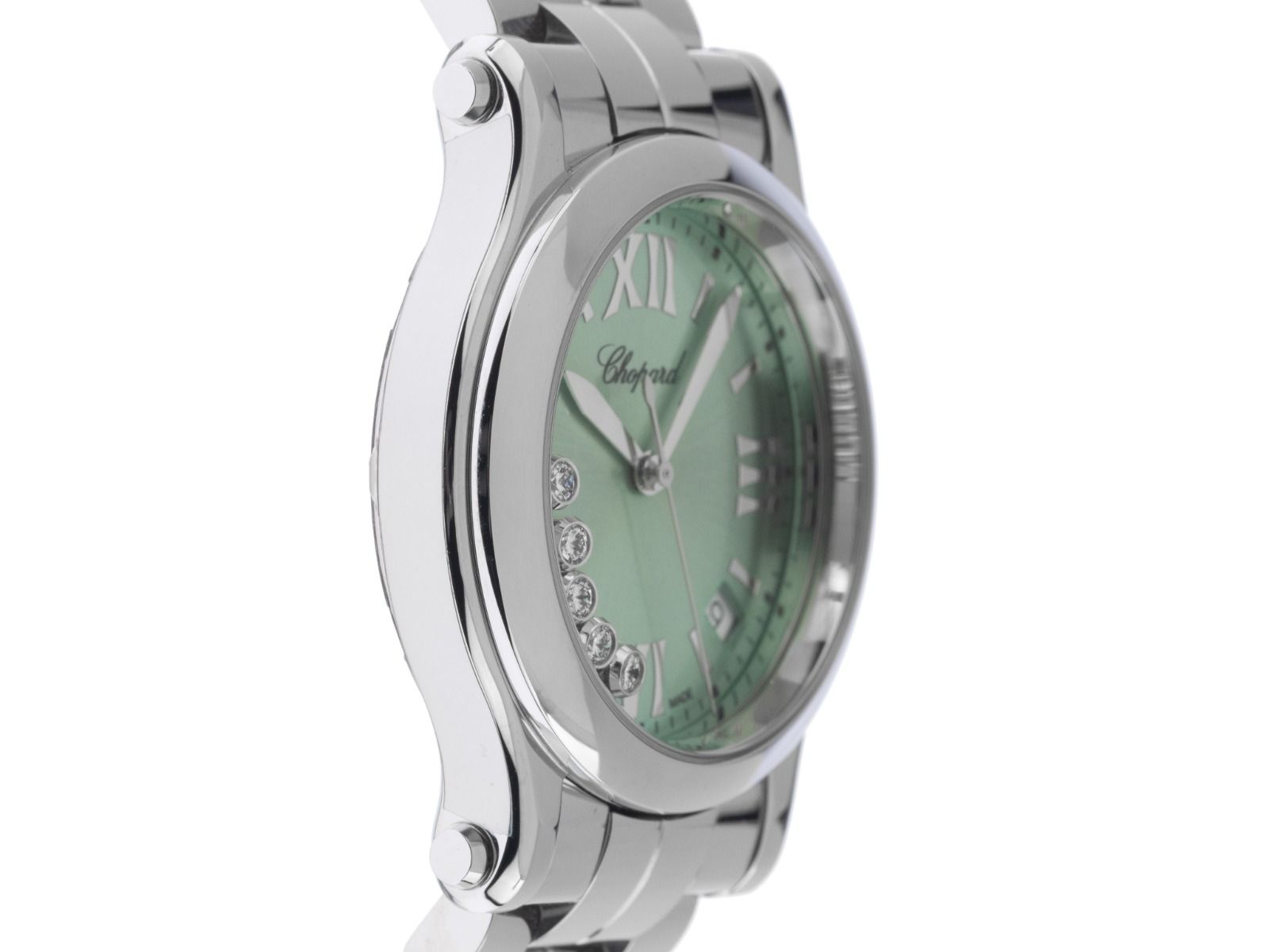Gehäuse Edelstahl poliert, Gehäusedurchmesser ohne Krone 36mm, Gehäusehöhe 10,4mm. Lünette Edelstahl glatt und poliert. Armband Edelstahl poliert, Doppelfaltschließe Edelstahl. Zifferblatt grün mit 5 beweglichen Brillanten, aufgesetzten römischen Edelstahl Ziffern, Indexen und Edelstahl Zeigern. Uhrwerk quarzgesteuert, Kaliber ETA 955.112. Anzeige von Stunde, Minute und Sekunde über Zeiger aus der Mitte mit Sekundenstopp zur sekundengenaeun Einstellung der Uhrzeit, Datumsanzeige mit Schnellverstellung zwischen 4 und 5 Uhr. Saphirglas kratzfest. Krone mit grünem Tsavorit ca. 0,10ct. Boden Edelstahl 6-fach verschraubt und graviert. Gewicht der Uhr inklusive Armband 113g, Länge des Armbandes inklusive Gehäuse 170mm. Wasserdicht bis 3 ATM. Referenznummer: 278582-3011, ID: ST1160111561025H-8370, Artikelnummer: 10000082749. Original Chopard Box und Garantie Papiere von Oktober 2025 sowie Beschreibung, Full Set. Ungetragen. Lieferzeit sofort.