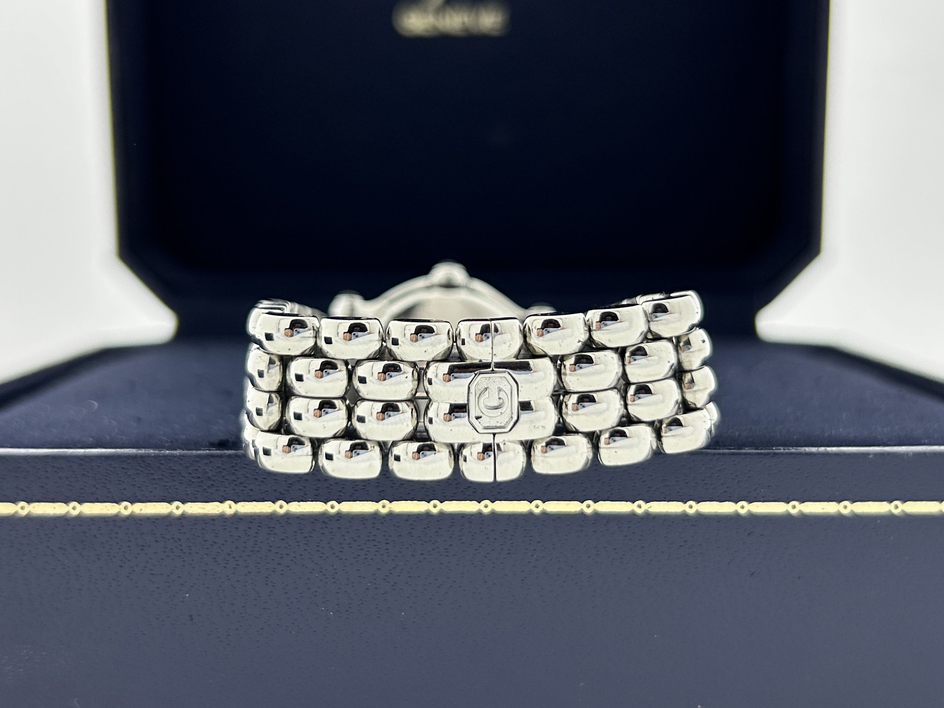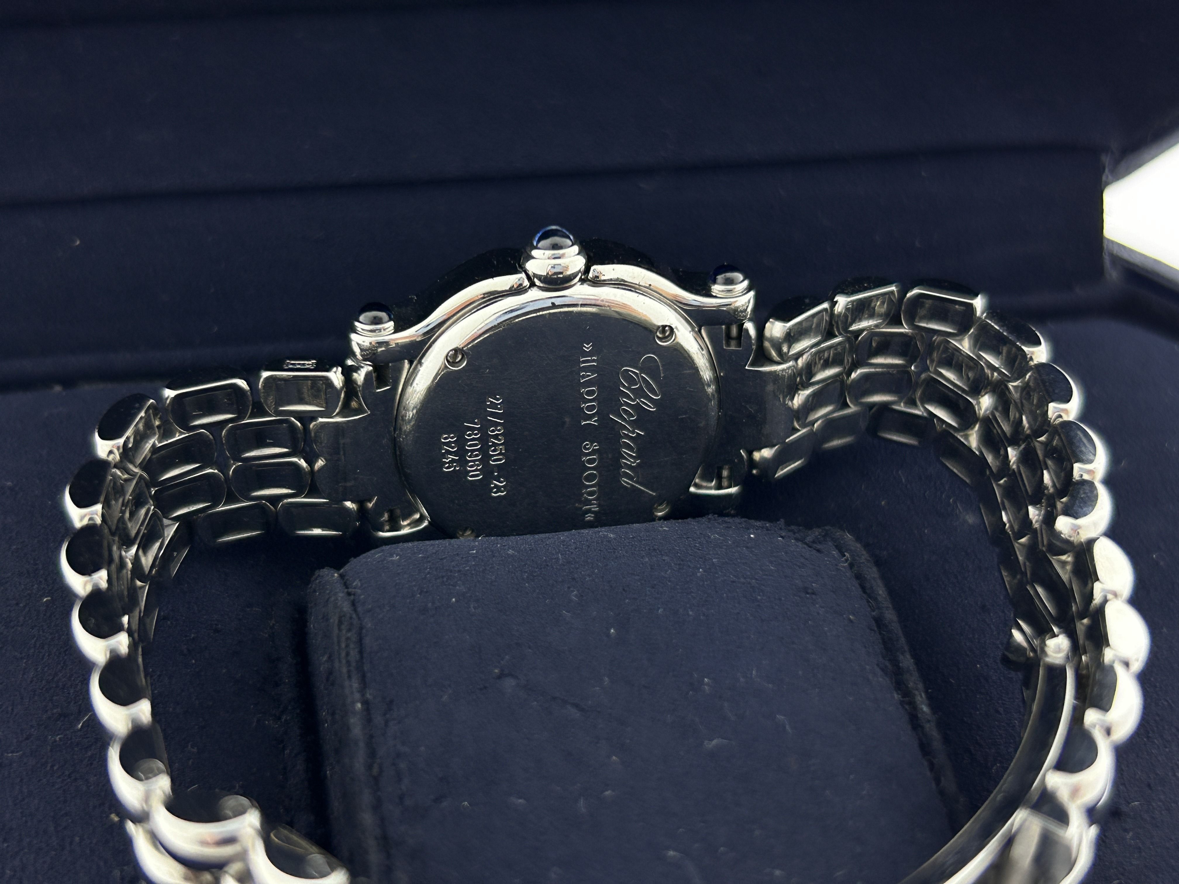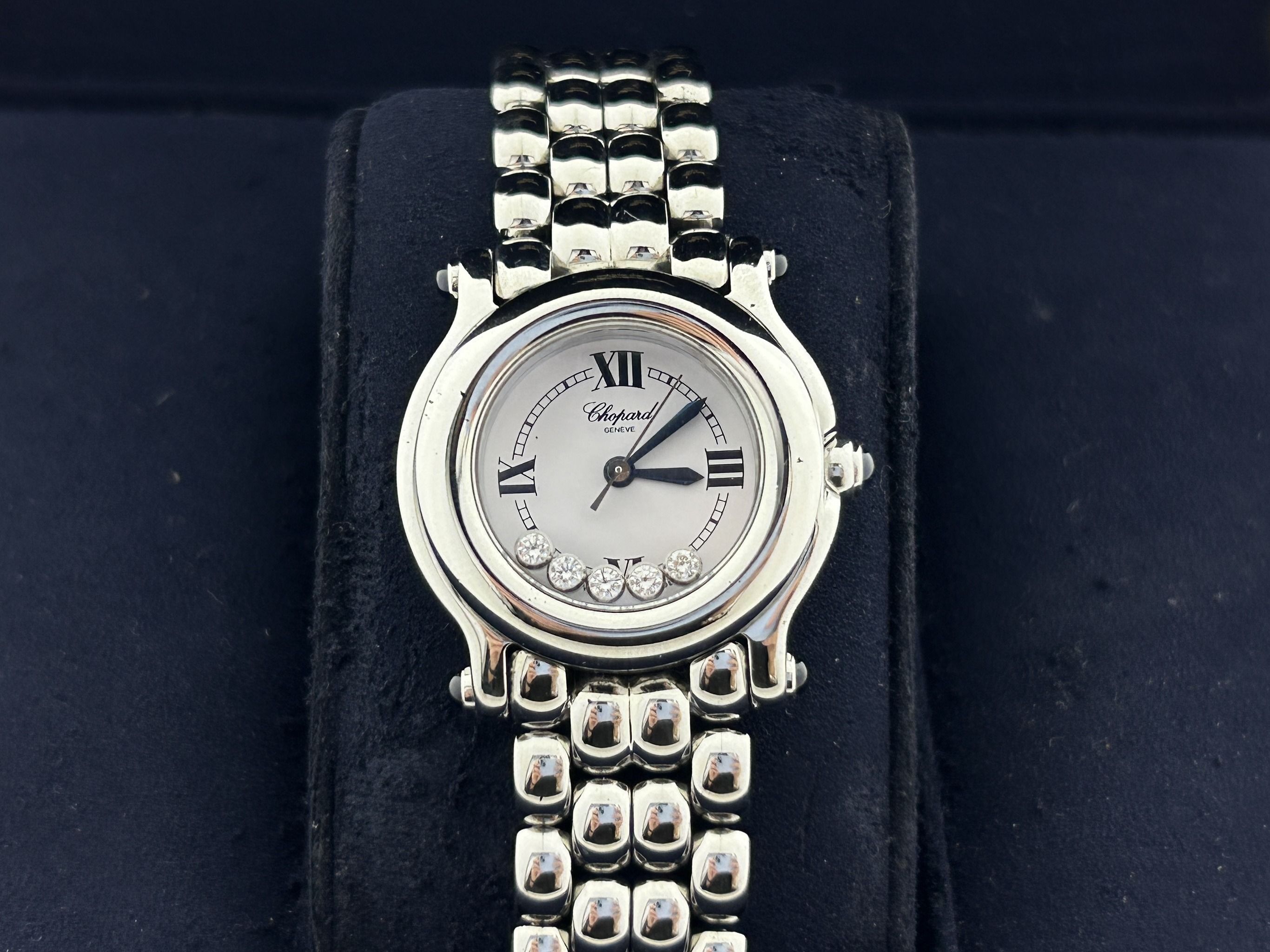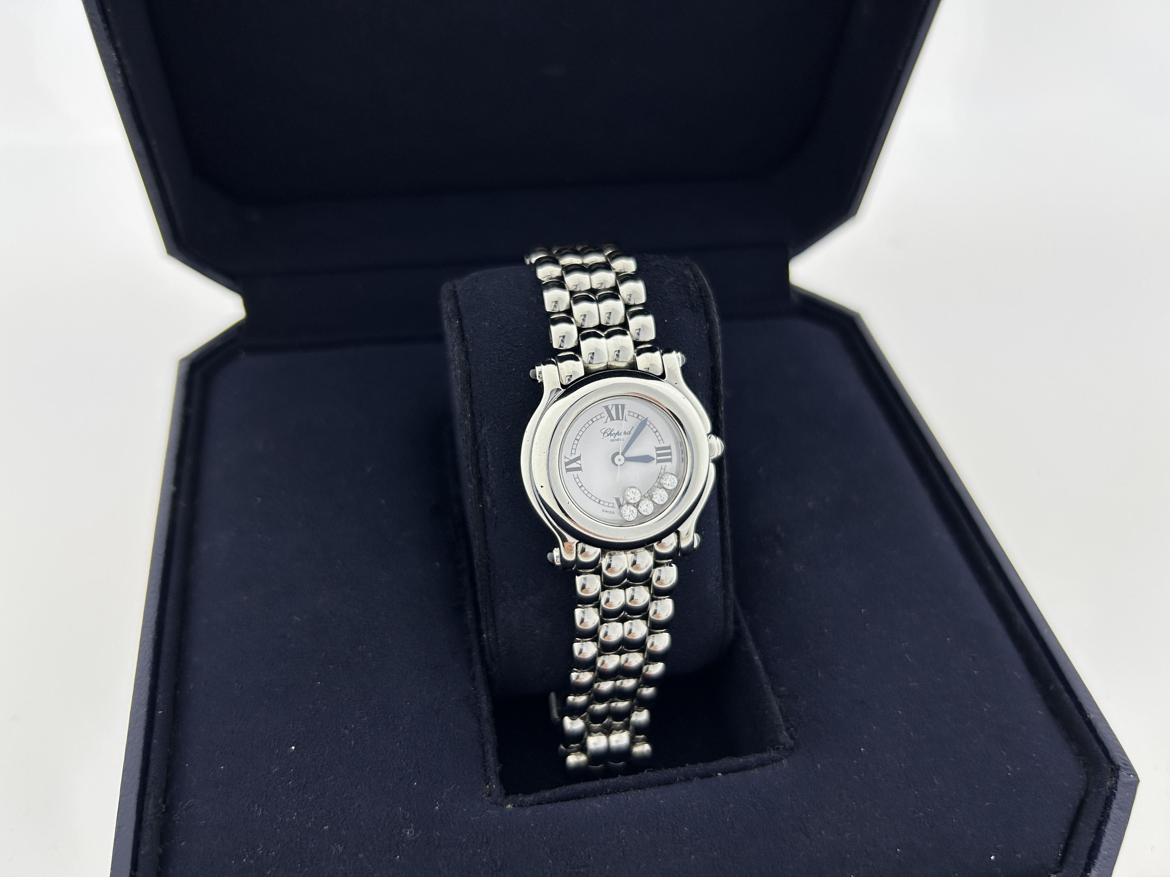 A Chopard Happy Sport, ref. 27/8250-23. The Chopard has a steel 26mm case with the original steel Chopard bracelet. The watch has a white dial with Roman numerals and 5 moving/dancing, brilliant cut diamonds. The watch comes with its original box.