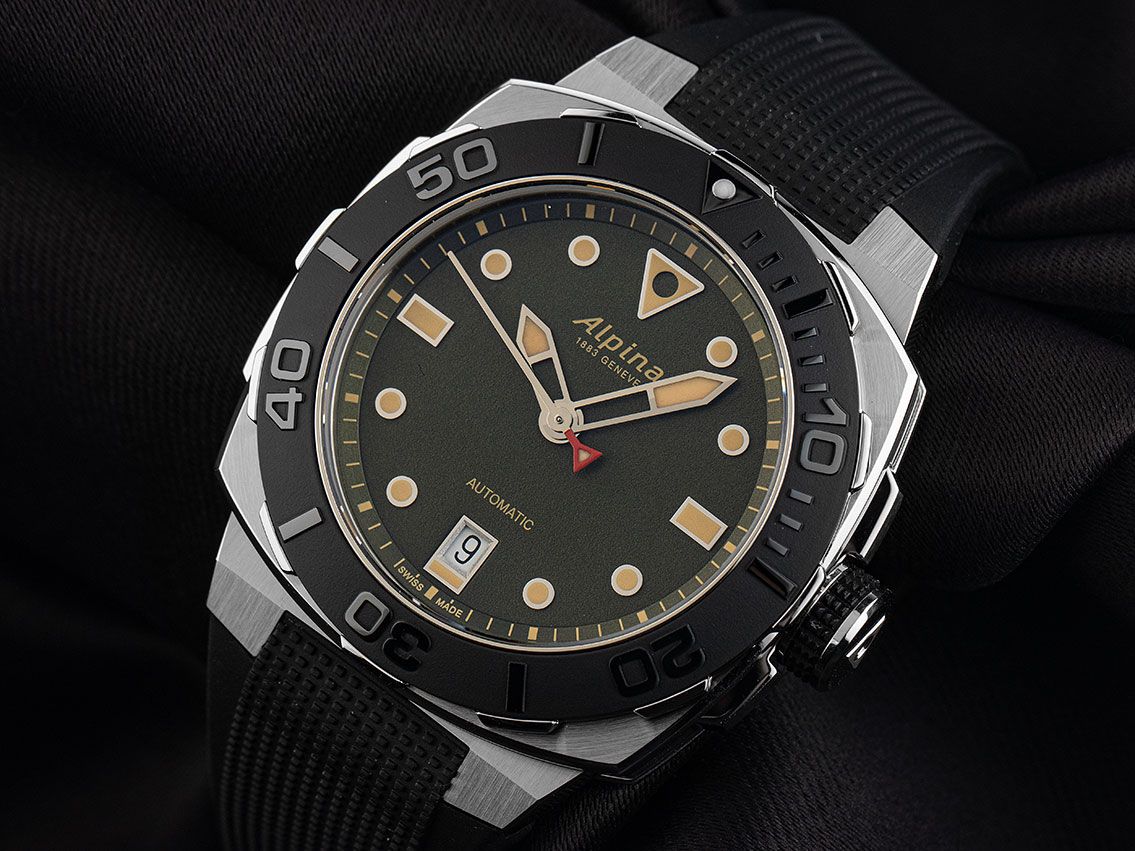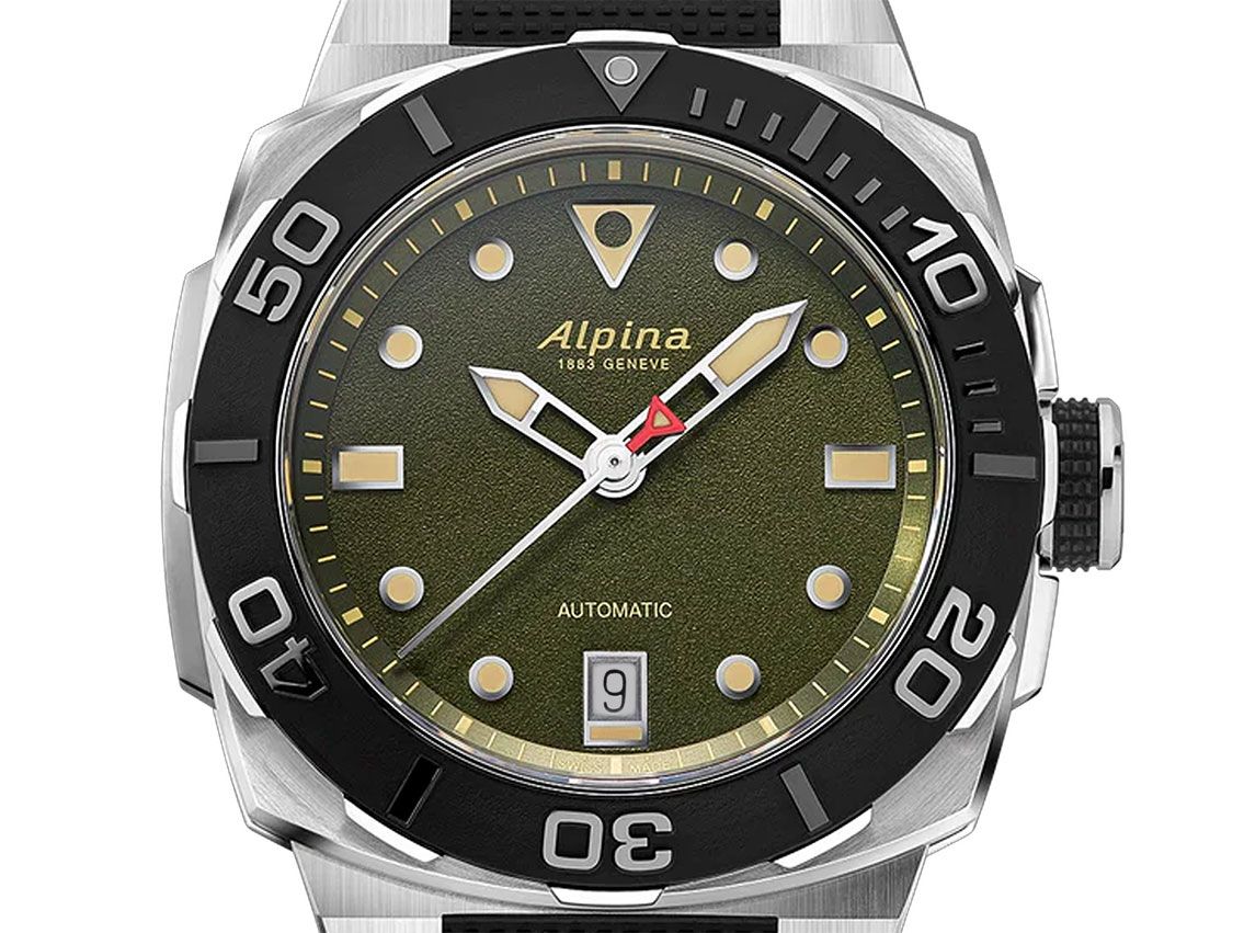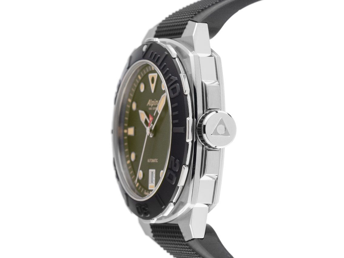 Gehäuse Edelstahl poliert und satiniert, Gehäusemaße ohne Krone (L x B x H) 40,5 x 39 x 12,0mm. Lünette Edelstahl mit schwarzem Inlay und 60-Minuten Skala, einseitig drehbar. Armband Kautschuk schwarz, Anstoßbreite 21mm, Sicherheitsfaltschließe Edelstahl mit Hersteller-Logo. Zifferblatt grün matt mit aufgesetzten Edelstahl Leuchtindexen und Edelstahl Leuchtzeigern. Uhrwerk Automatik, Kaliber Alpina AL-525 mit 26 Edelsteinen, Gangreserve ca. 38 Stunden. Anzeige von Stunde, Minute und Sekunde über Zeiger aus der Mitte mit Sekundenstopp zur sekundengenauen Einstellung der Uhrzeit, Datumsanzeige mit Schnellverstellung bei 6 Uhr. Saphirglas kratzfest. Krone verschraubbar mit Hersteller-Logo. Boden Edelstahl 6-fach verschraubt und graviert. Gewicht der Uhr inklusive Armband 121g. Wasserdicht bis 30 ATM. Referenznummer: AL-525K3VE6, ID: ST254619961025H-1995, Artikelnummer: 10000082755. Original Alpina Box mit Umkarton und Garantie Papiere sowie Beschreibung, Full Set. Neu. Lieferzeit sofort.