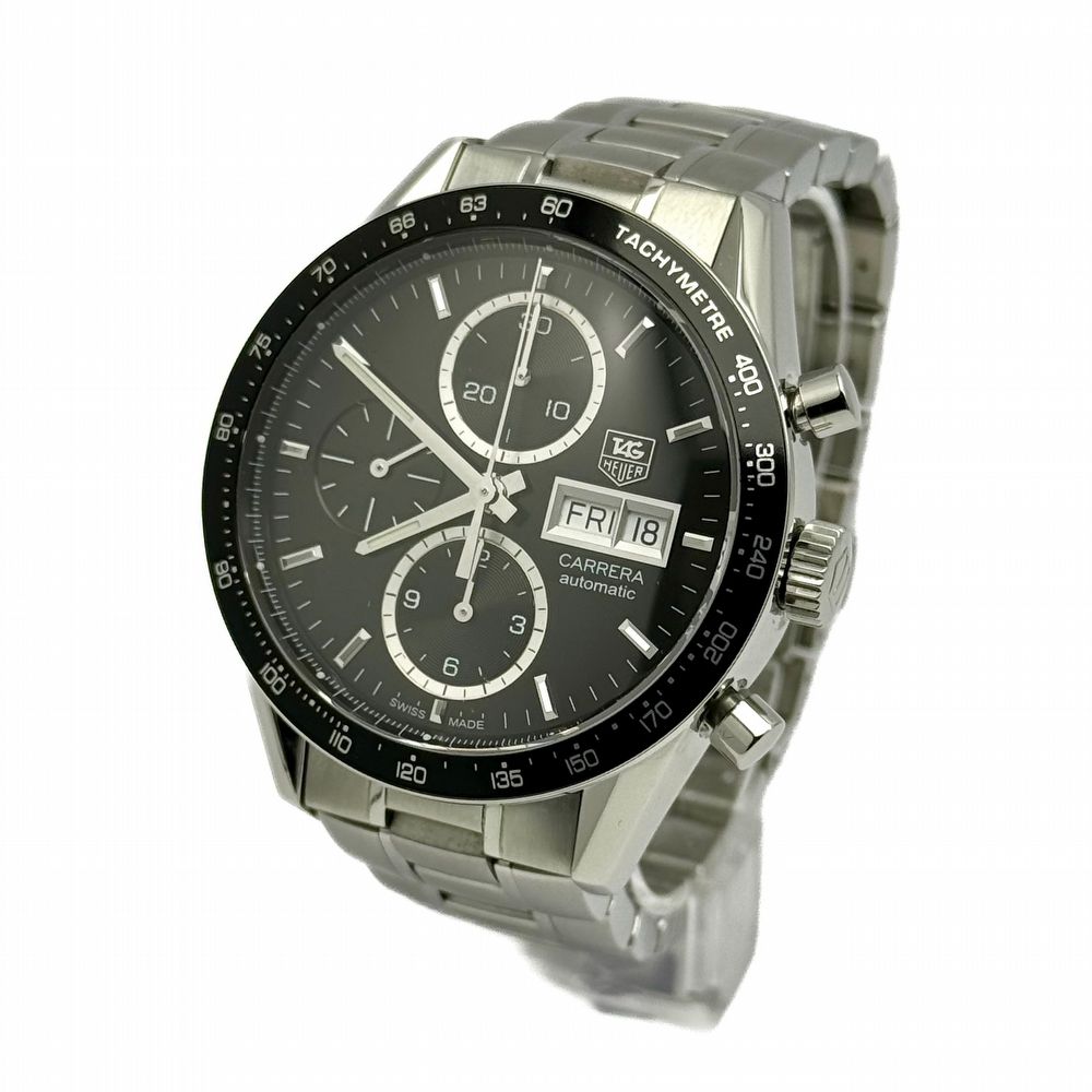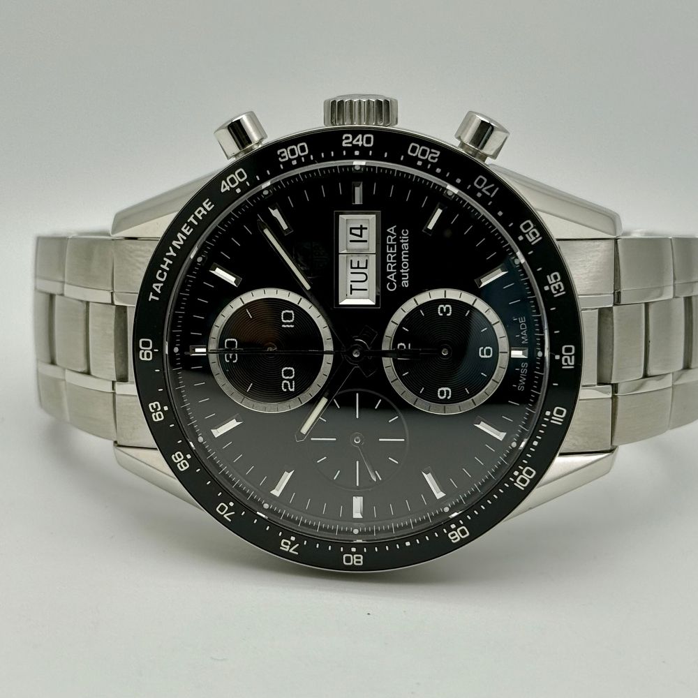 The TAG Heuer Carrera, reference CV201AG, features a 41 mm stainless steel case with a striking silver sunburst dial and contrasting anthracite subdials, giving the watch a dynamic and sophisticated appearance. Powered by the TAG Heuer caliber 16 automatic chronograph movement (based on the Valjoux 7750, with 25 jewels, a 42-hour power reserve, and a frequency of 28,800 vph), it delivers chronograph functions with central seconds, 30-minute and 12-hour counters, as well as a date display at 3 o’clock.