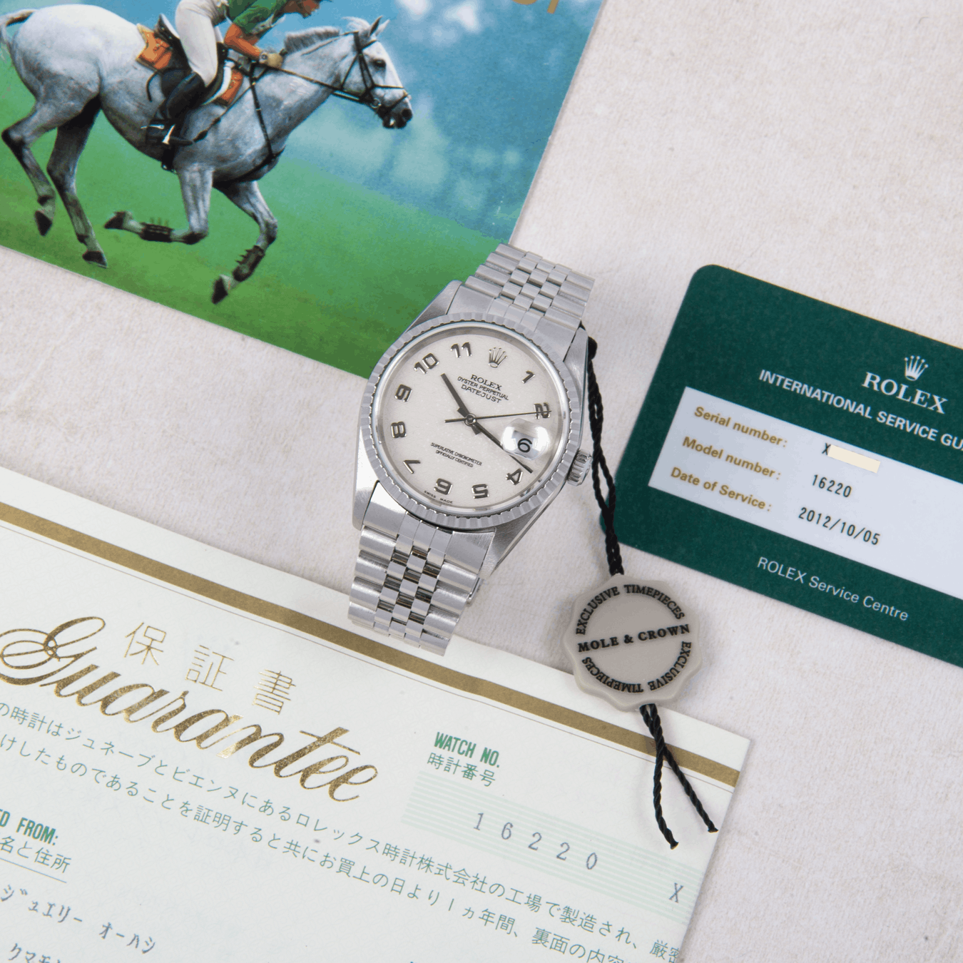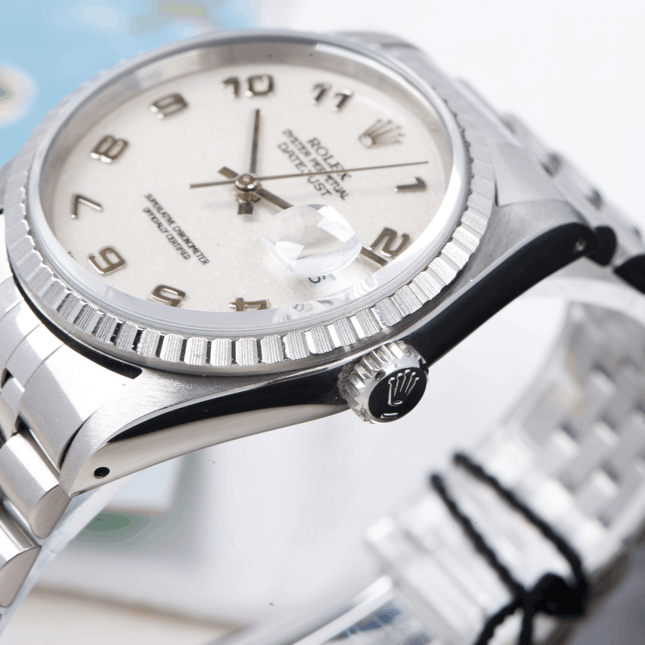 Original Rolex Oyster Perpetual Datejust 16220 Ivory Arabic Jubilee Dial from 1991. The Rolex Datejust, first introduced in 1945, is a true icon. This model features a classic Ivory Arabic Jubilee Dial, paired with a stainless steel case and a Engine-turned bezel. The dial displays the inscription: "Rolex Oyster Perpetual Datejust Superlative Chronometer Officially Certified" and the T Swiss T marking, indicating the use of tritium in the original 18K white gold hands and hour markers.