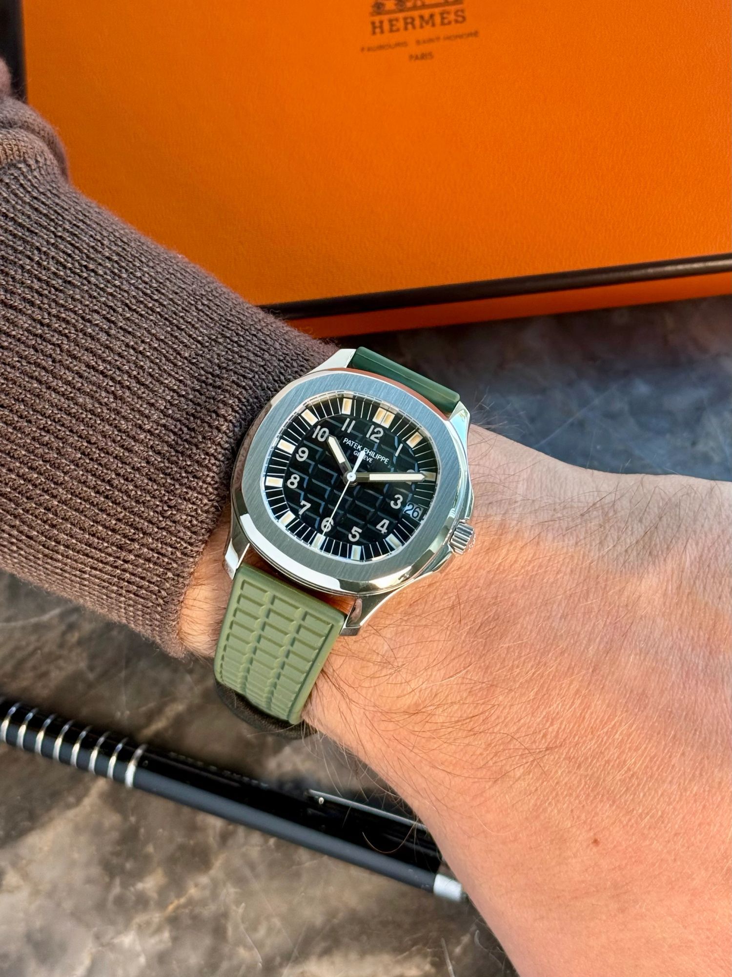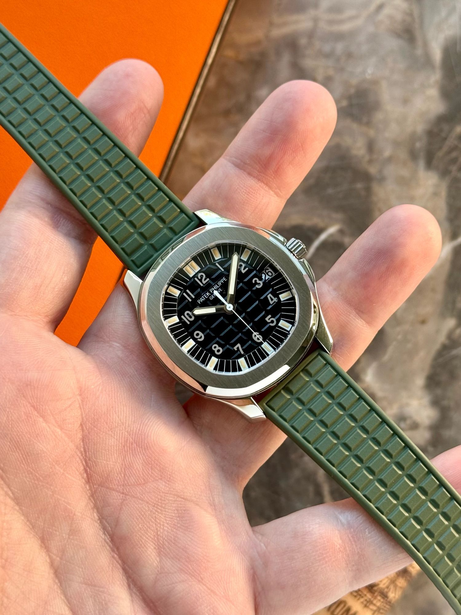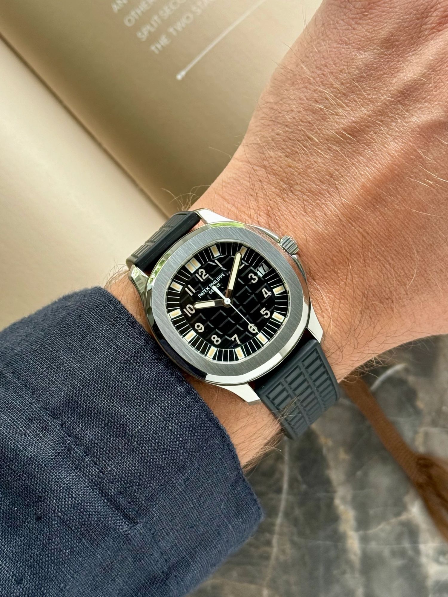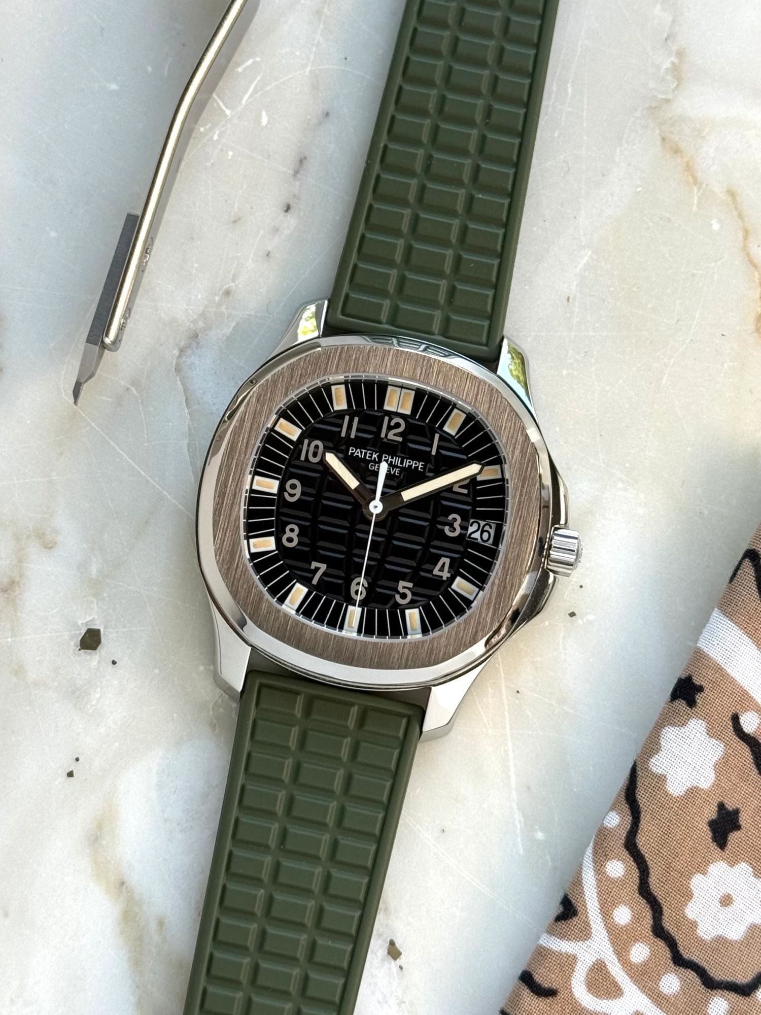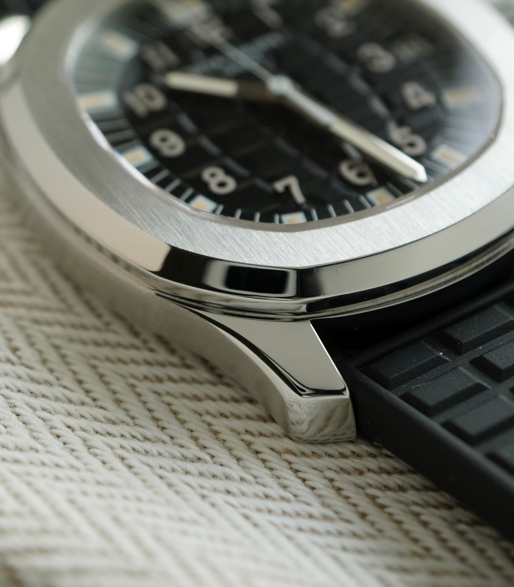 If you take a close look at the dial, you see the beautiful warm colored tritium hands, the semi-glossy dial with the iconic Aquanaut pattern, which is perfectly integrated with the profile of the rubber strap. This all completes the sporty, luxurious and vintage look of this Patek Philippe.