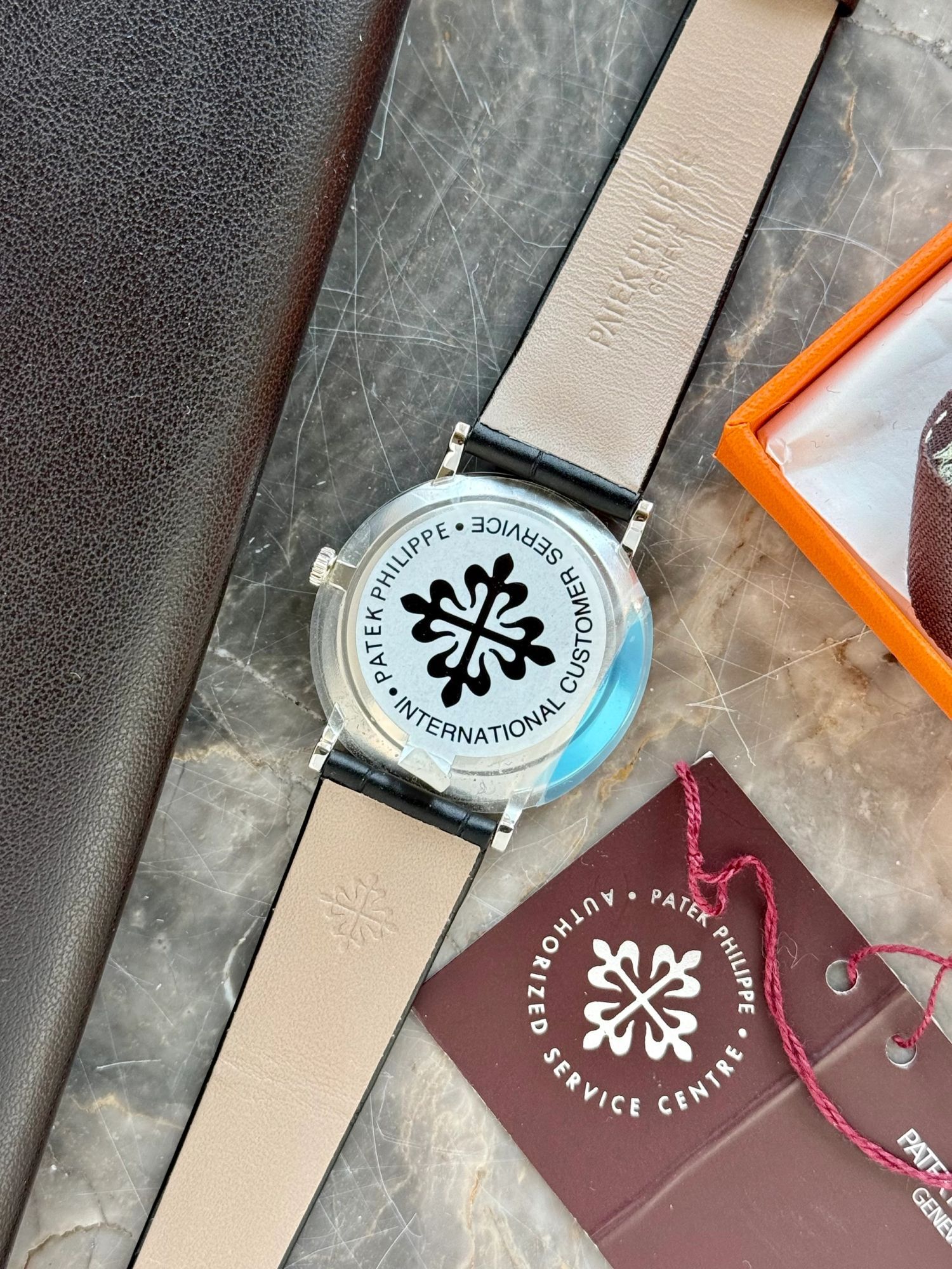 This rare and beautiful Patek Philippe Calatrava with the reference 3919G and original BEYER signature on the dial in 18k white gold is in excellent condition. The movement was fully serviced by Patek Philippe and comes with their warranty. The watch is fitted with a ‘Clous de Paris’ bezel and a dial called ‘fond blanc porcelaine’. Inside the watch is the Patek hand-wound calibre 215PS with small seconds. Fitted to the case is a brand new Patek Philippe leather strap with the original Patek pin buckle in 18k white gold. The case measures 33.2 mm and has a height of 6 mm. The watch comes with a leather service pouch.