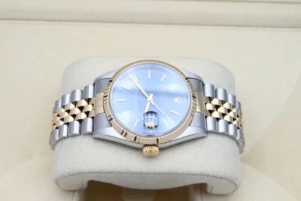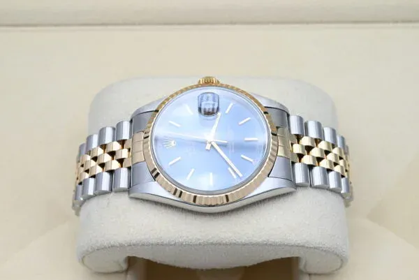 Rolex Datejust Ref. 16233 from 1998 with the blue dial in excellent condition, including the original box and papers.All of our watches have been thoroughly checked by our own watchmaker and serviced when needed.