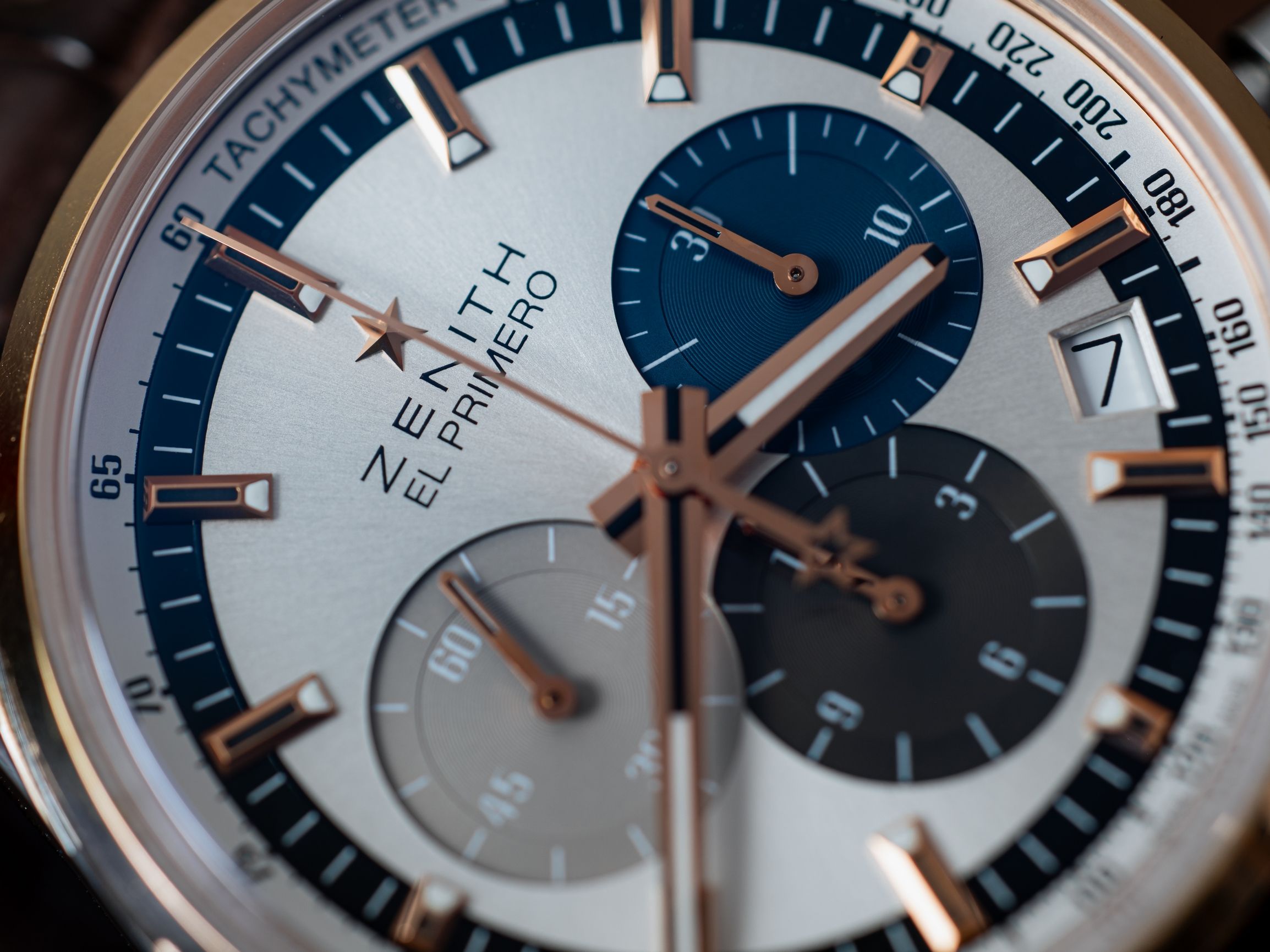 Crafted in stainless steel with rose gold accents, this version features the iconic “Tricolore” dial – a combination of grey, black, and blue sub-dials that has become a design signature of the El Primero line.