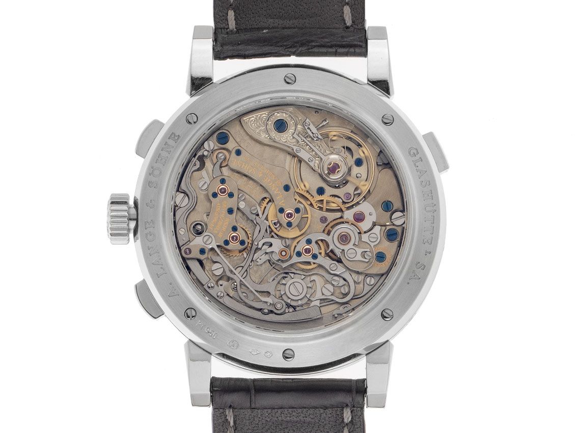 Gehäuse 950 Platin poliert und satiniert, Gehäusedurchmesser ohne Krone 41mm, Gehäusehöhe 14,1mm. Lünette 950 Platin poliert. Armband Leder schwarz mit Ziernaht, Anstoßbreite 20mm, Faltschließe 950 Platin mit Hersteller-Logo. Zifferblatt silberfarben mit römischen Ziffern, Indexen und polierten Zeigern. Uhrwerk Handaufzug, Chronograph Flyback, A. Lange & Söhne Manufakturkaliber 952.1 mit 45 Edelsteinen, Werknummer: 53XXX. Anzeige von Stunde und Minute über Zeiger aus der Mitte, kleine Sekunde mit Sekundenstopp zur sekundengenauen Einstellung der Uhrzeit bei 8 Uhr, Großdatumsanzeige bei 12 Uhr, Drücker zur Datumseinstellung bei 10 Uhr, Wochentagsanzeige in Englisch bei 8 Uhr, Monatsanzeige in Englisch bei 4 Uhr, Mondphasenanzeige bei 6 Uhr, Tag- und Nachtanzeige bei 9 Uhr, Schaltjahranzeige bei 4 Uhr. Saphirglas kratzfest. Krone mit Hersteller-Logo. Boden 950 Platin 6-fach verschraubt und graviert mit Saphirglas Sichtfenster. Gewicht der Uhr inklusive Armband 175g. Referenznummer: 410.025 E, ID: KH11911900000624H-138340, Artikelnummer: 10000075077. Original A. Lange & Söhne Box mit Umkarton und Herkunftsnachweis von April/2019 sowie Beschreibung, Service Buch, Wechselband Leder (ohne Schließe), Stellstift, Poliertuch, Service Rechnung von September/2019, inkl. Angabe des Versicherungswertes von A. Lange & Söhne in Höhe von 138.340,-€, Full Set. Kapitalanlage mit Wertsteigerungspotential, extrem seltenes Sammlerstück. Ungetragen, Tresoruhr. Lieferzeit sofort.