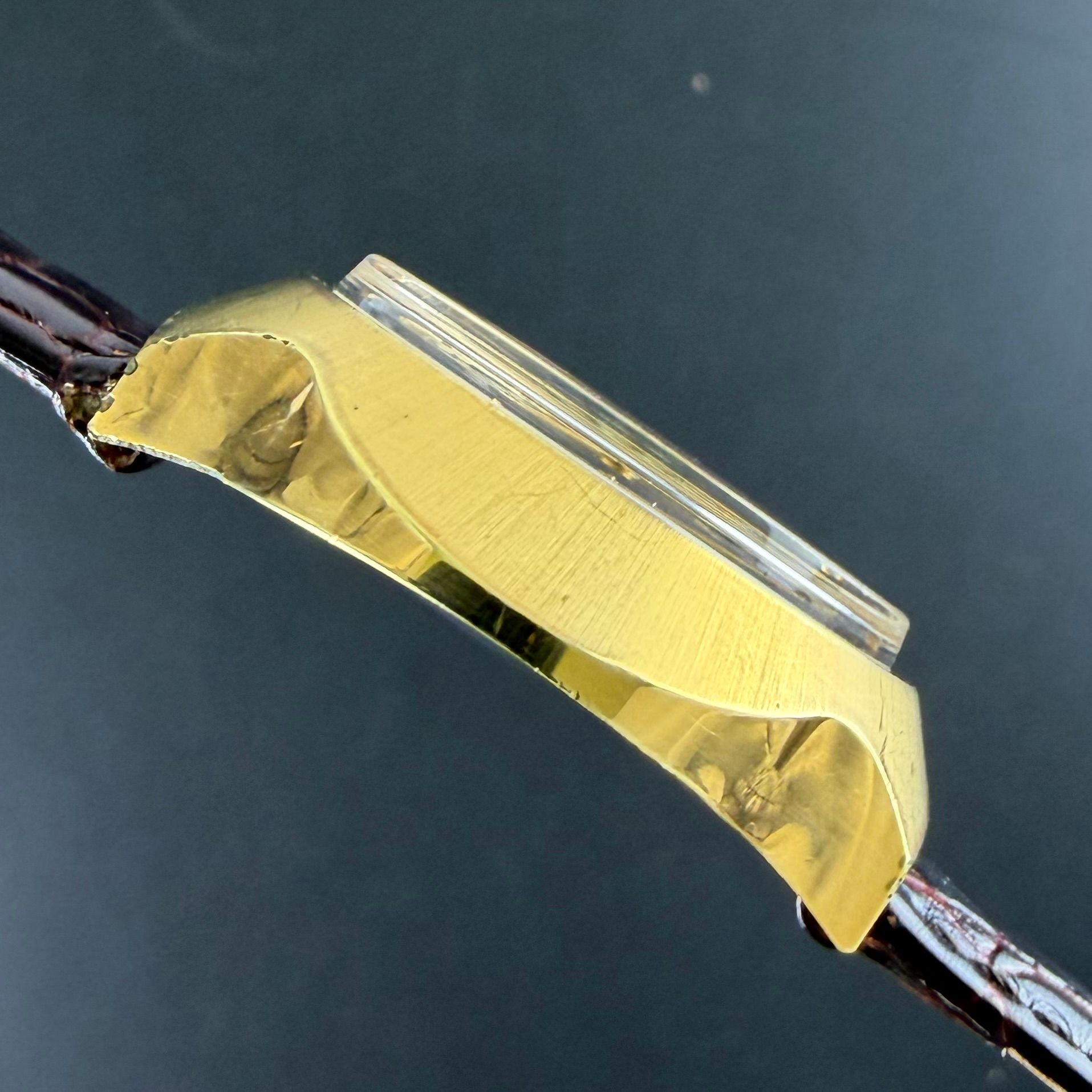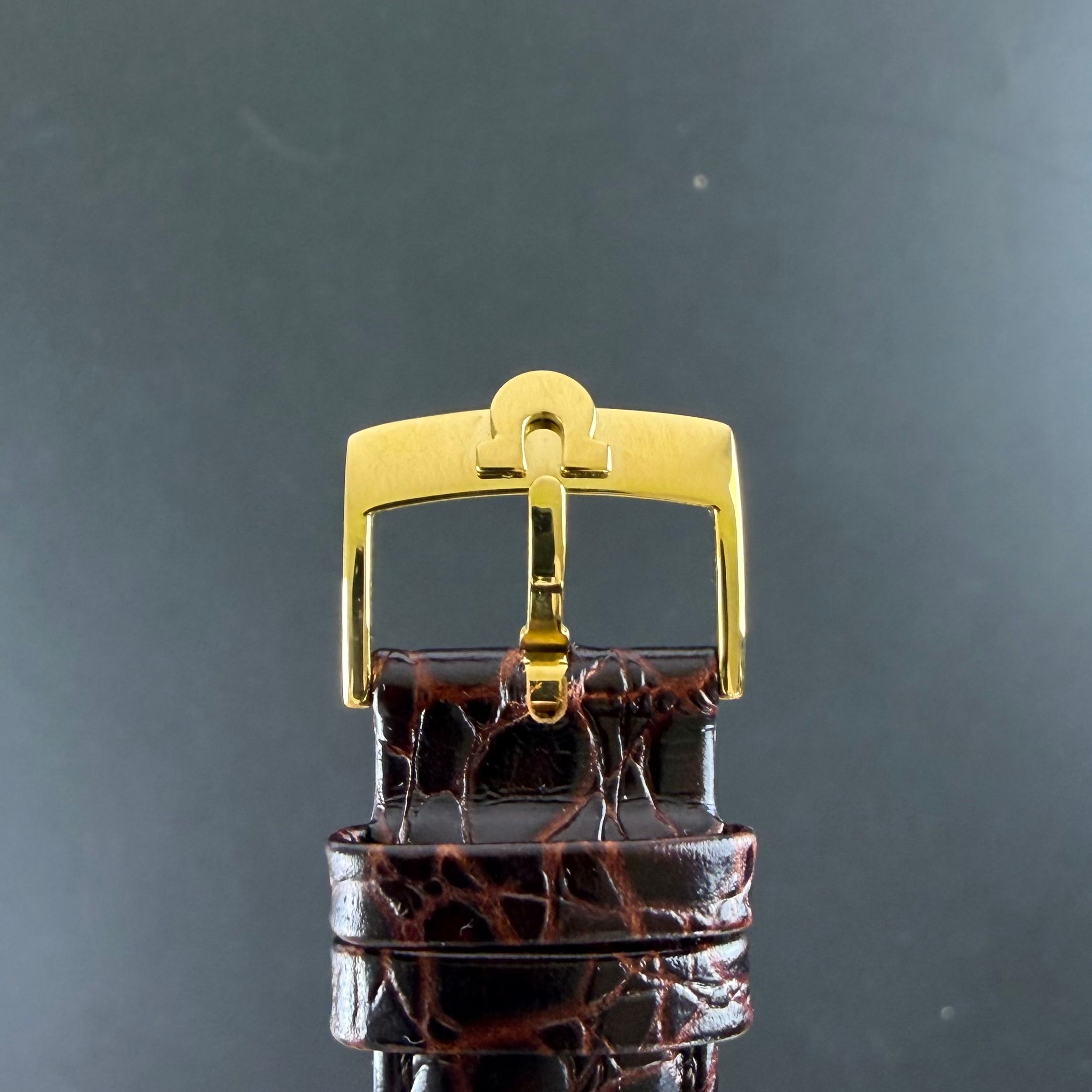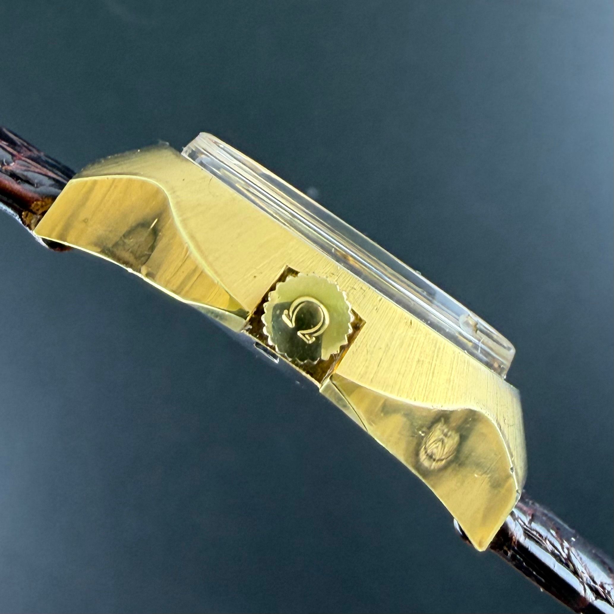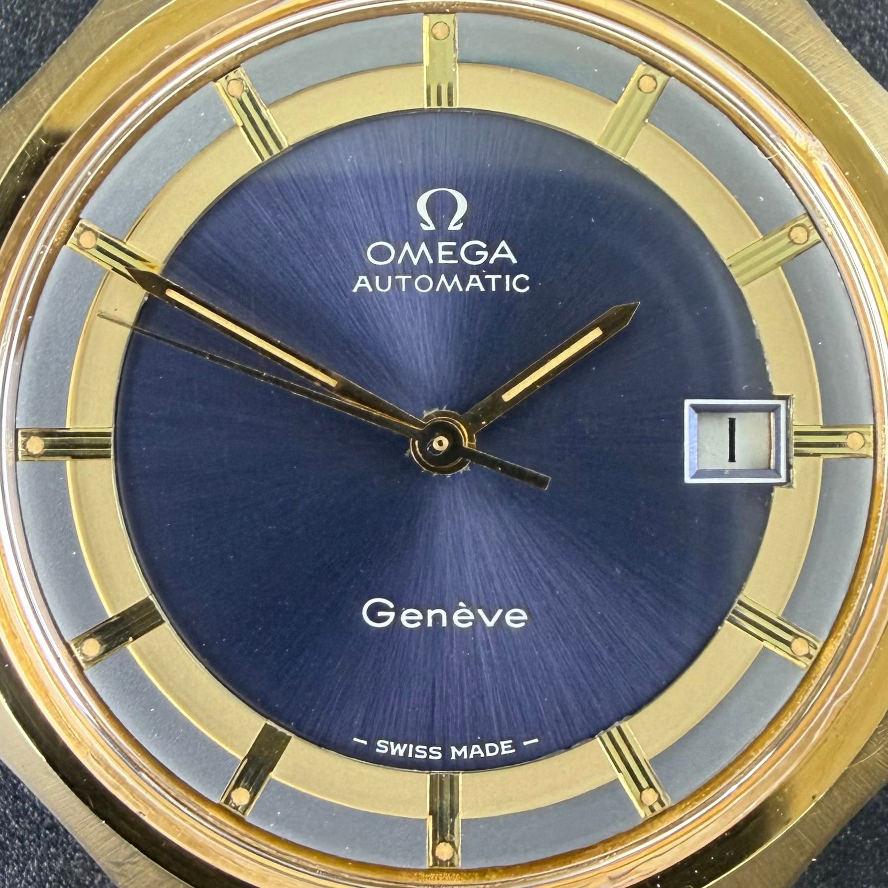 This vintage Omega Genève, nicknamed the Stingray, also known as the Cobra, is a jumbo-sized watch with an impressive 44mm gold-plated case, retaining much of its original polish. It features a blue dial with gold accents, preserved in excellent condition. Inside beats the caliber 1481 automatic movement, serviced in October 2025 and currently running flawlessly. The watch is paired with a J.A. Willson genuine leather strap in bordeaux brown with a crocodile-grain motif. Uncommon and striking, this Omega Genève is unquestionably a collector’s item.