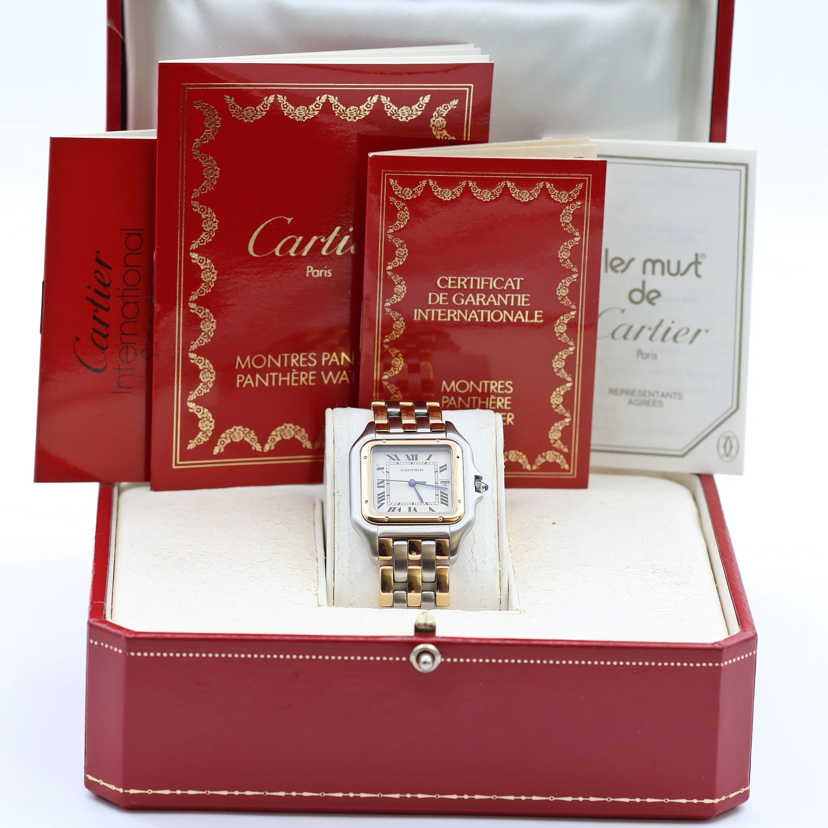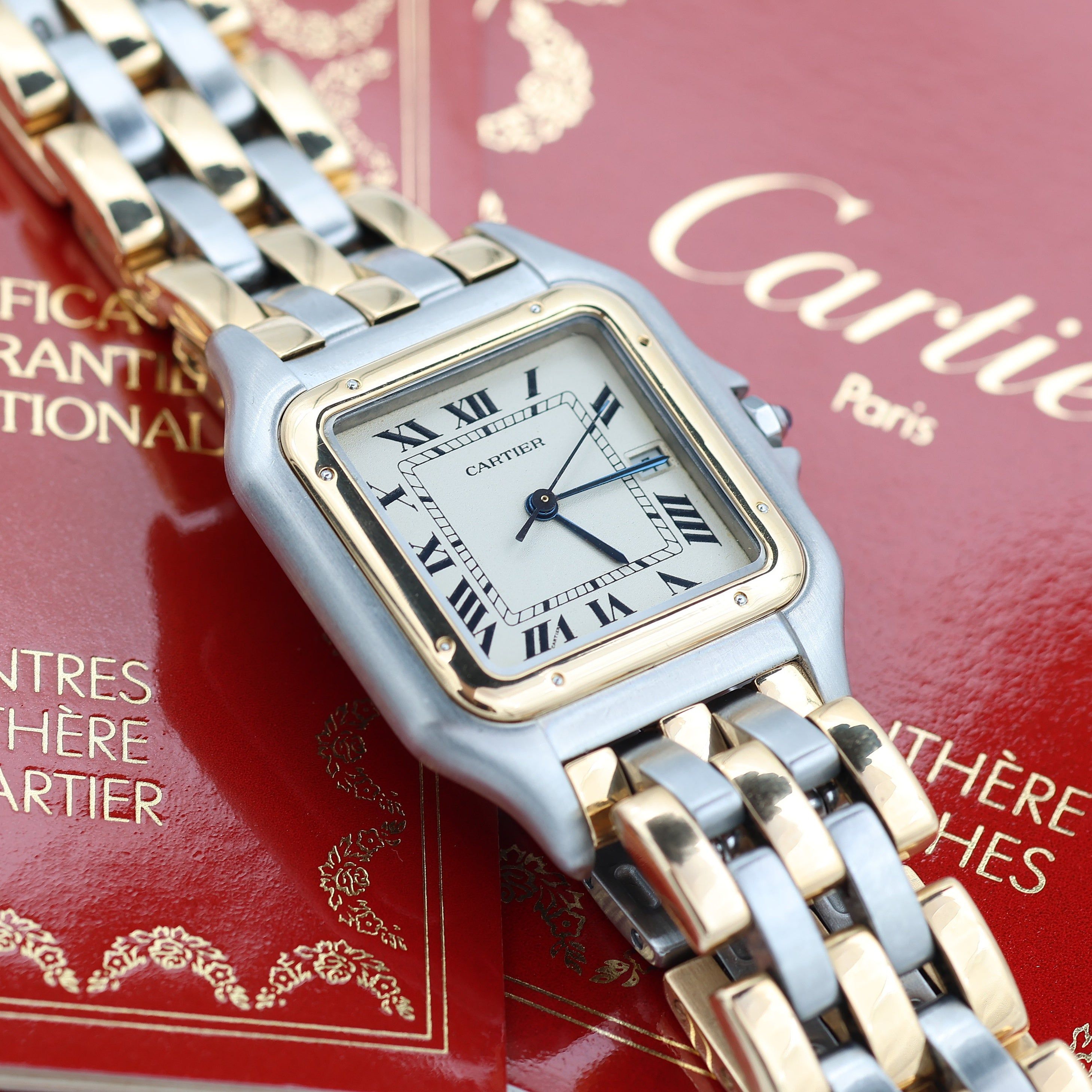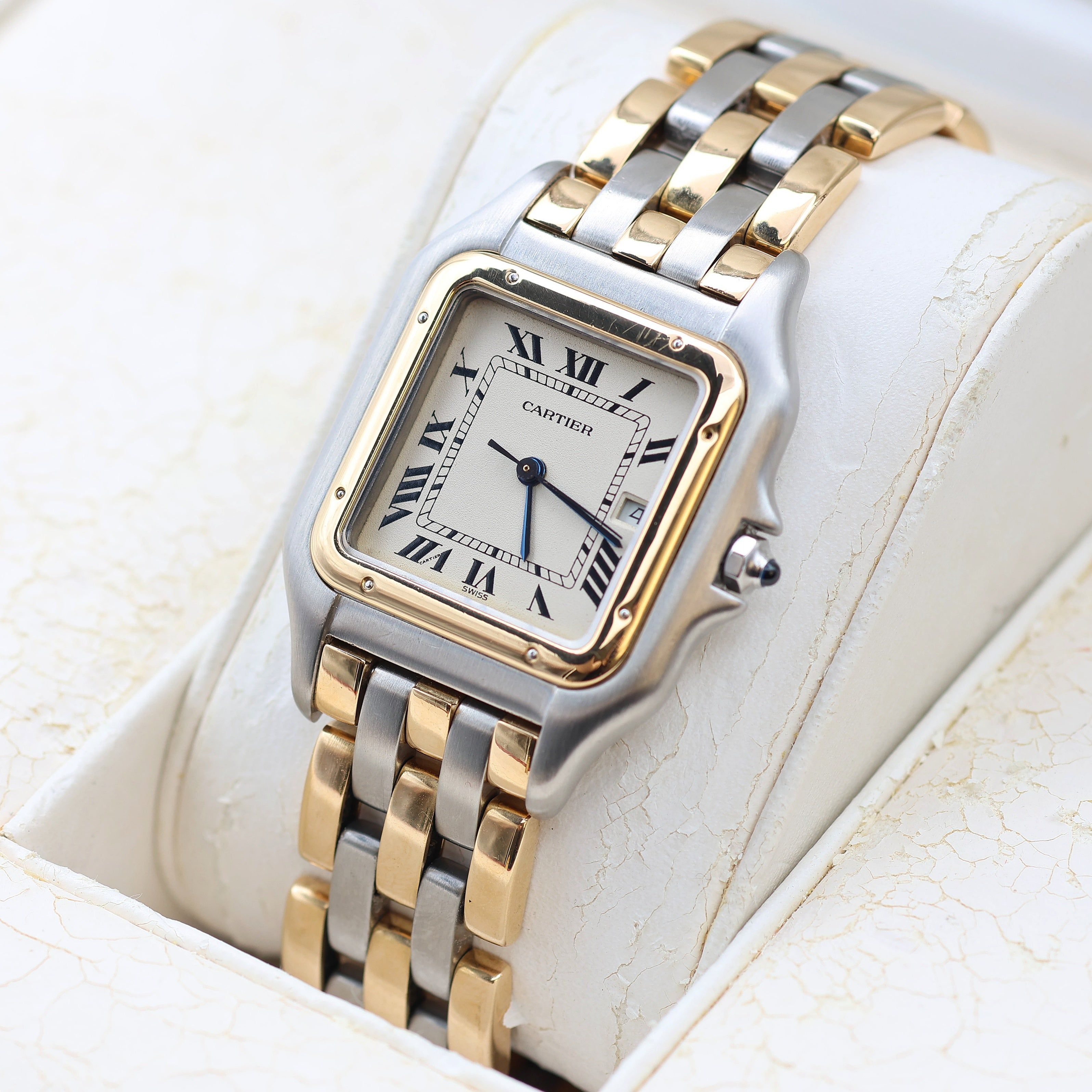 For sale at Debonar Watches: pre-owned Cartier Panthere ref. 187957 from the '90s, in steel and gold 18k, full set. It is a very rare piece with its 3 yellow gold lines. Adorned with a white dial that has roman numerals, this second hand Cartier has a square dial with a yellow gold bezel with secure pins at the end. It also has a stainless steel and 18k yellow gold bracelet, the date window at the third-hour aperture and a quartz movement that adds to the overall look and make sure that this is a functional and stylish piece to own.Extremely elegant and feminine, a Cartier masterpiece!The lenght of the bracelet, including the case of the watch, is 17.5cm. BRAND CARTIER MODEL PANTHERE REFERENCE 187957 CASE MATERIAL STEEL/GOLD MOVEMENT QUARTZ DIMENSION 29 X 40 MM DIAL WHITE BEZEL GOLD CRYSTAL SAPPHIRE BRACELET TYPE BRACELET BRACELET MATERIAL STEEL/GOLD ORIGINAL BOX YES ORIGINAL PAPERS YES YEAR 1990 CONDITION EXCELLENT