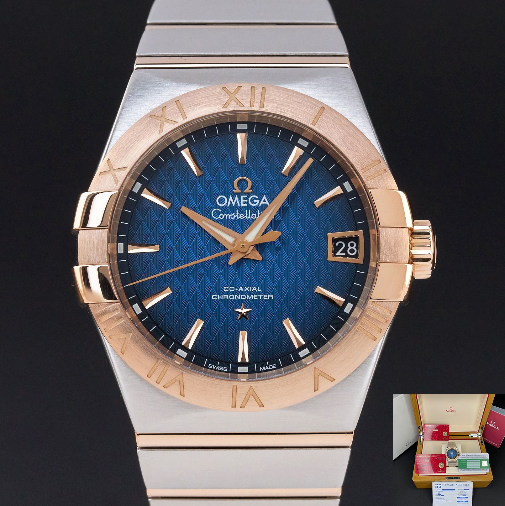 This Omega Constellation Men 123.20.38.21.03.001 features a Blue dial and is crafted from 18K red gold and stainless steel, with a production year of 2016.