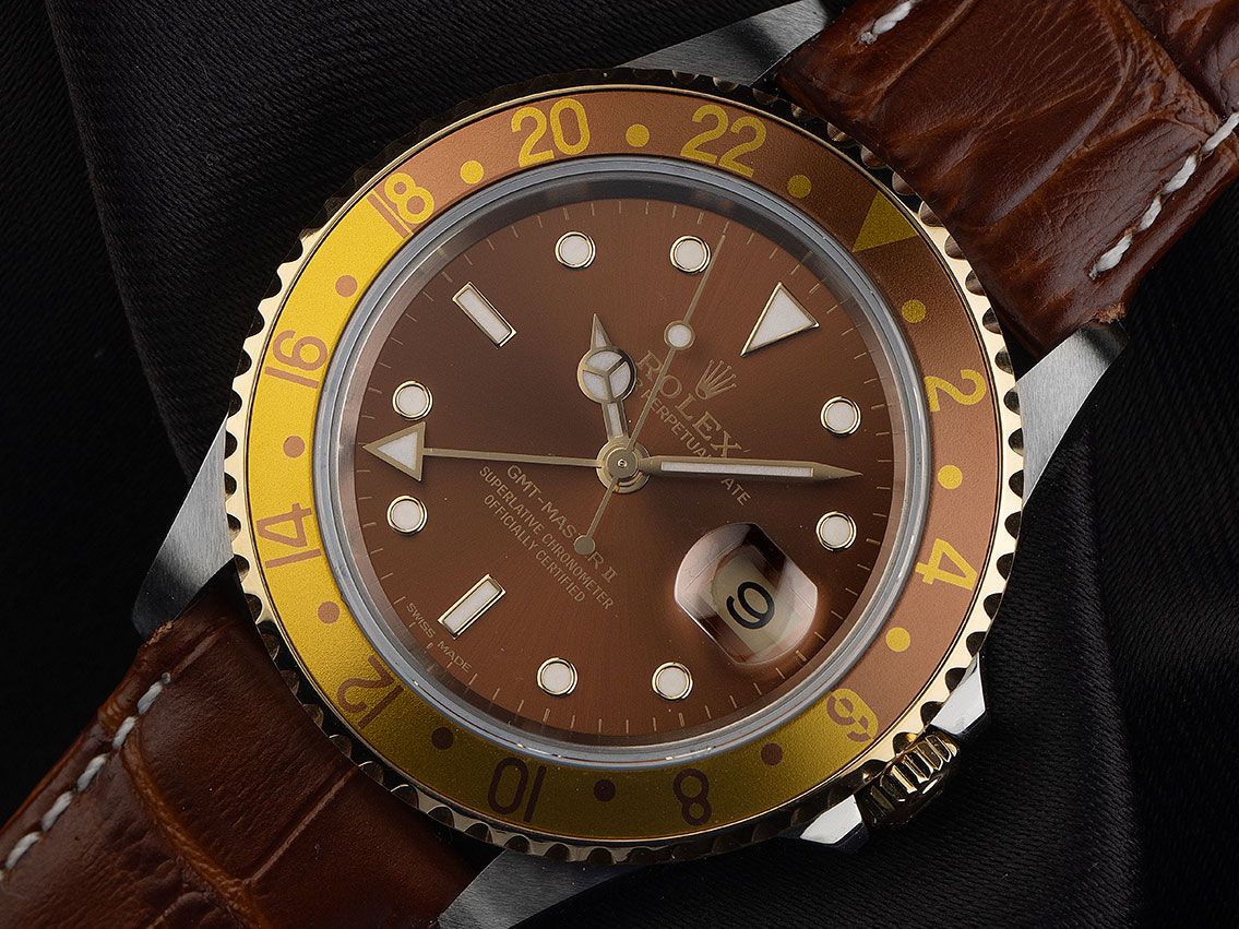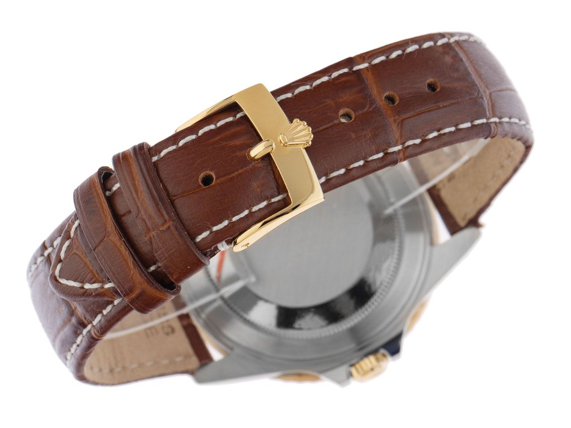 Rolex GMT Master II Tiger Eye Stahl 18kt Gelbgold Automatik Armband Leder