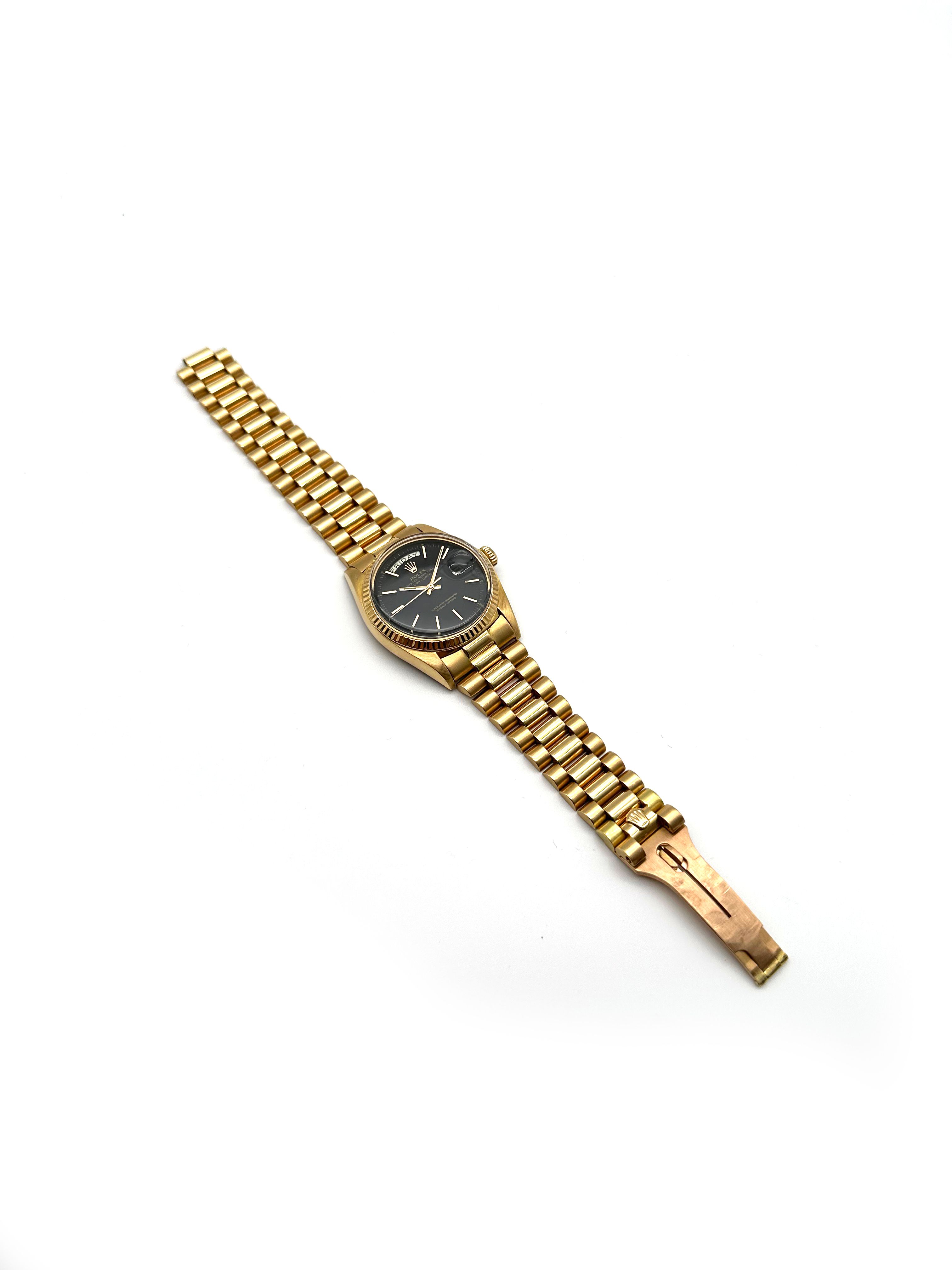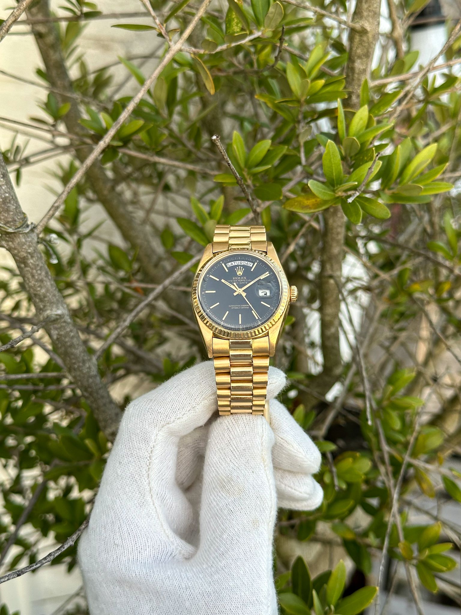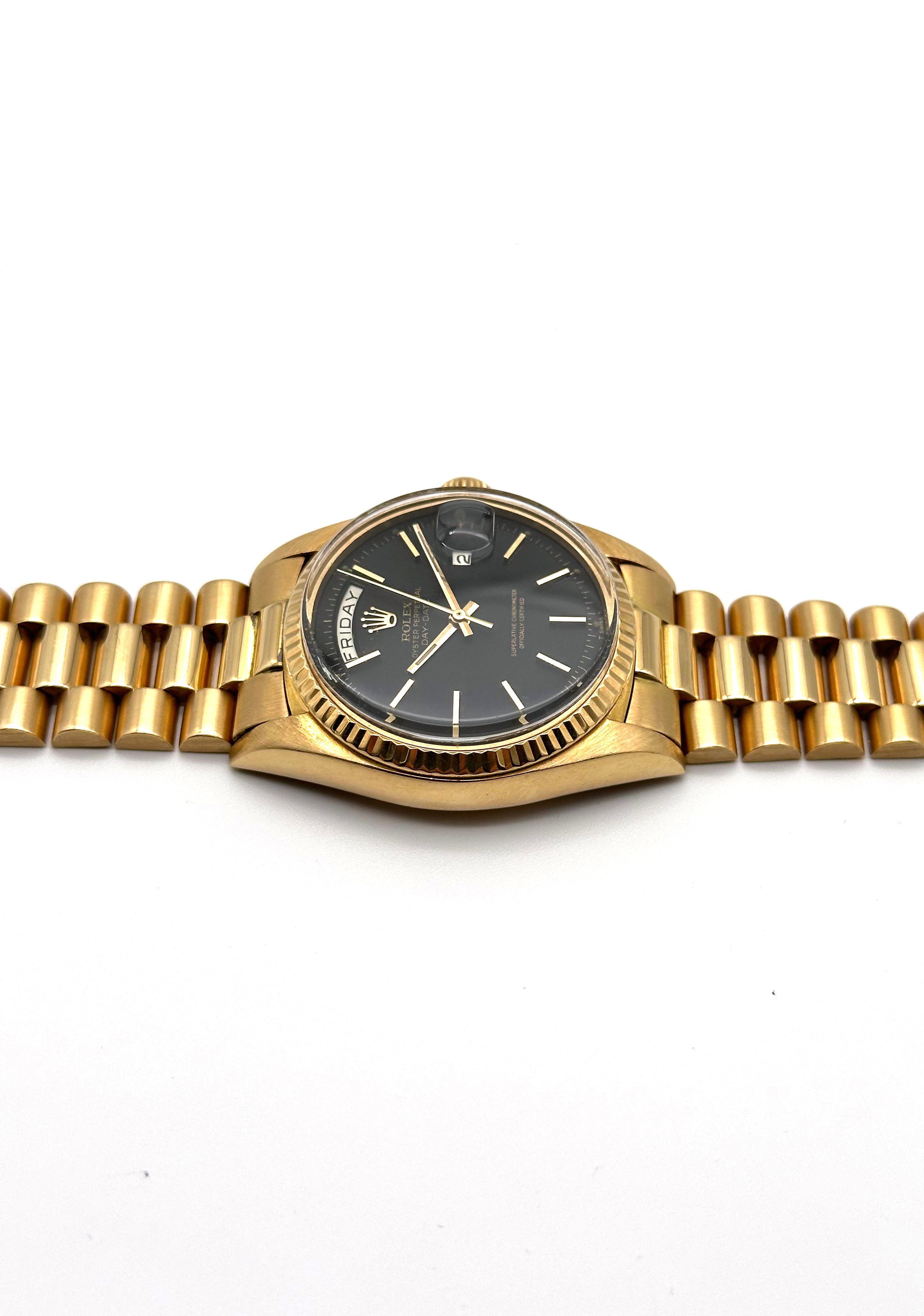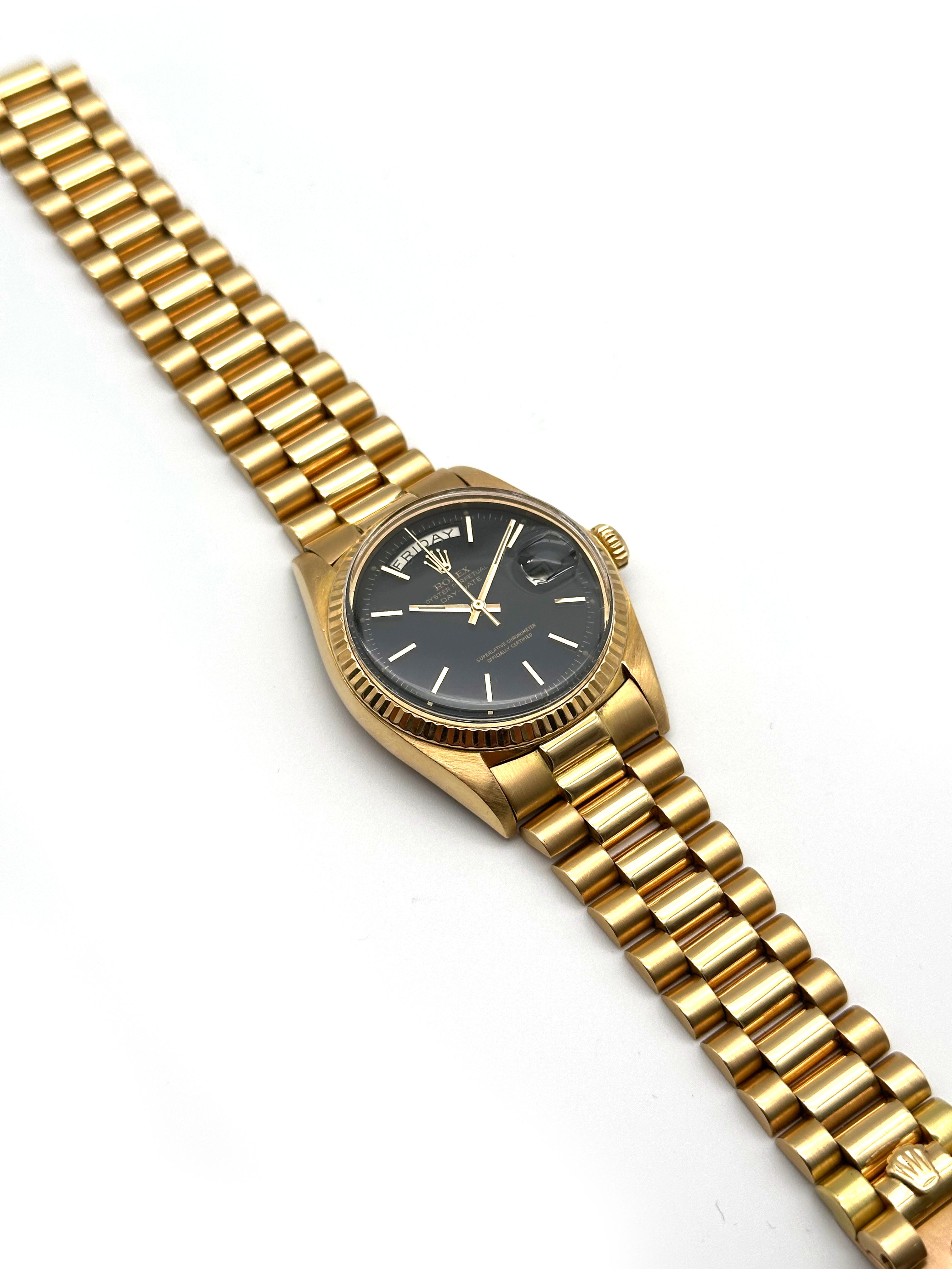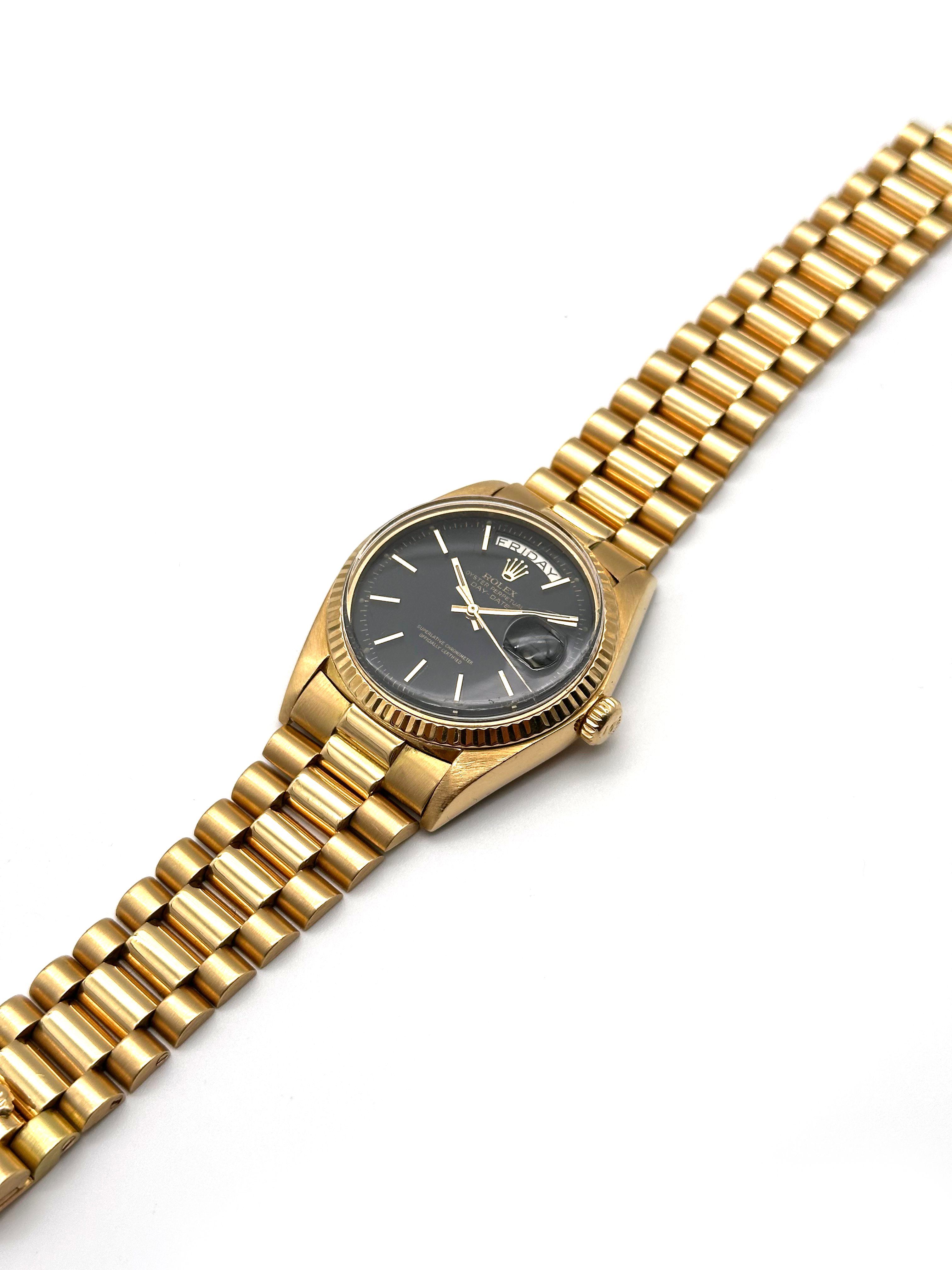 Een prachtig exemplaar van de Rolex Day-Date, uitgevoerd in geelgoud met een donkere wijzerplaat. Deze Day-Date uit 1974, met referentie 1803 is een tijdloze herkenbare klassieker.