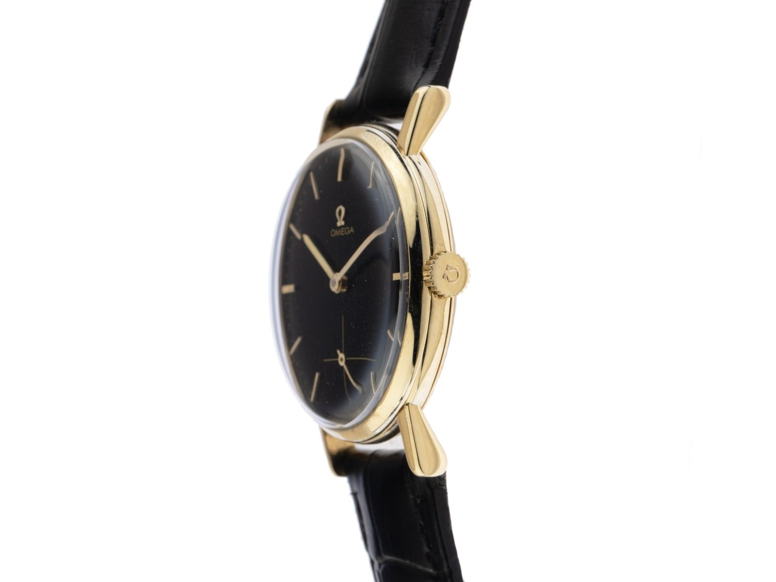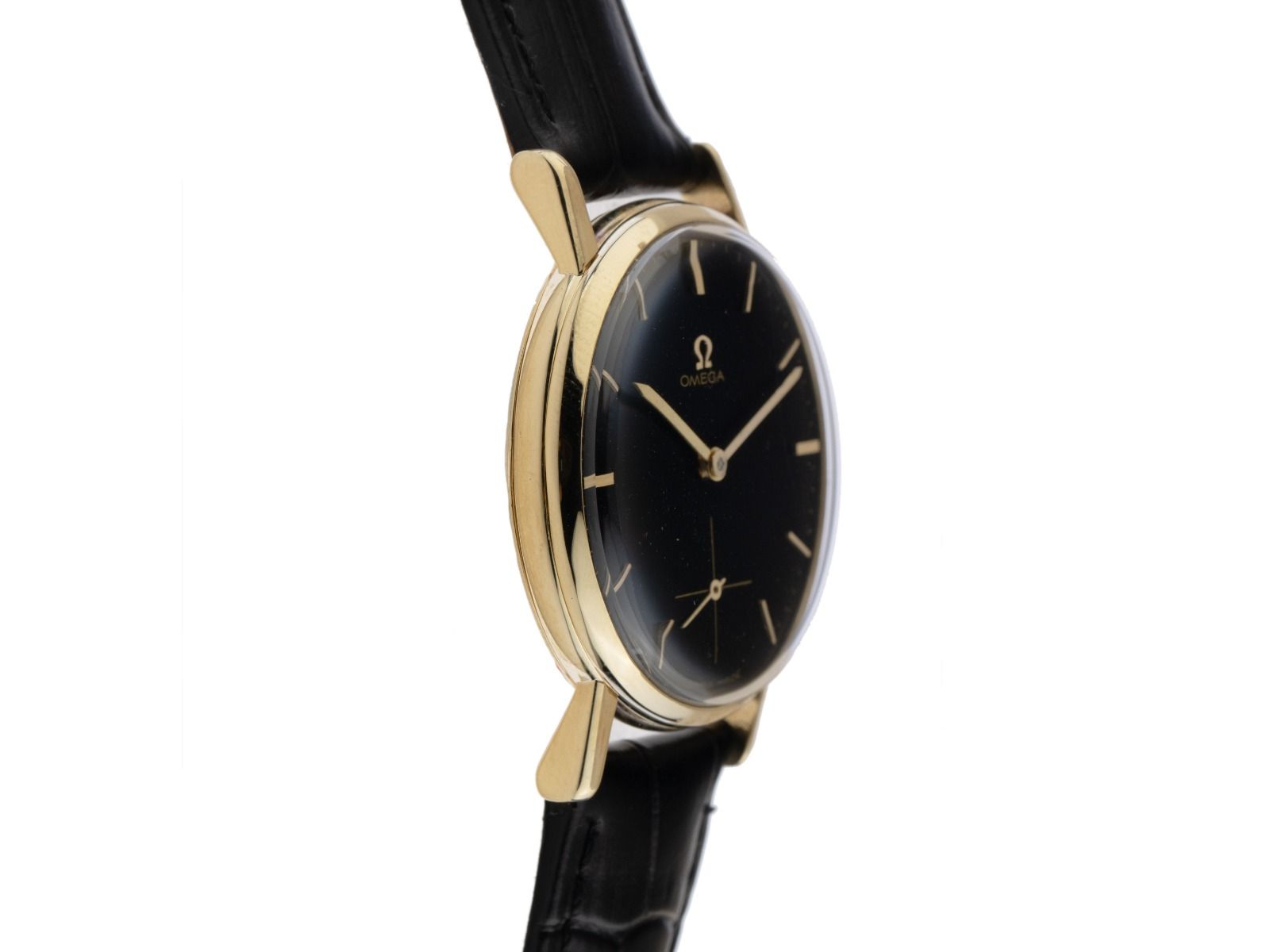 Gehäuse 14kt Gelbgold poliert, Gehäusedurchmesser ohne Krone 32mm, Gehäusehöhe 8,7mm. Lünette 14kt Gelbgold glatt und poliert. Armband Krokoleder schwarz mit Ziernaht, Anstoßbreite 18mm, Stiftschließe Gelbgold vergoldet. Zifferblatt schwarz mit gelbgoldenen Indexen und gelbgoldenen Zeigern. Uhrwerk Handaufzug, Omega Manufakturkaliber 26652 mit 17 Edelsteinen. Anzeige von Stunde und Minute über Zeiger aus der Mitte, kleine Sekunde bei 6 Uhr. Mineralglas kratzfest. Krone geriffelt mit Hersteller-Logo. Boden 14kt Gelbgold. Gewicht der Uhr inklusive Armband 35g. Referenznummer: 2786, Baujahr: 1950, Gehäusenummer: 11408XXX, ID: P184933121125H-4100, Artikelnummer: 10000083024. Mit Gangkontrolle und kompletter äußerlicher Aufarbeitung von November 2025. Original Omega Box und Watchregister Auszug von November 2025, The Watch Register Zertifikat / ohne Eintrag (Internationale Datenbank für verlorene oder gestohlene Uhren). Superschnäppchen, Kapitalanlage mit Wertsteigerungspotential, extrem seltenes Sammlerstück. Sehr guter Zustand. Lieferzeit sofort.