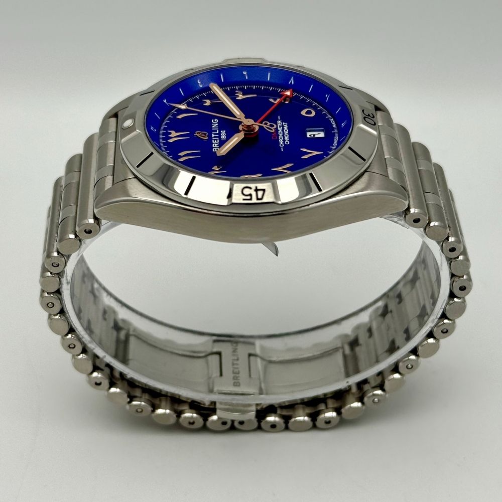 The Breitling Chronomat GMT, reference A32398, features a 40 mm stainless steel case with a striking metallic blue dial adorned with applied Arabic numerals and luminous hands for maximum legibility. Powered by the Breitling caliber 32 automatic GMT movement it offers hours, minutes, central seconds, a red-tipped GMT hand for tracking a second time zone, and a date display positioned between 4 and 5 o’clock.