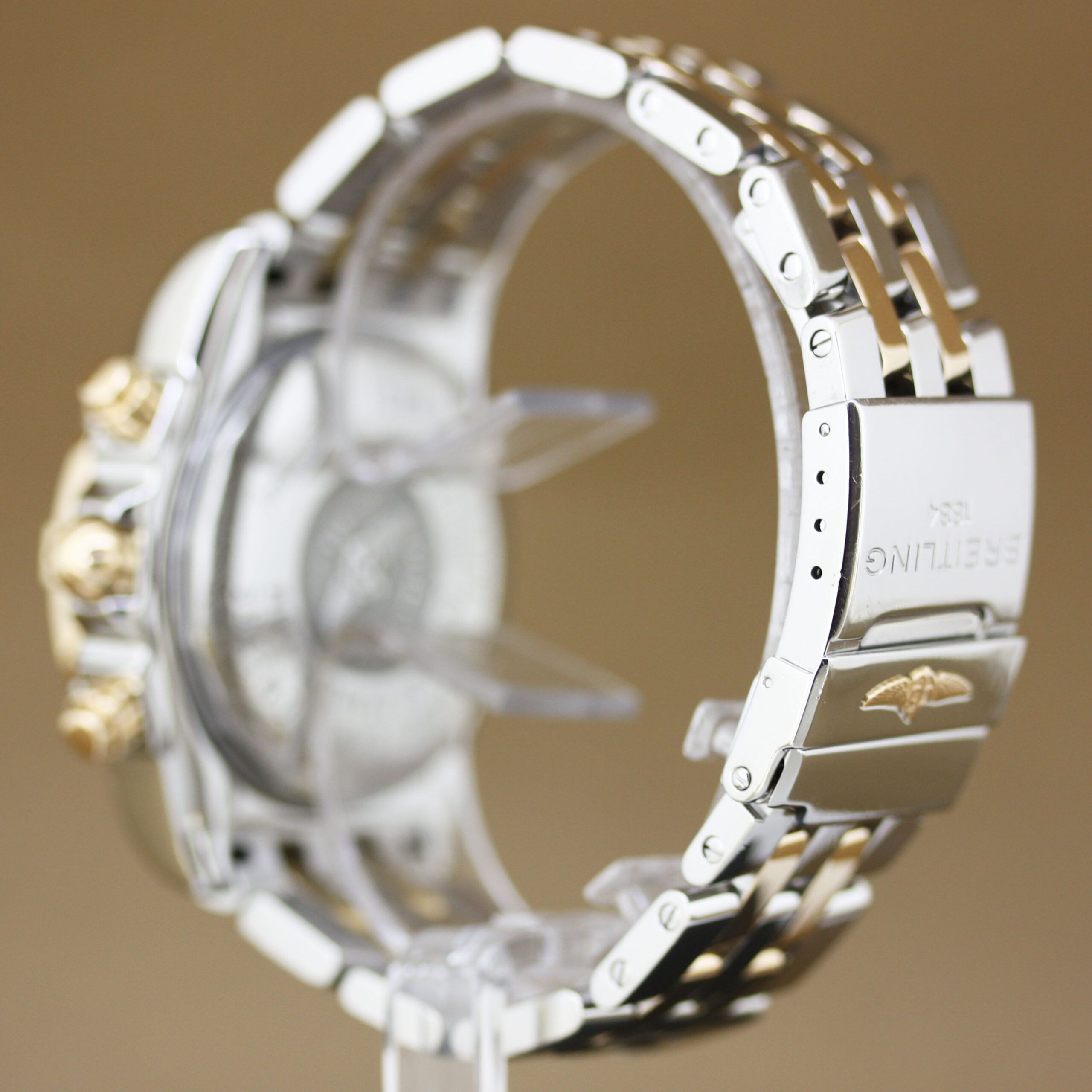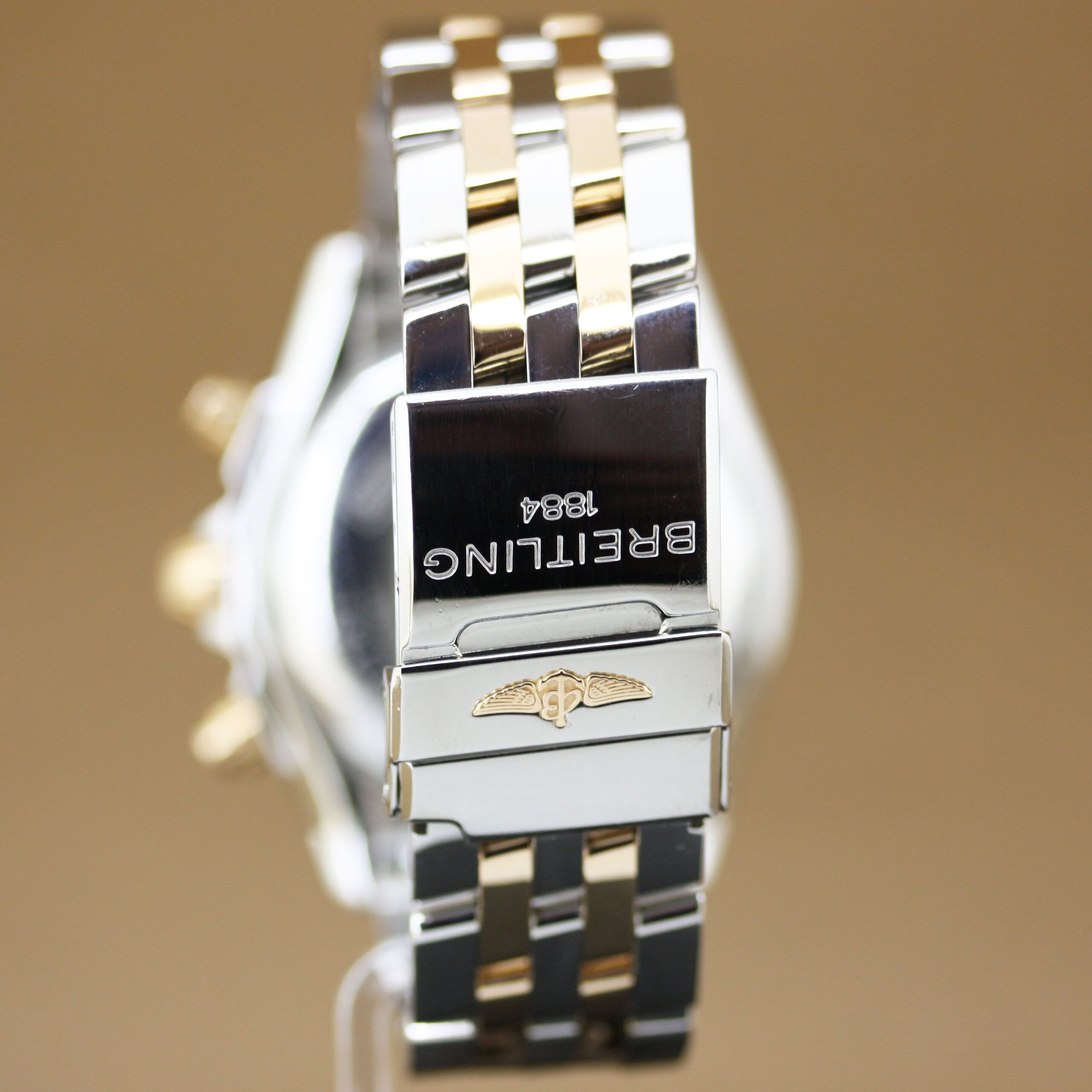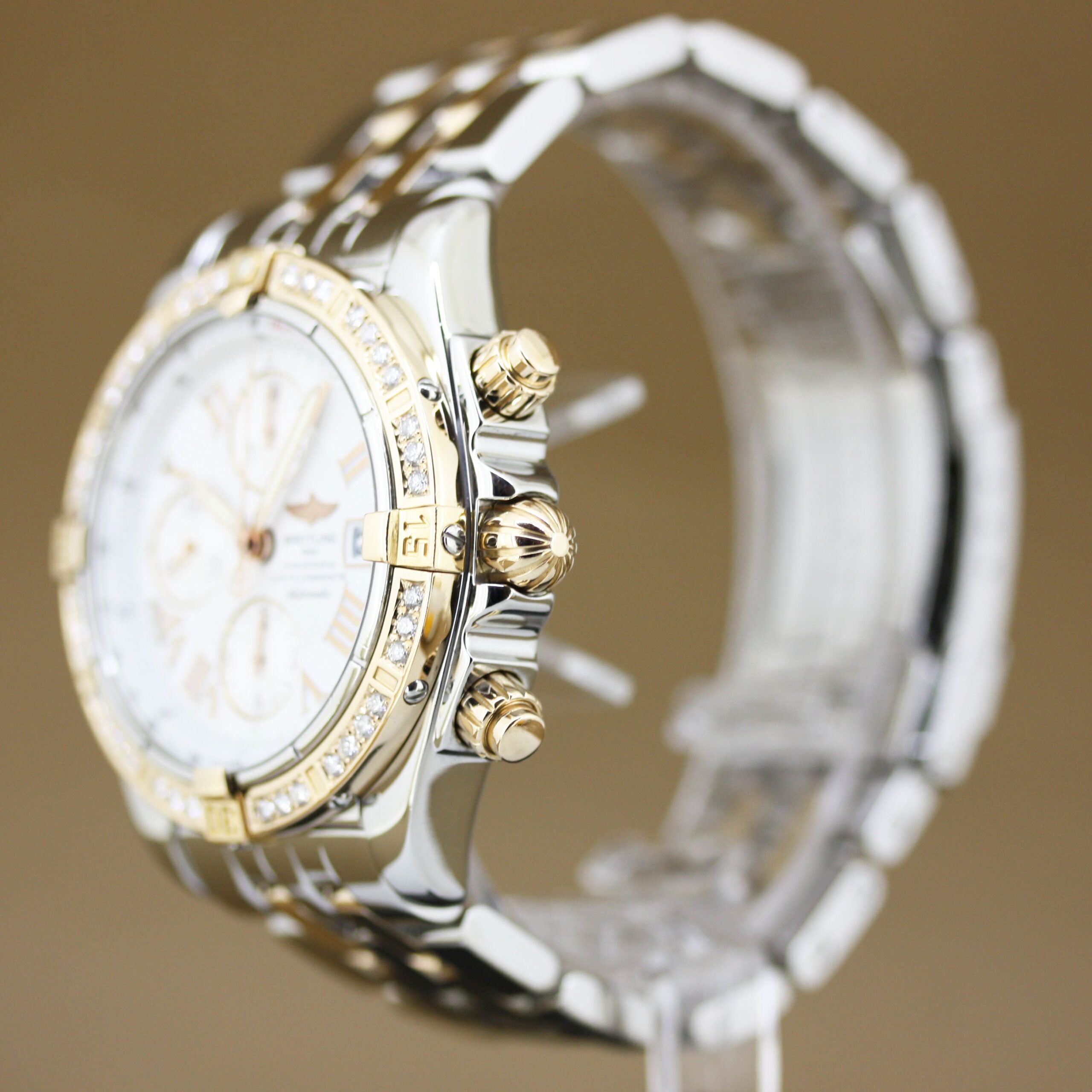 Breitling Chronomat Evolution – Ref. C13356 For sale: a Breitling Chronomat Evolution, reference C13356, in very good condition.This luxurious and sporty model features a stainless-steel case with rose-gold accents, including a diamond-set bezel, rose-gold crown and pushers – a true eye-catcher with a refined finish. The white dial with mother-of-pearl chronograph subdials adds both style and sophistication. The rose-gold/stainless-steel Pilot bracelet with folding clasp ensures elegance and comfort on the wrist. Powered by a reliable automatic movement with date and chronograph function, this watch delivers exceptional precision and performance. Features & Scope of Delivery:✔ Reference: C13356✔ Case: Rose gold/Stainless steel (two-tone)✔ Bezel: Diamond-set✔ Crown & pushers: Rose gold✔ Dial: White with mother-of-pearl chronograph subdials✔ Bracelet: Rose gold/stainless-steel Pilot bracelet with folding clasp✔ Movement: Automatic with date & chronograph✔ Diameter: 44 mm✔ Condition: Very good✔ Full Set – original box & papers included A striking and luxurious Breitling Chronomat Evolution, perfect for collectors and enthusiasts who appreciate refinement, engineering, and presence.