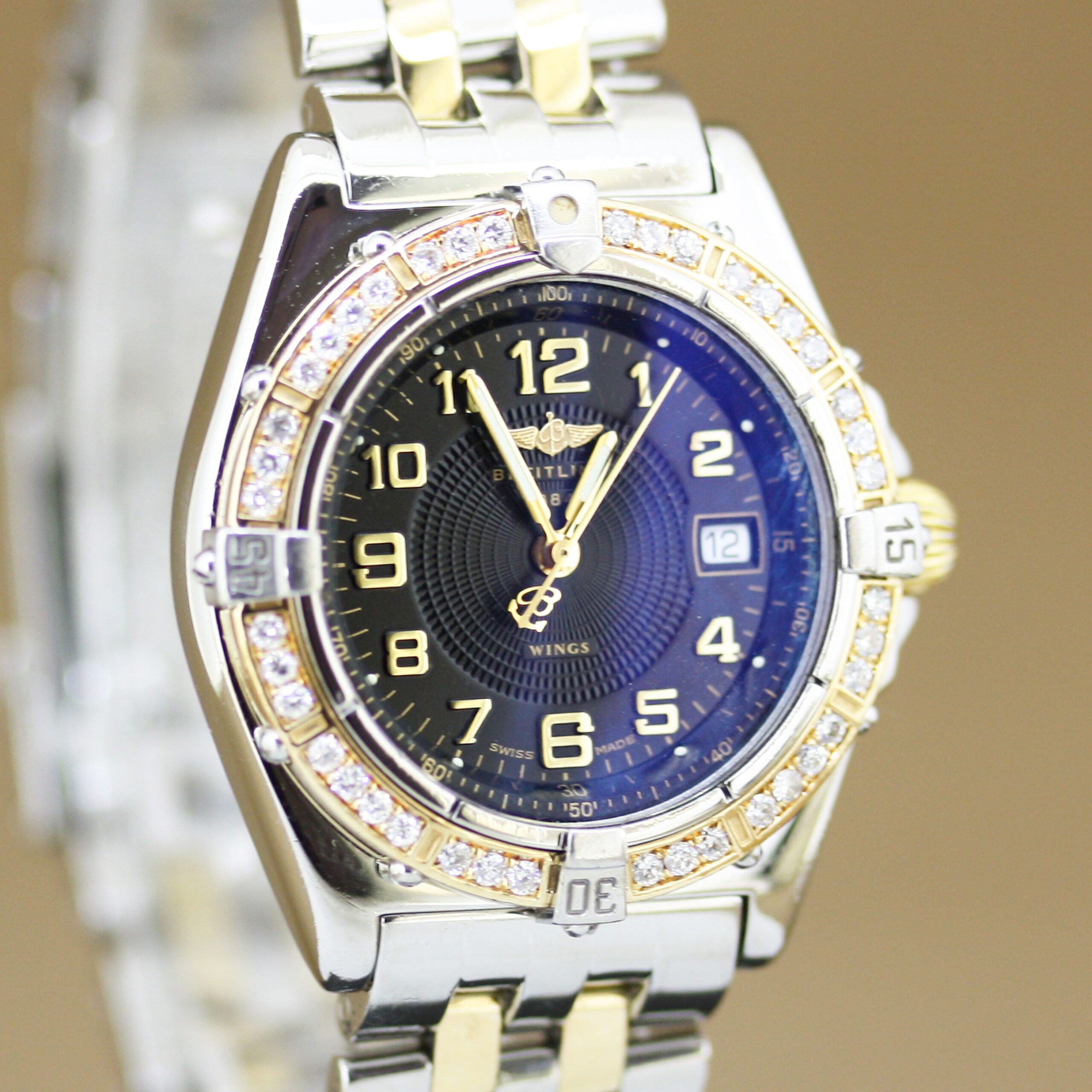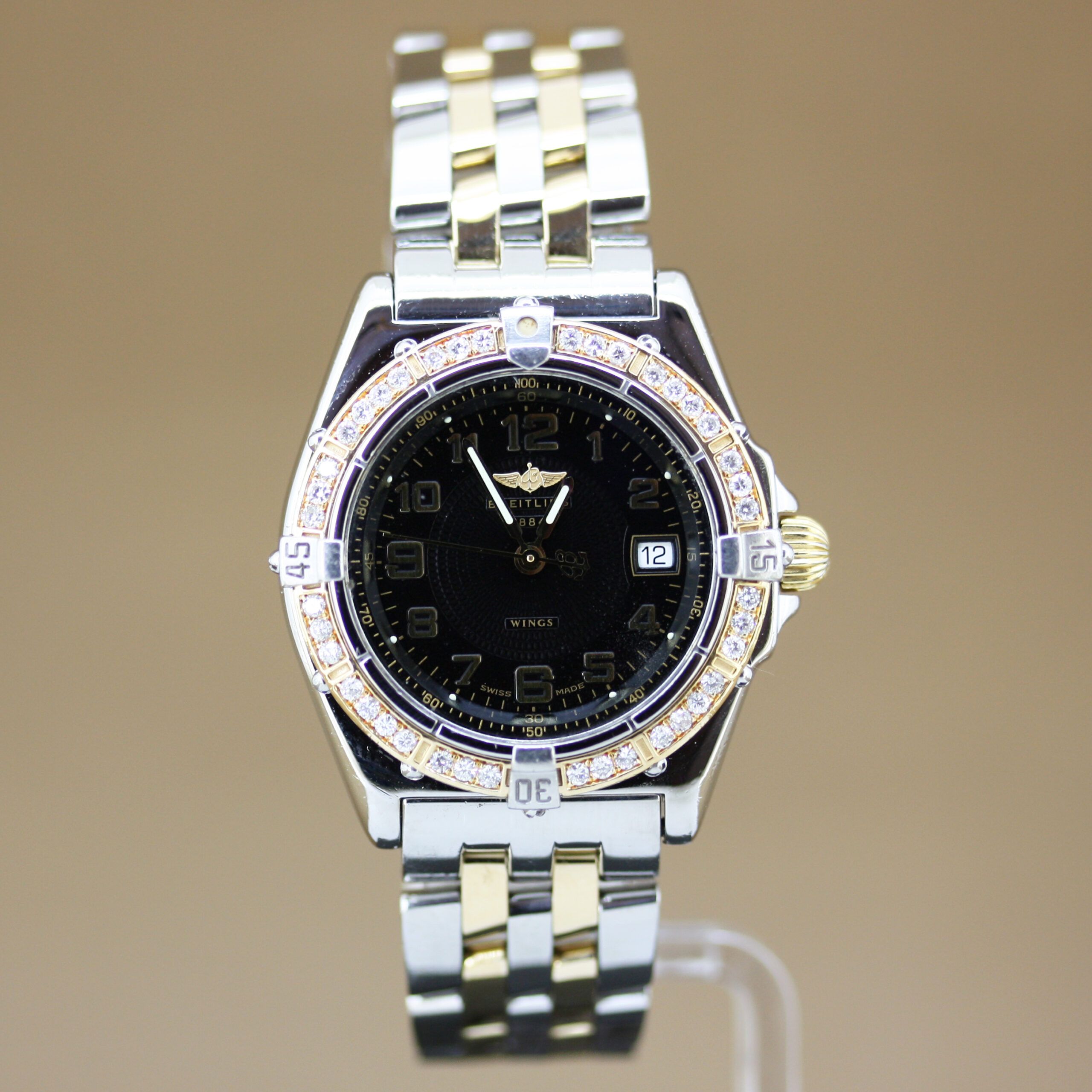 Breitling Lady Wings – Ref. D67350 For sale: a stylish and timeless Breitling Lady Wings, reference number D67350. This elegant ladies’ timepiece is in very good condition and perfectly blends classic luxury with everyday wearability. The watch features a two-tone gold and steel case paired with a black dial, creating a chic and characterful appearance. The matching two-tone pilot bracelet with folding clasp ensures a secure and comfortable fit on the wrist. At its heart, the watch houses a precise quartz movement with a date function, making it not only elegant but also highly practical for daily use. ✔ Supplied with Breitling travel case✔ Certificate of authenticity included✔ Official valuation report available A refined Breitling ladies’ watch with luxurious details – perfect for daily wear or as a special gift.