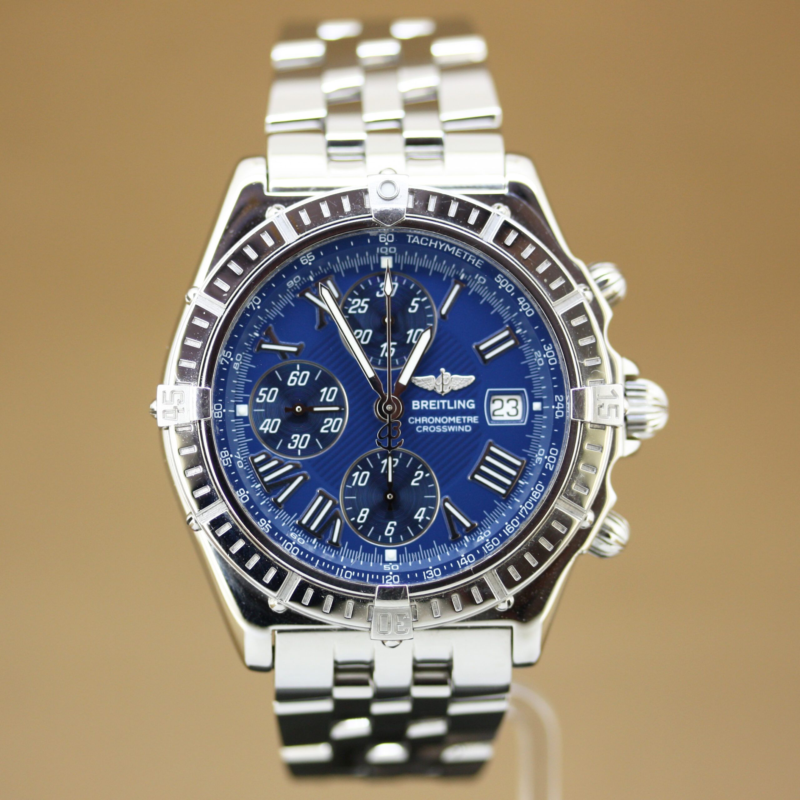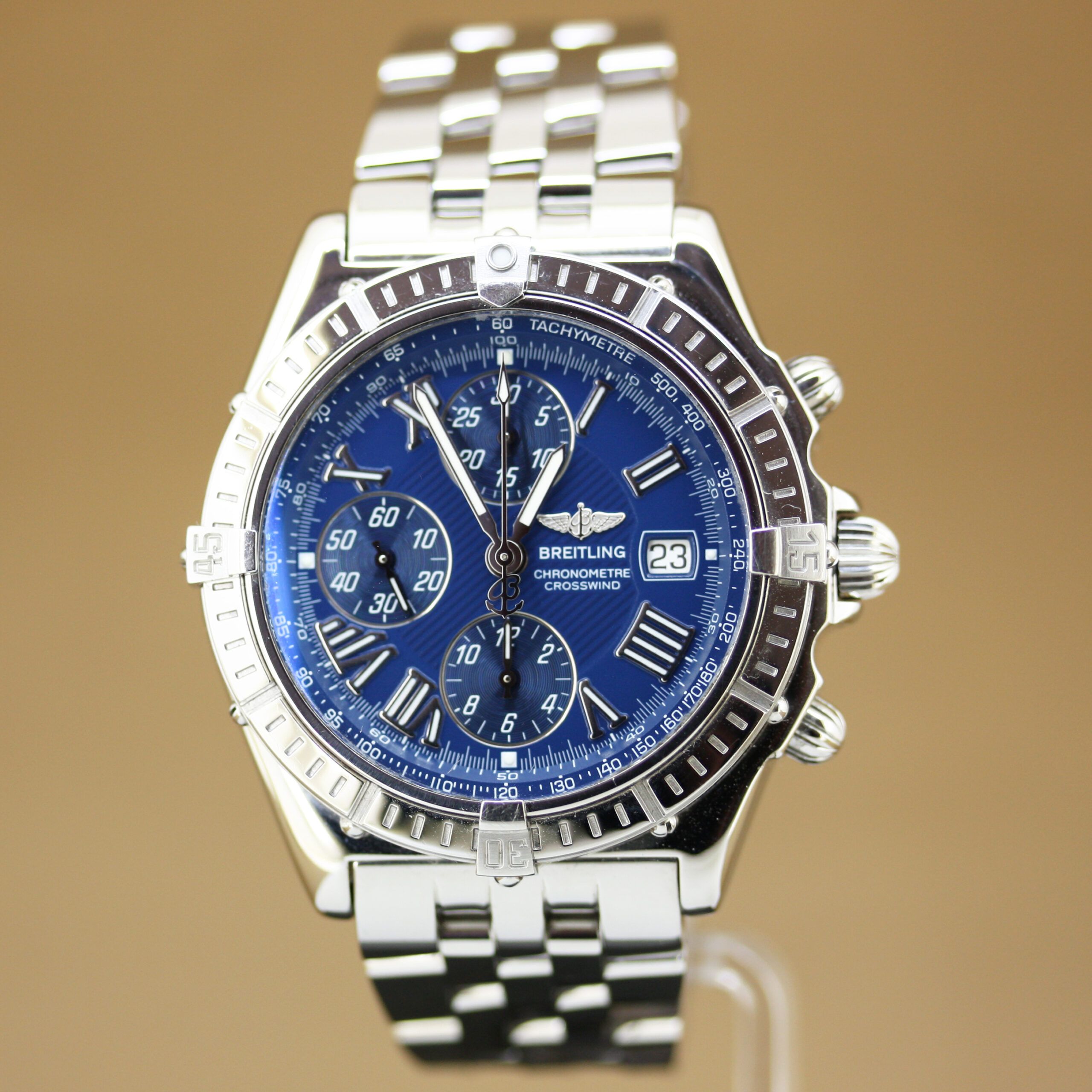 Breitling Crosswind – Ref. A13355 (Full Set) For sale: a Breitling Crosswind in very good condition.This robust yet elegant model features a stainless steel case and a stylish blue dial. The stainless steel Pilot bracelet with folding clasp ensures both comfort and a bold appearance. Inside ticks a reliable automatic movement with date and chronograph function. Features & Scope of Delivery:✔ Reference: A13355✔ Case: Stainless steel✔ Dial: Blue✔ Bracelet: Stainless steel Pilot bracelet with folding clasp✔ Movement: Automatic with date & chronograph✔ Diameter: 43 mm – classic Crosswind size✔ Condition: Very good✔ Delivered as Full Set (box & papers) A stunning Breitling Crosswind, highly appreciated for its classic appeal and technical reliability.
