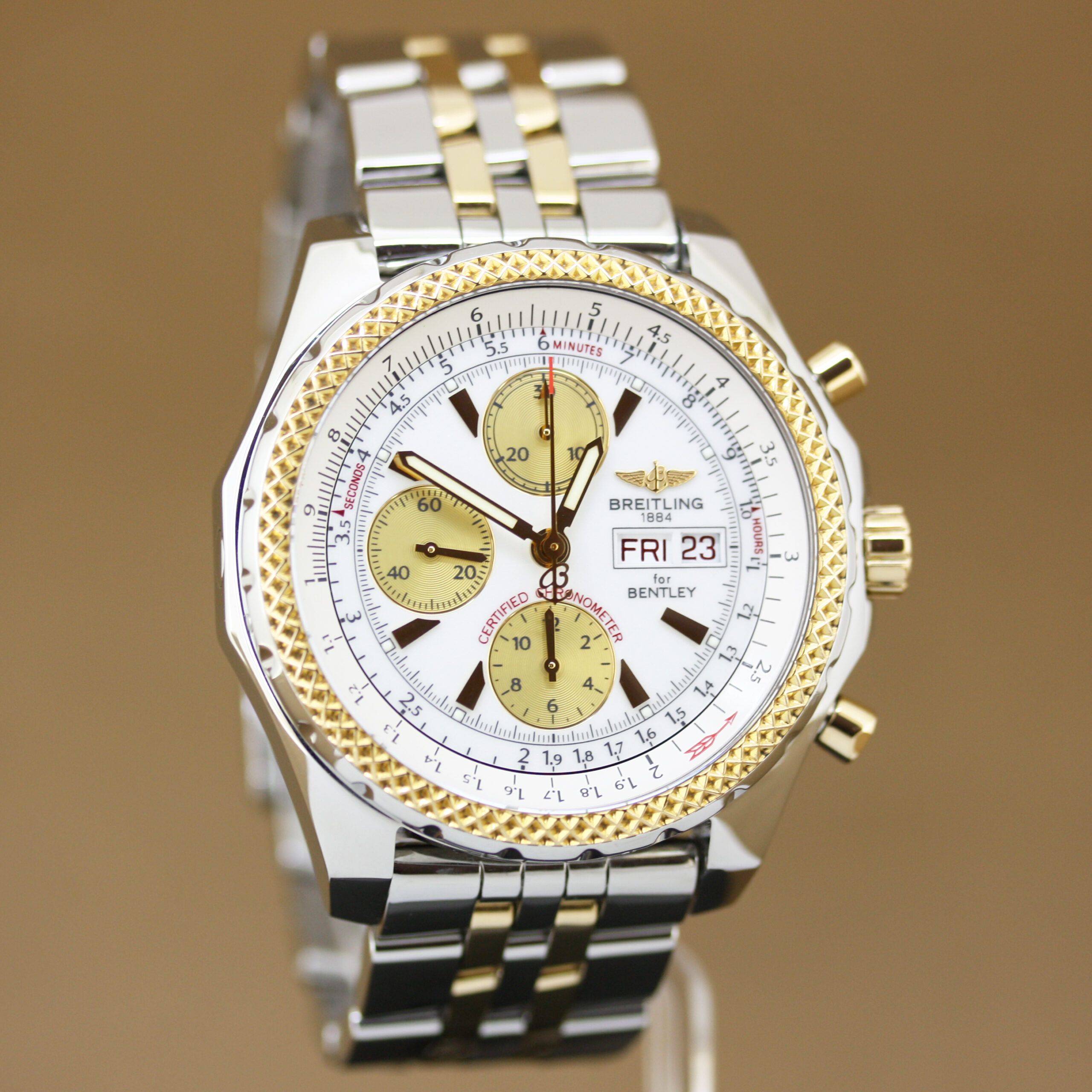 Breitling Bentley GT D13362 – Gold/Steel – Full Set – Recently Serviced For sale: a very rare and excellent condition Breitling Bentley GT, ref. D13362. This exclusive version is equipped with a gold-steel case and a matching gold-steel pilot strap with folding clasp, which gives the watch a particularly luxurious appearance. The white dial with gold accents houses an automatic movement with day, date and chronograph function. The watch has recently been professionally serviced, and therefore runs perfectly. ✔ Automatic movement – recently serviced ✔ Day, date and chronograph function ✔ Gold-steel case and strap ✔ Full set: including original box and papers A beautiful watch for the collector or enthusiast of Breitling and Bentley. Seriously interested? Feel free to contact us.