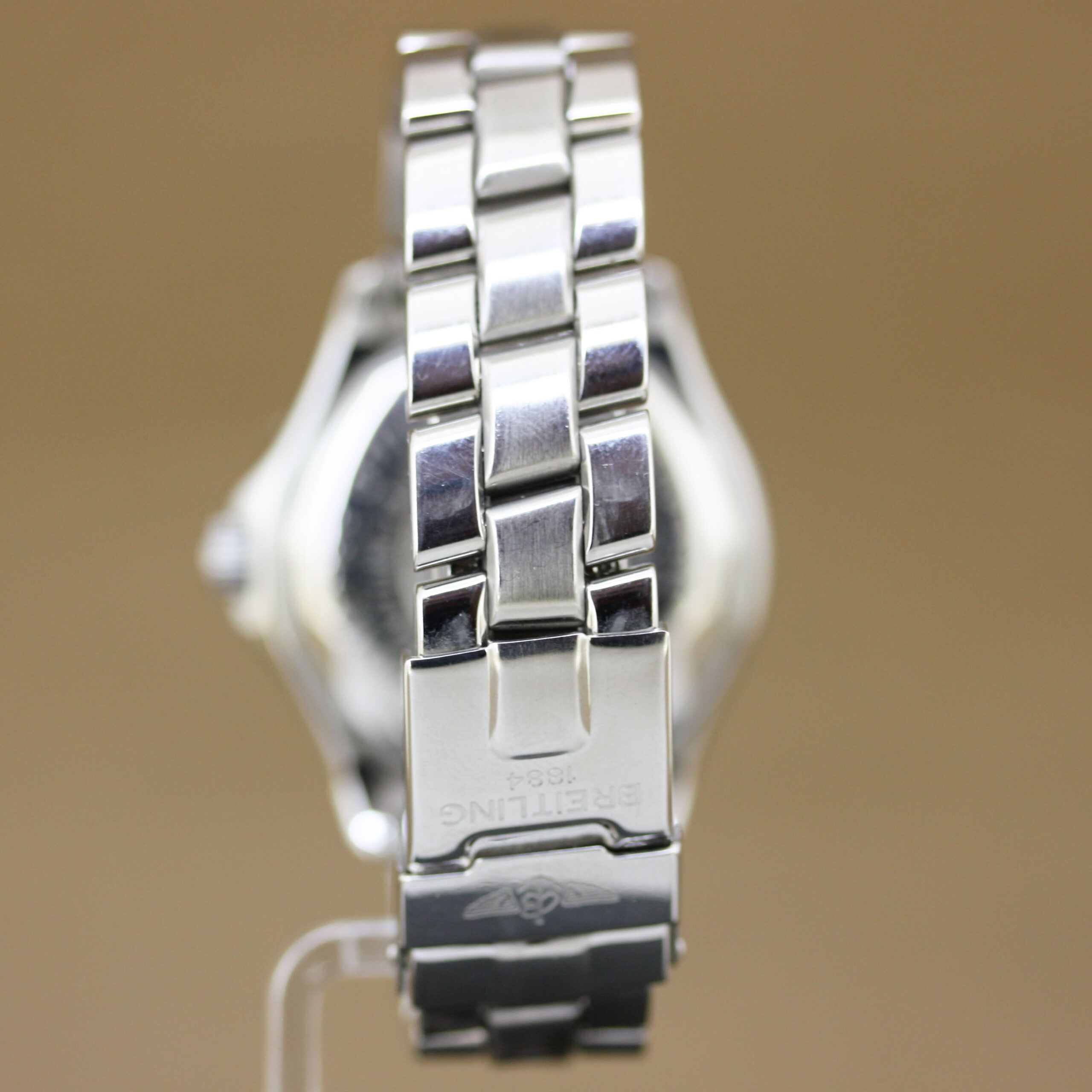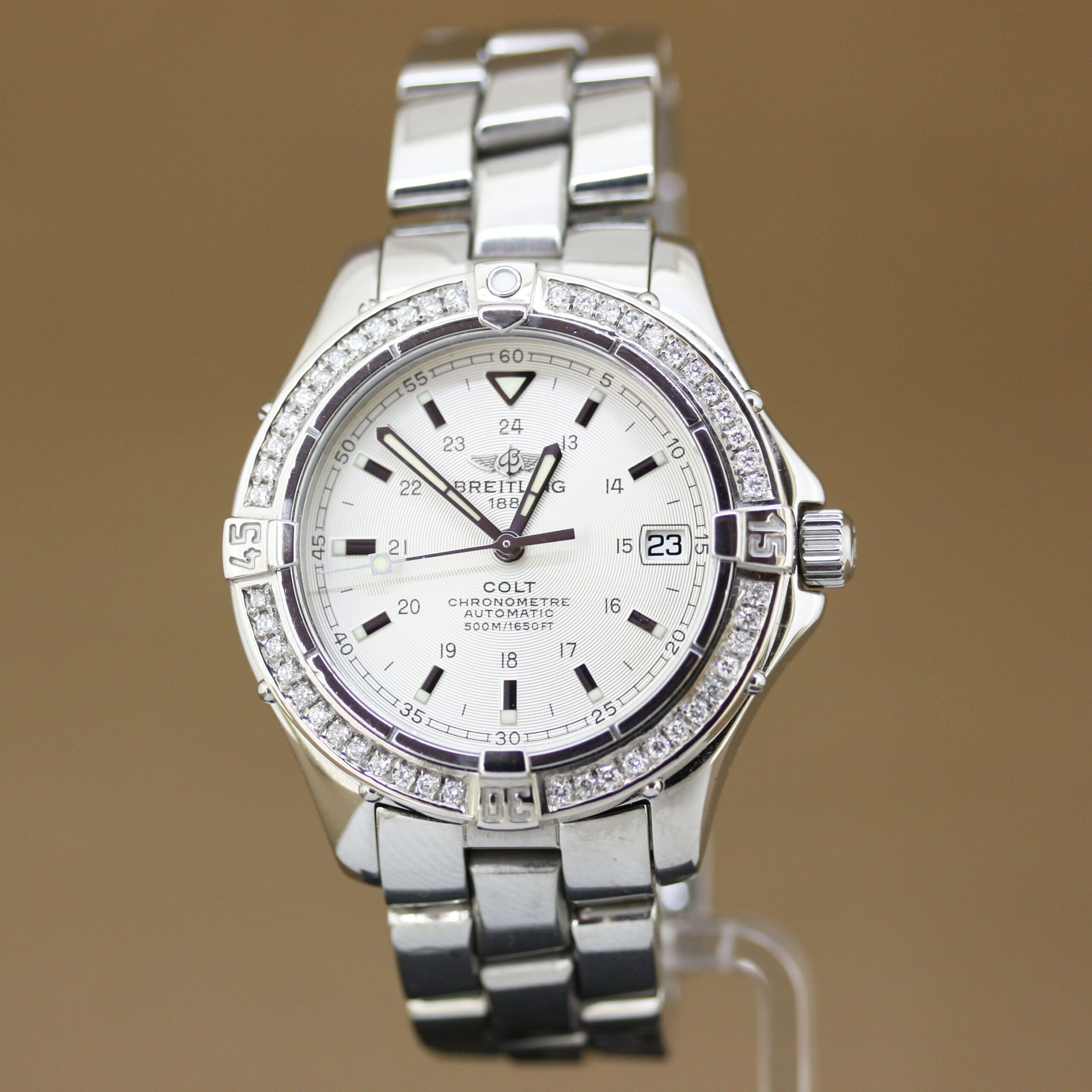 Breitling Colt Automatic 38mm A17350 in very good condition, equipped with a steel case and silver dial and diamond bezel. Watch has a steel strap with folding clasp and an automatic movement with date function. The watch comes with box (Breitling travel case) certificate of authenticity & appraisal report.