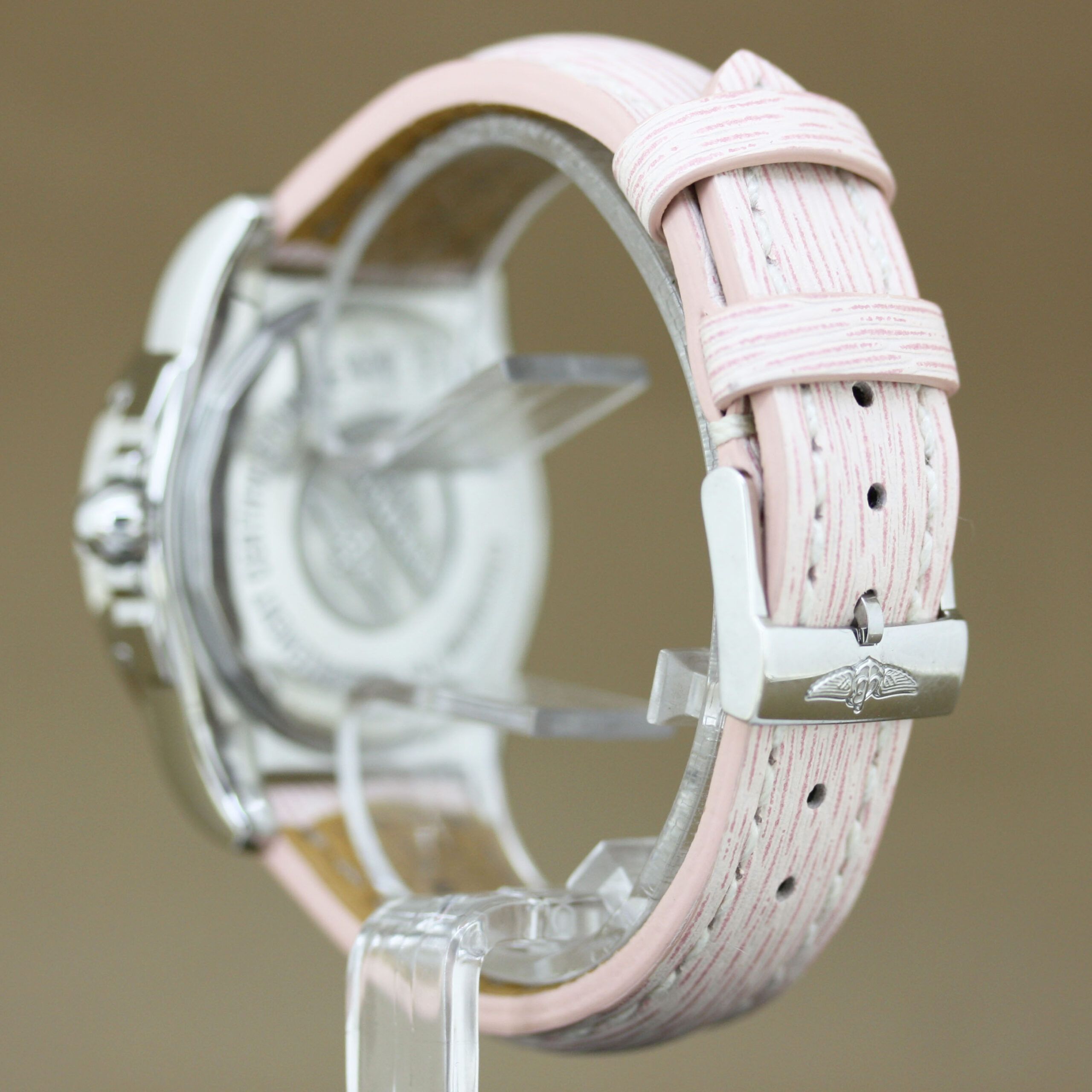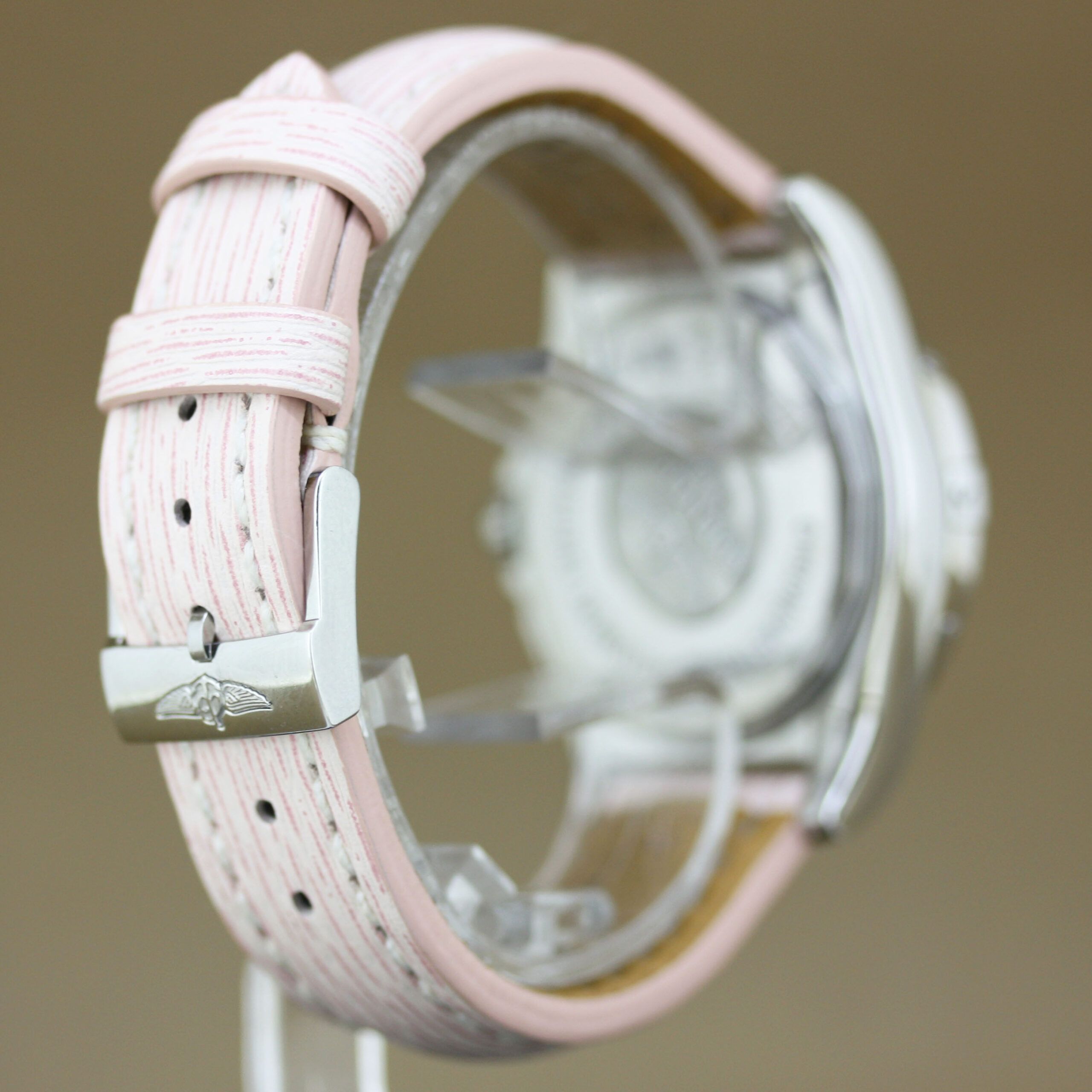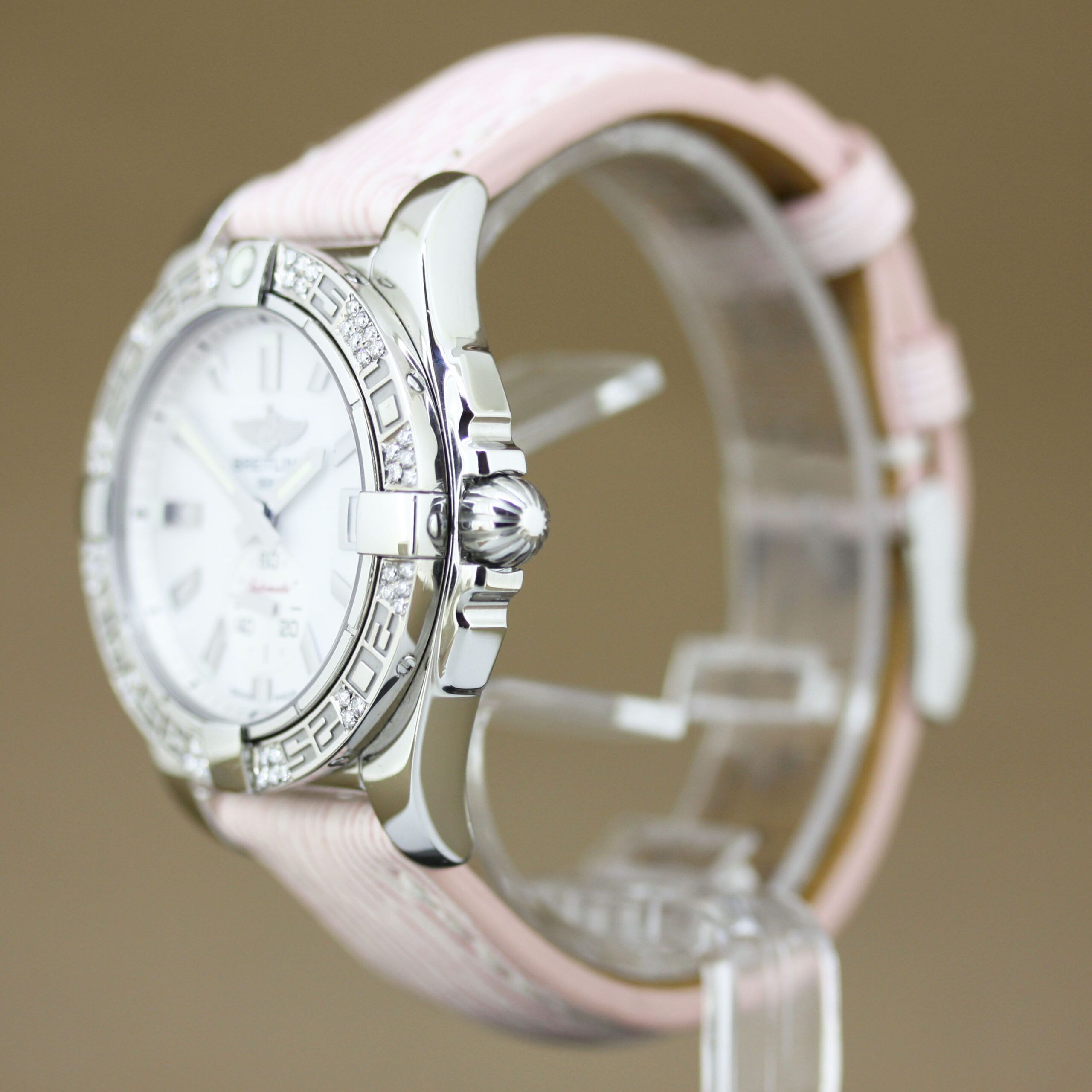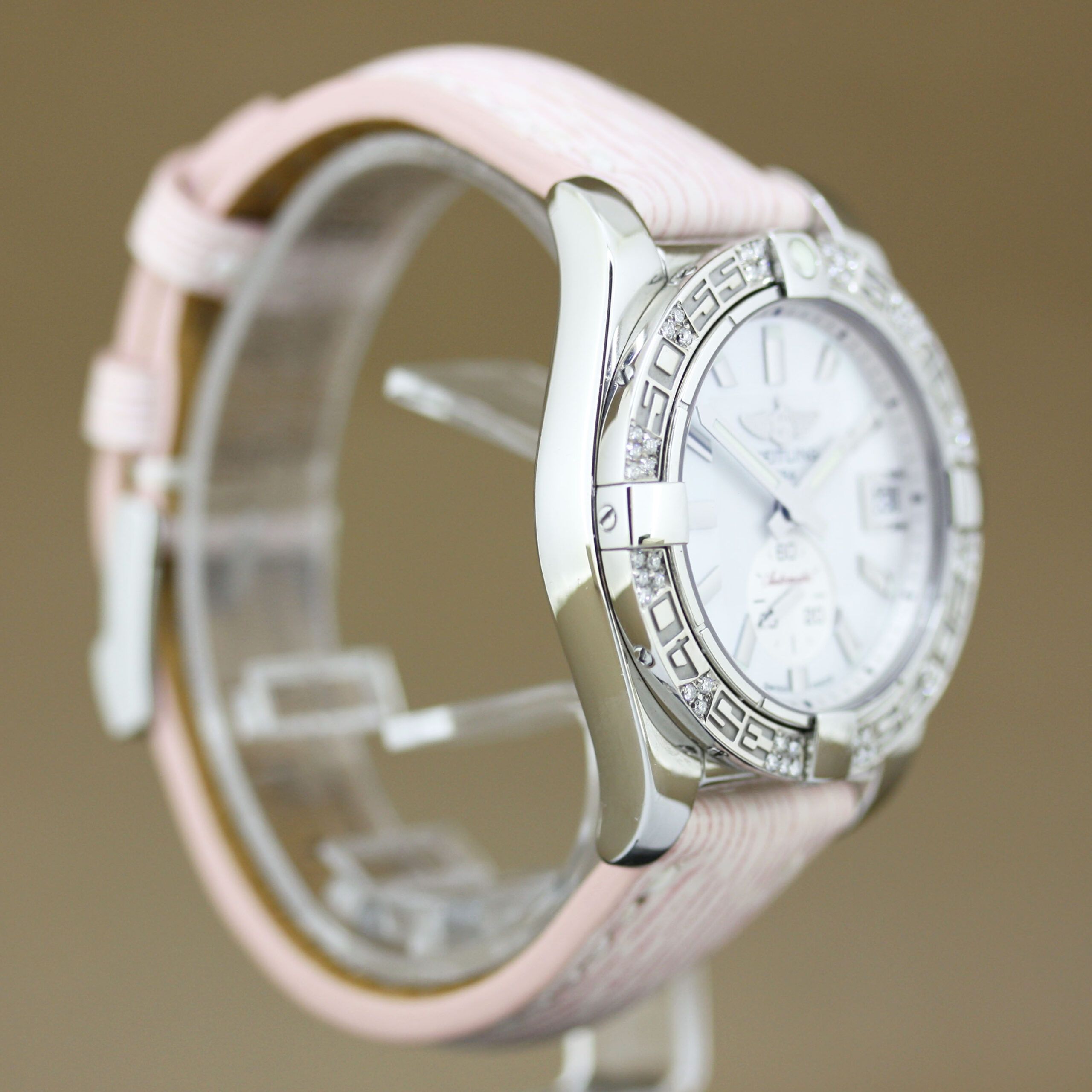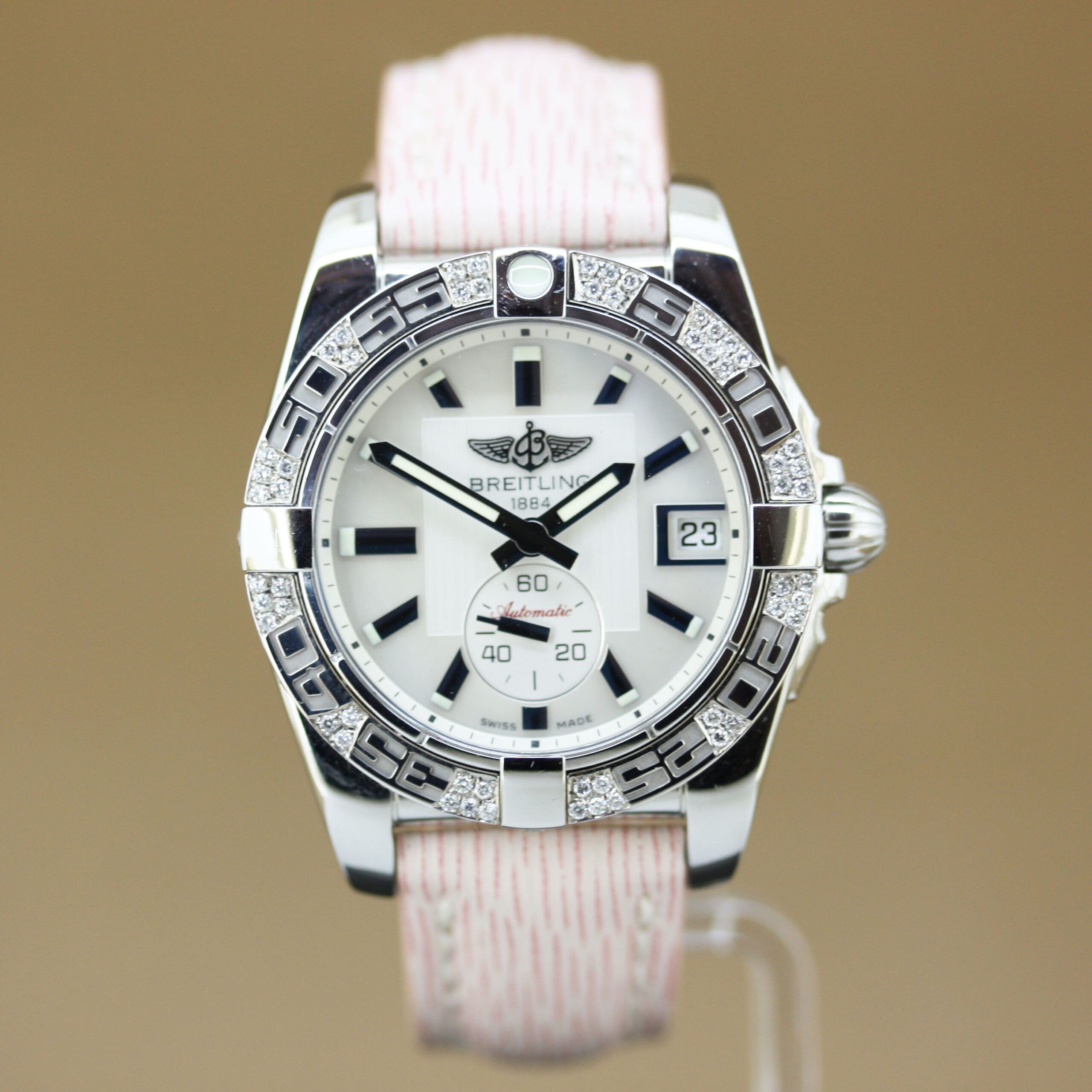 In very good condition Breitling Galactic 36 Automatic ref: A37330, The watch is equipped with a steel case with a brilliant set bezel. Watch has a mother of pearl white dial. The Breitling Galactic 36 has a leather strap with buckle. This model has an automatic movement with date function. The watch comes with box and papers.