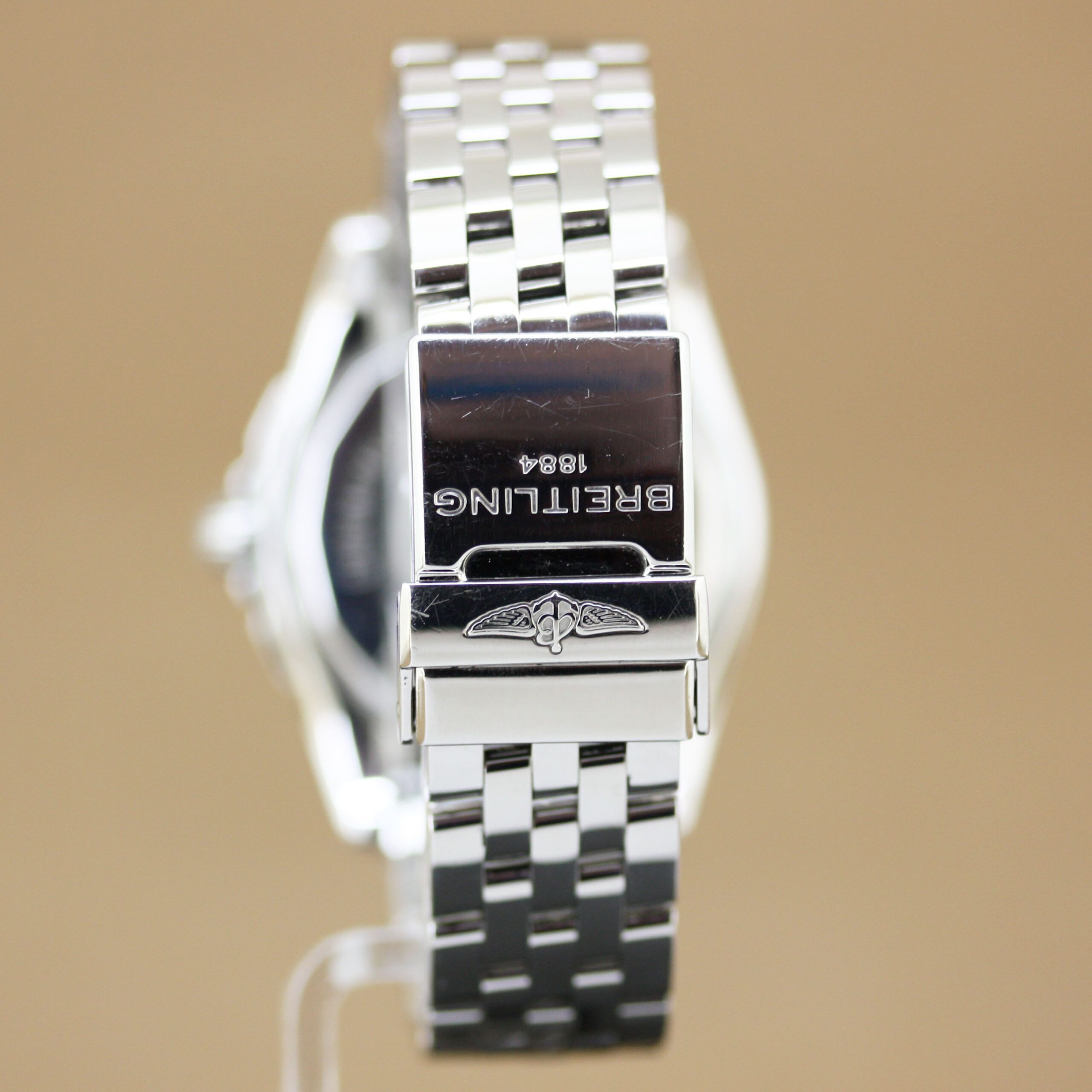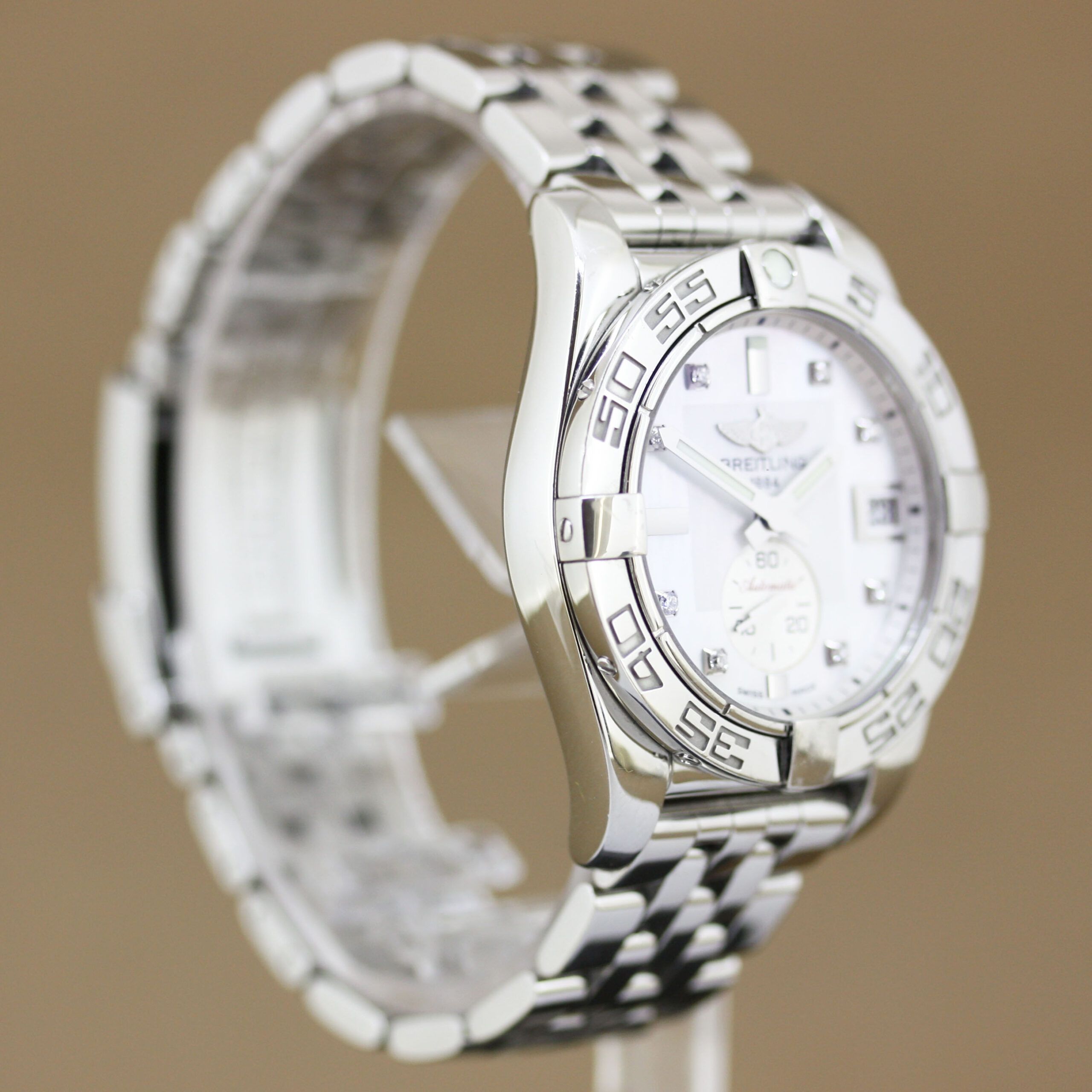 Breitling Galactic 36 Automatic, ref: A37330, in good condition, fitted with a steel case. Watch has a mother-of-pearl white dial with diamond. The Breitling Galactic 36 has a steel pilot strap with folding clasp. This model has an automatic movement with date function. The watch comes with box and papers.