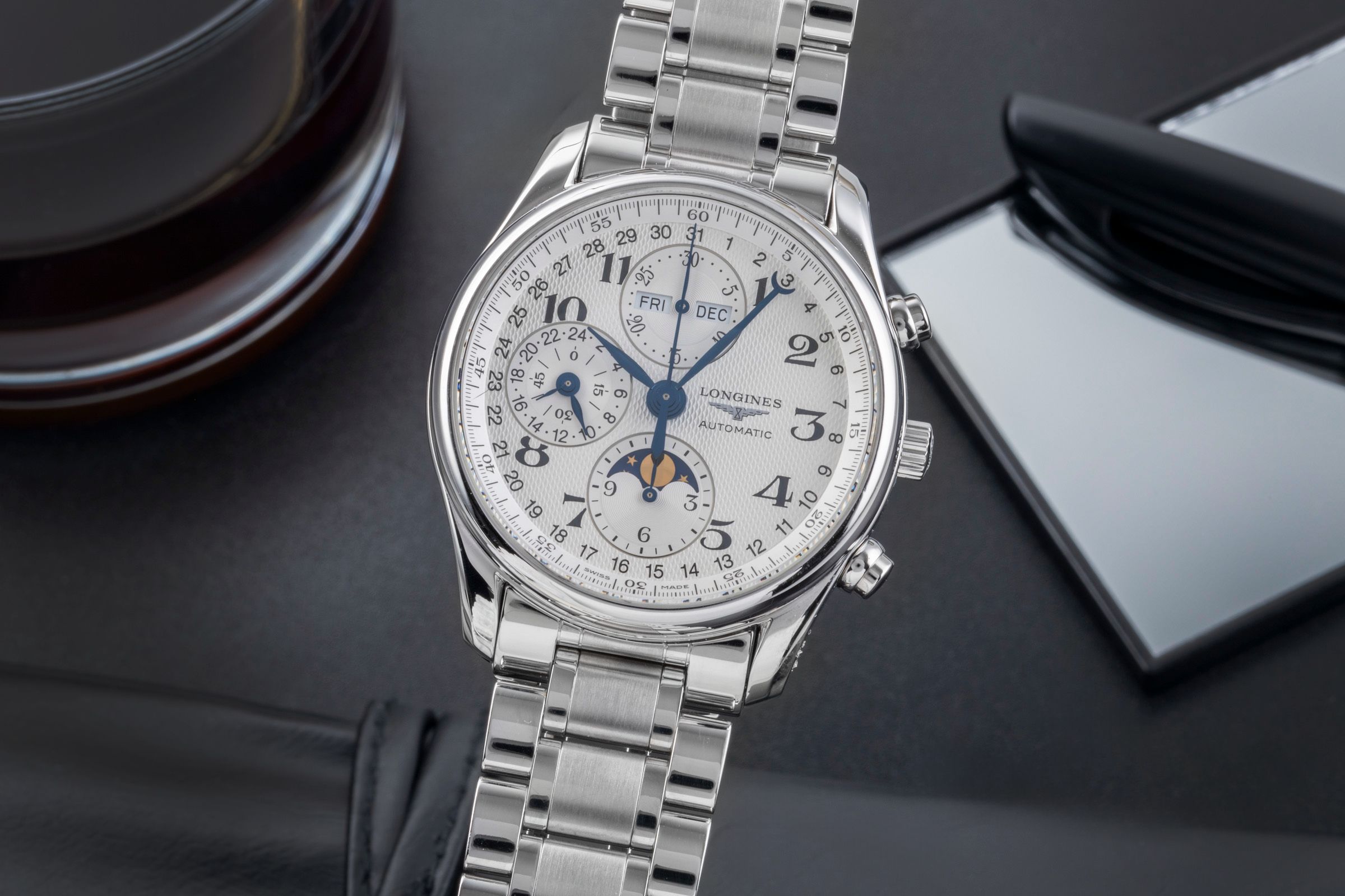 Functions: 24-hour display, Chronograph, Date, Month display, Moon phase, Weekday display