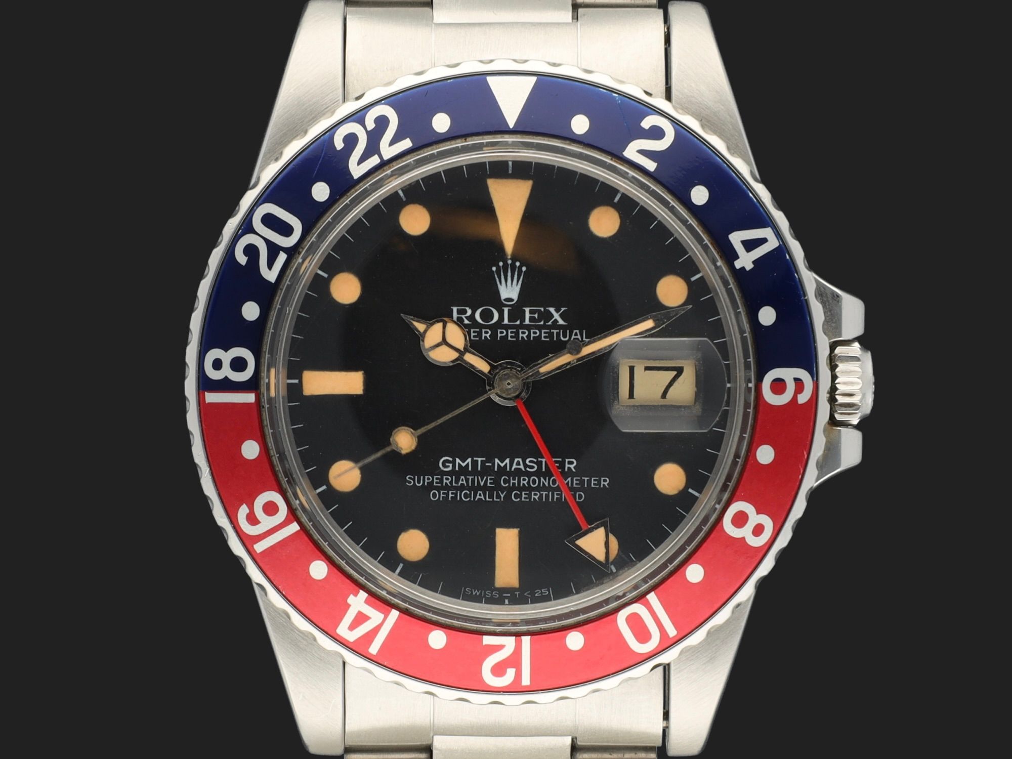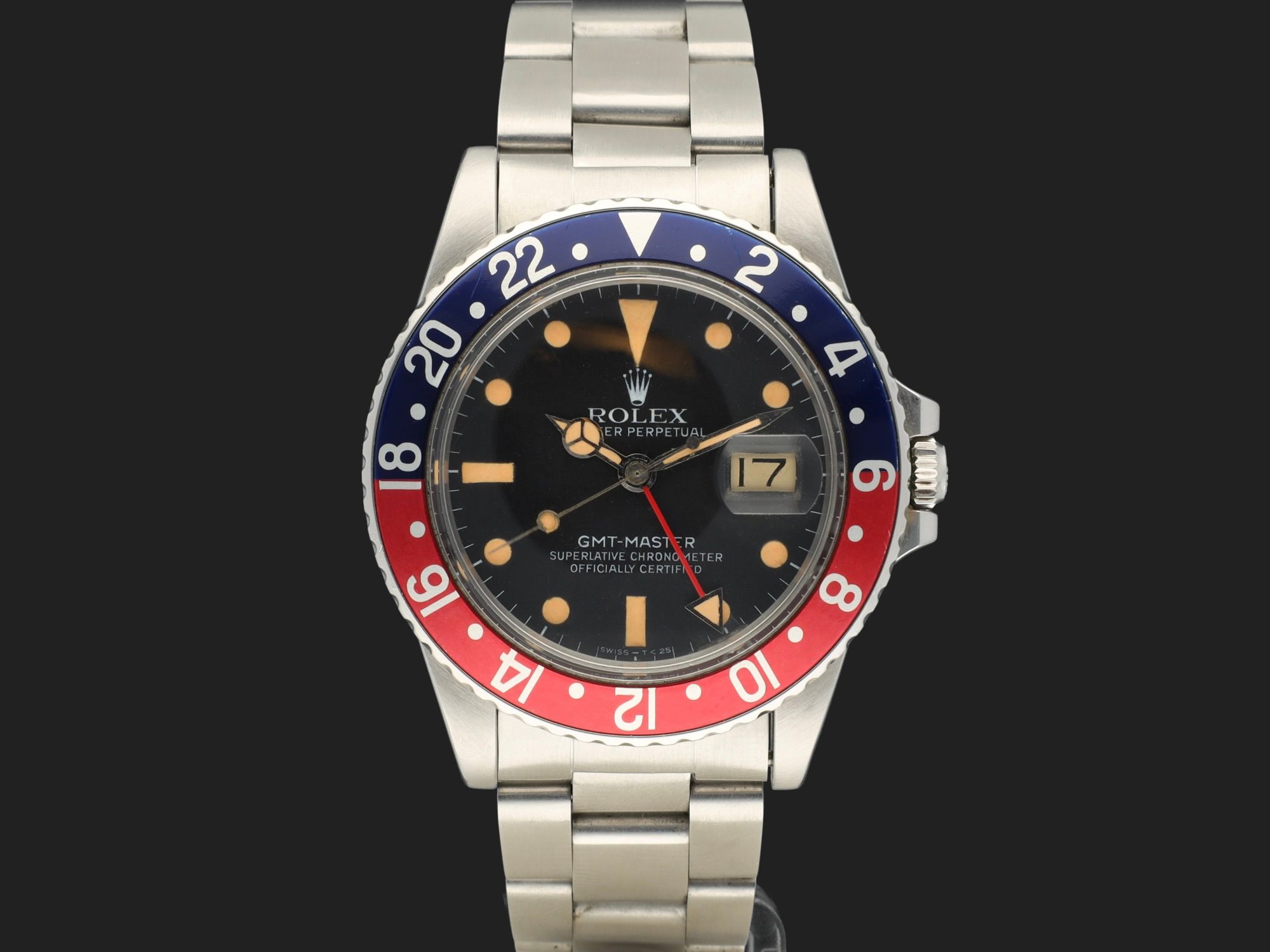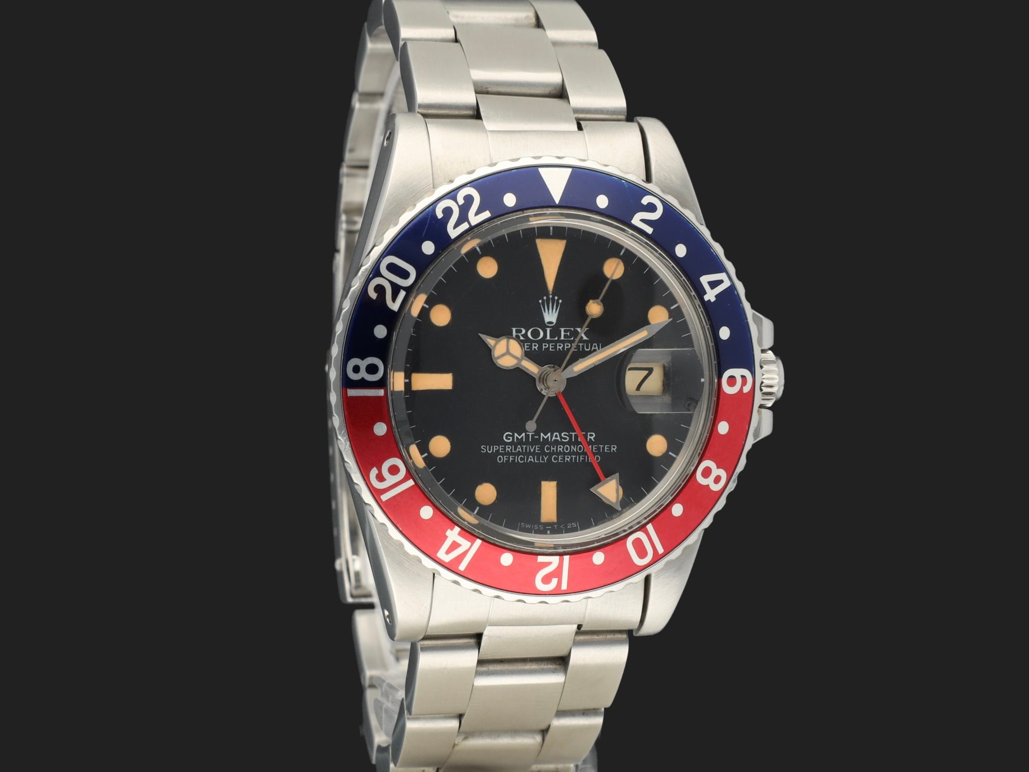 Featuring an original blue back Pepsi insert, 78360 Oyster bracelet with V1 clasp code (1996) and 580 endlinks. The case is in beautiful condition, with strongly patinated hour markers, professionally retouched.
