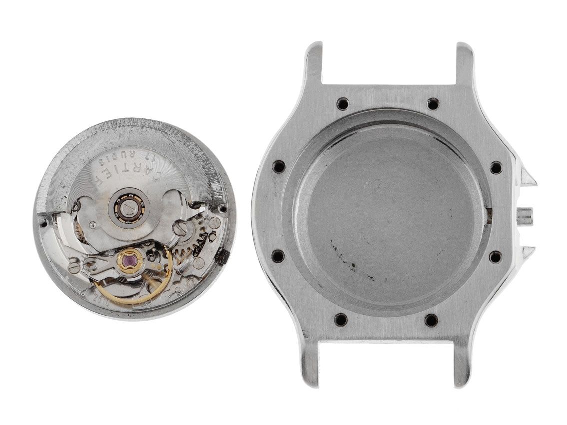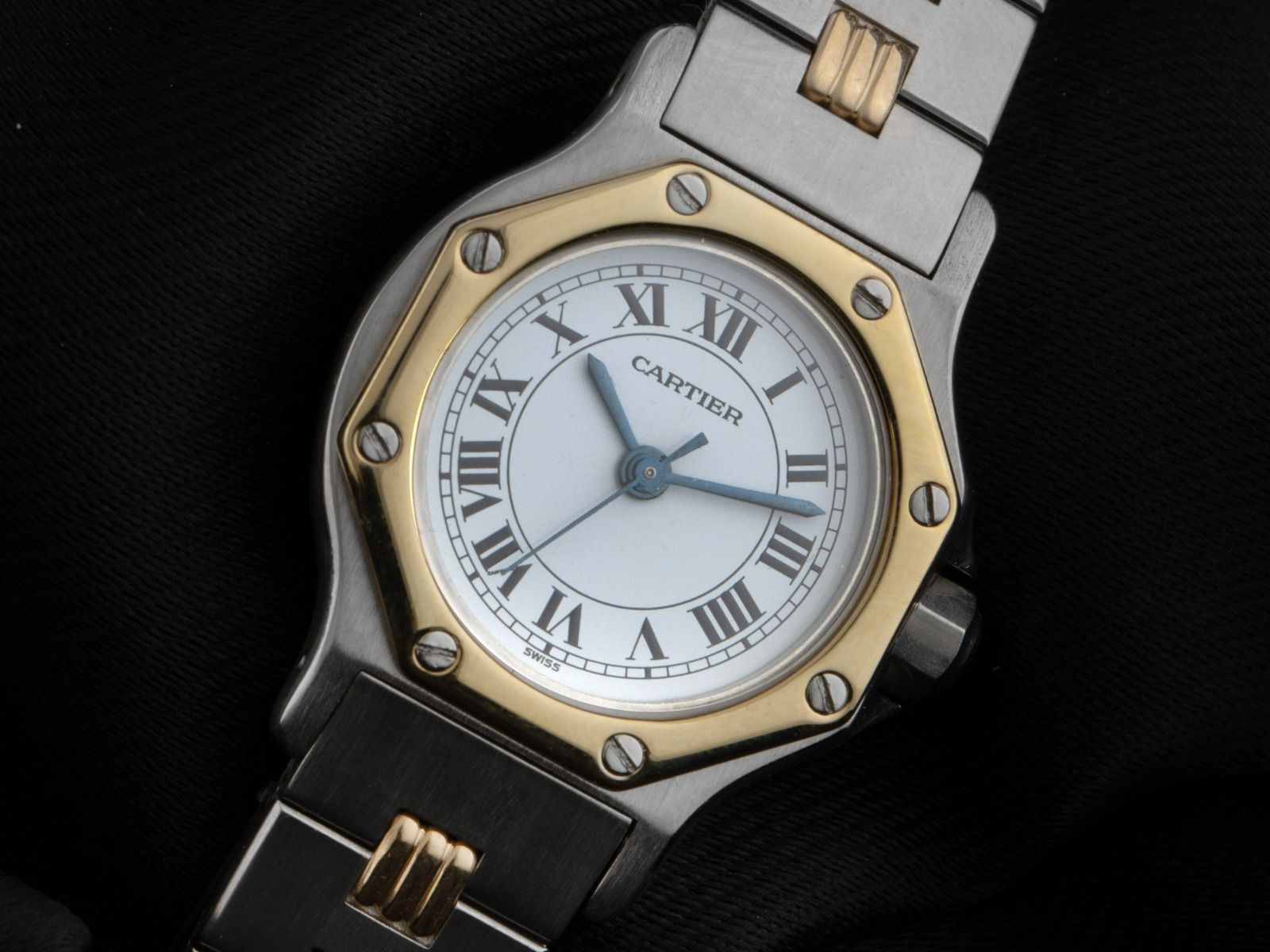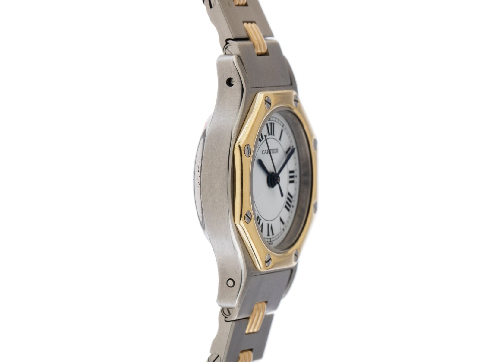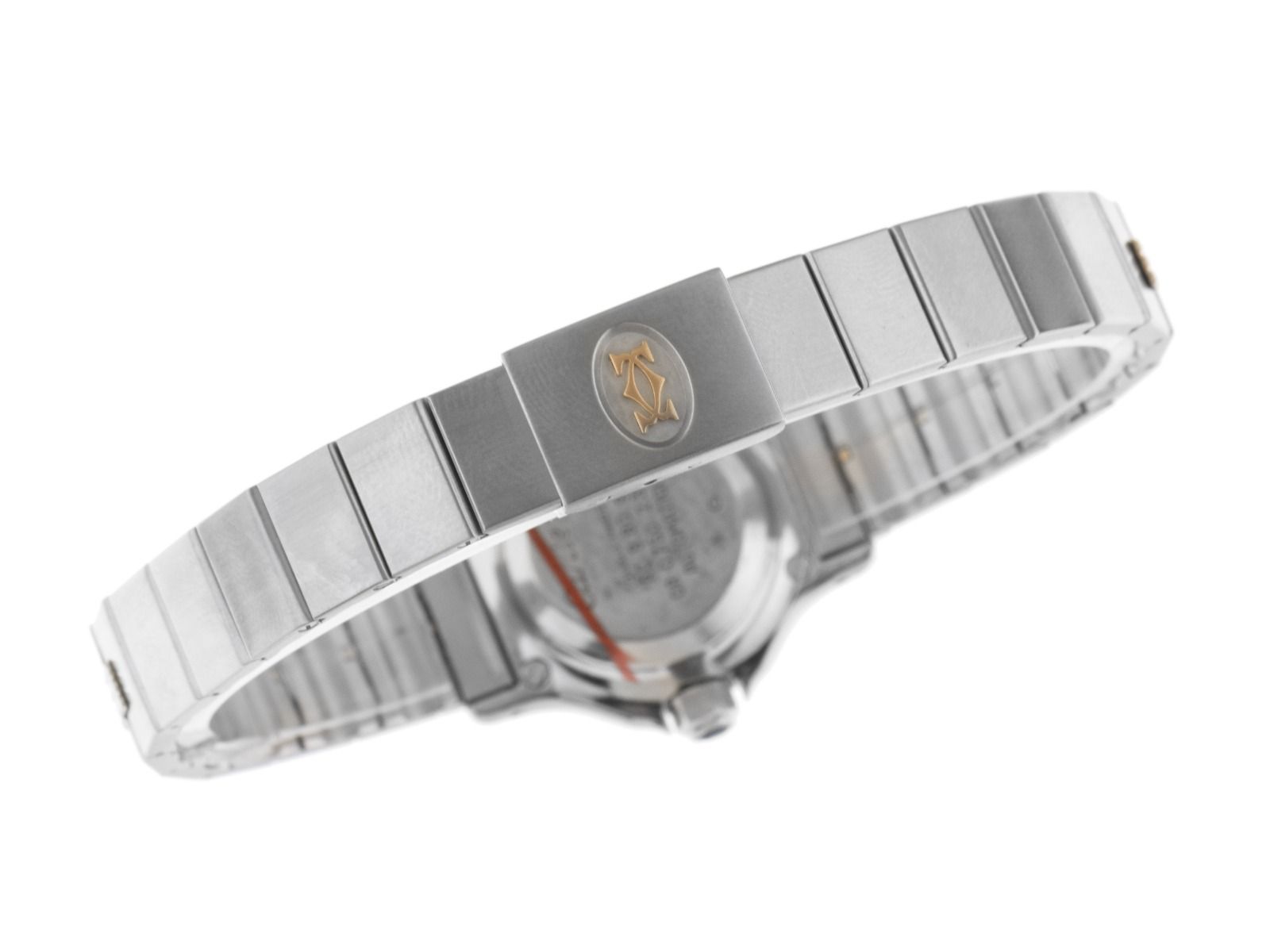 Gehäuse Edelstahl satiniert, Gehäusedurchmesser ohne Krone 25mm, Gehäusehöhe 8,9mm. Lünette 18kt Gelbgold 8-fach verschraubt und poliert. Armband Edelstahl / 18kt Gelbgold poliert und satiniert, Faltschließe Edelstahl. Zifferblatt weiß mit schwarzen römischen Ziffern und gebläuten Zeigern. Uhrwerk Automatik, Kaliber 2670 mit 17 Edelsteinen. Anzeige von Stunde, Minute und Sekunde über Zeiger aus der Mitte mit Sekundenstopp zur sekundengenauen Einstellung der Uhrzeit. Saphirglas kratzfest. Krone mit Spinell Cabochon. Boden Edelstahl 4-fach verschraubt und graviert. Gewicht der Uhr inklusive Armband 54g, Länge des Armbandes inklusive Gehäuse 180mm. Referenznummer: 187903, Gehäusenummer: 090770XXX, ID: P175010001025H-4100, Artikelnummer: 10000082696. Mit Gangkontrolle und kompletter äußerlicher Aufarbeitung von November 2025. Original Cartier Samttasche und Garantie Papiere von Juni 1985, Beschreibung sowie Watchregister Auszug von November 2025, The Watch Register Zertifikat / ohne Eintrag (Internationale Datenbank für verlorene oder gestohlene Uhren), Full Set. Superschnäppchen, Kapitalanlage mit Wertsteigerungspotential, sehr seltenes Sammlerstück. Sehr guter Zustand. Lieferzeit sofort.