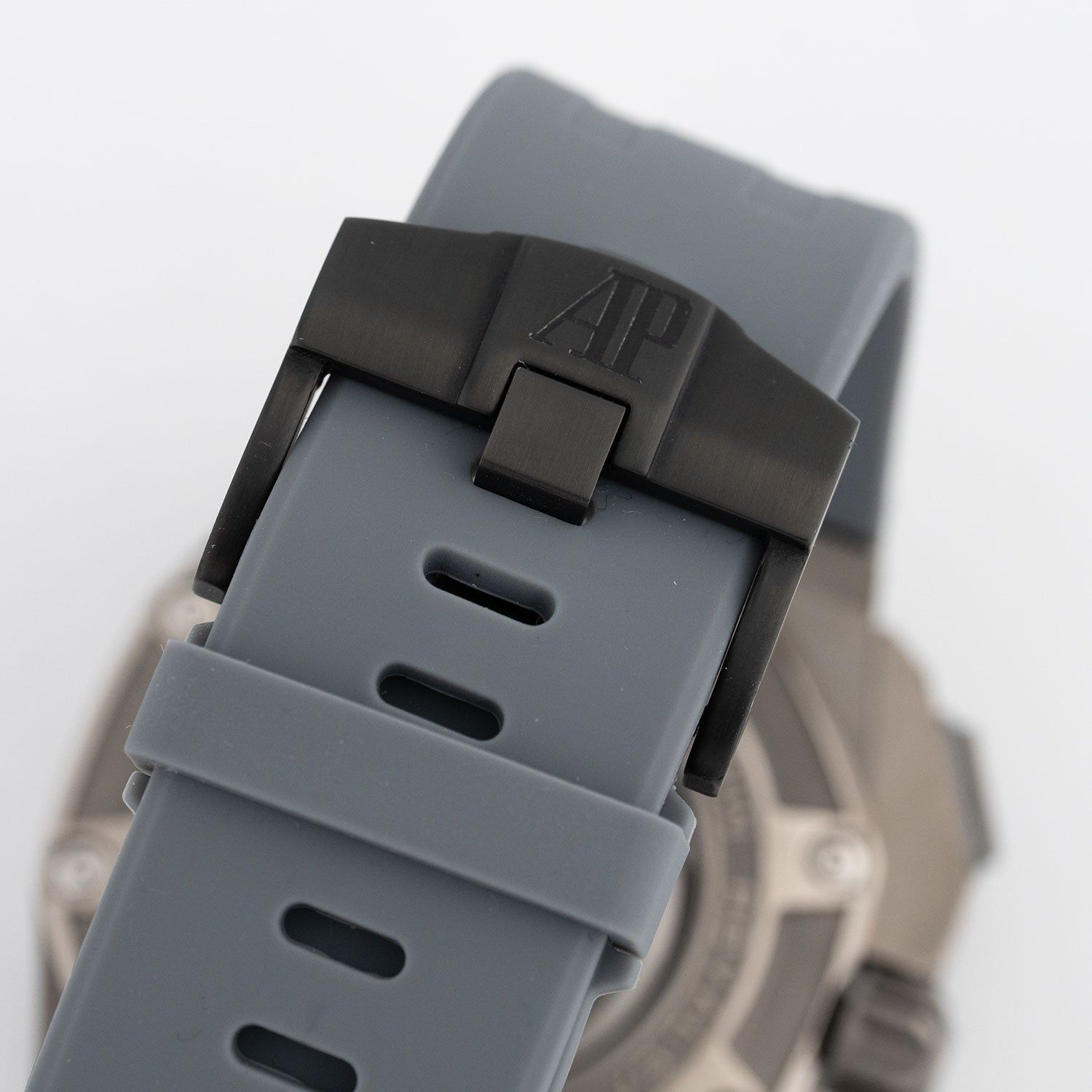 The Audemars Piguet Royal Oak Offshore Chronograph Michael Schumacher with the reference number 26568IM.OO.A004CA.01 is a limited special edition designed in honor of the seven-time Formula 1 world champion Michael Schumacher. This exclusive watch is limited to 1,000 pieces and is characterized by its striking design and high-quality materials. Case and Materials: The 44mm case is made of lightweight and durable titanium, while the octagonal bezel is made of cermet, an extremely hard and scratch-resistant material. The pushers and screw-down crown are made of black ceramic, which is not only visually appealing but also ensures additional durability. Dial and design features: The anthracite-colored "Mega Tapisserie" dial features applied hour markers and hands with a luminous coating for optimal readability. A special highlight are the seven stars on the Rehaut: two blue ones at 7 and 8 o'clock and five red ones from 11 to 1 o'clock, which symbolize Schumacher's world championship title. The red accents continue on the chronograph hands and give the watch a sporty touch. Movement: Inside is the automatic caliber 3126/3840 with 59 jewels, which is based on the proven AP caliber 3120 and has been expanded to include a chronograph module. It offers precise timekeeping and high reliability. Strap: The watch comes with a gray rubber strap, which ensures high wearing comfort and underlines the sporty character of the watch. The titanium pin buckle ensures a secure fit on the wrist. Special details: There is an engraving of Michael Schumacher's signature and the watch's individual limitation number on the caseback. These details make the watch a sought-after collector's item for motorsports and watch lovers alike. The Royal Oak Offshore Michael Schumacher Edition embodies the perfect symbiosis of watchmaking art and motorsport passion and is an impressive testament to Audemars Piguet's commitment to exclusive timepieces. You receive a 1-year guarantee on the function of the movement. The bracelet is an aftermarket bracelet.