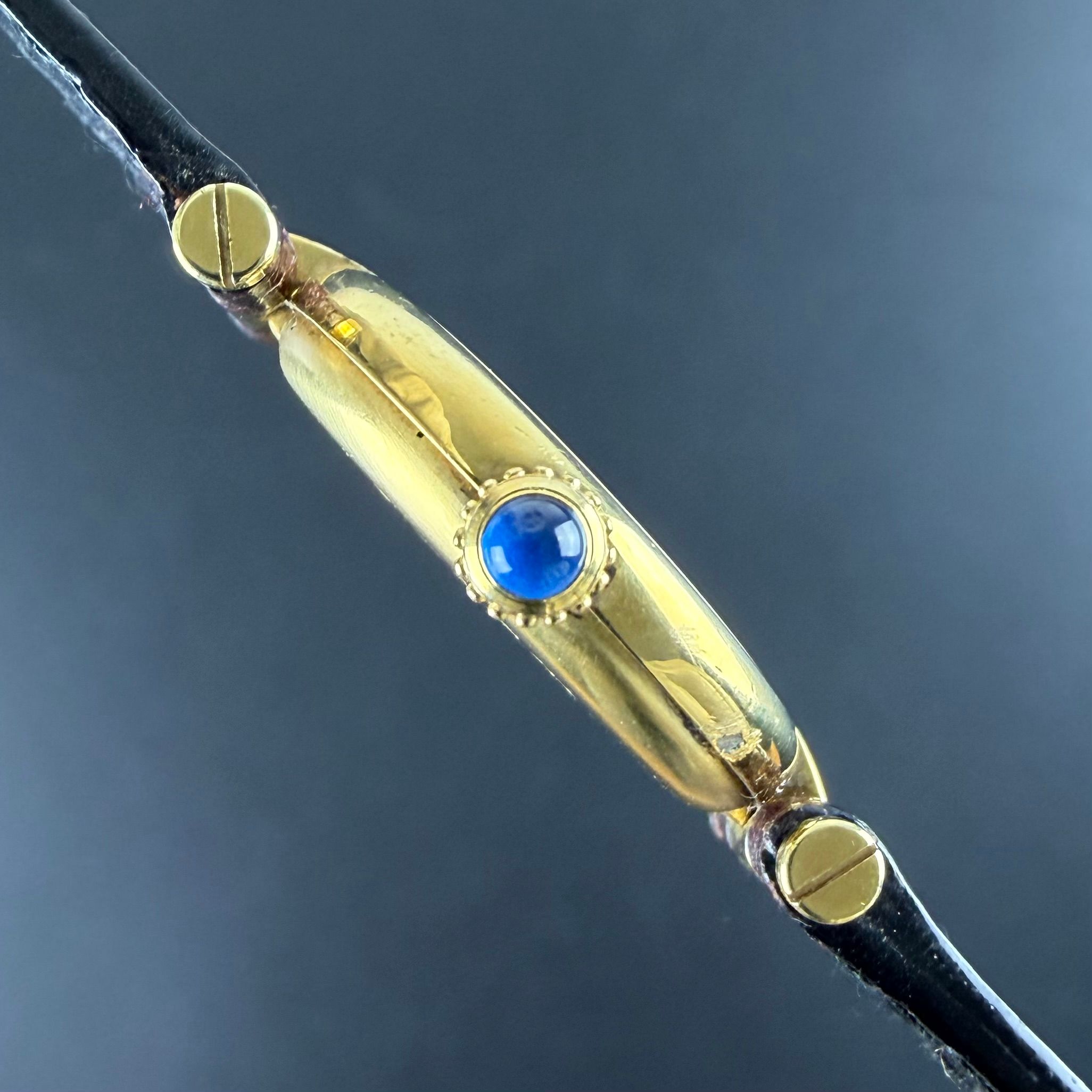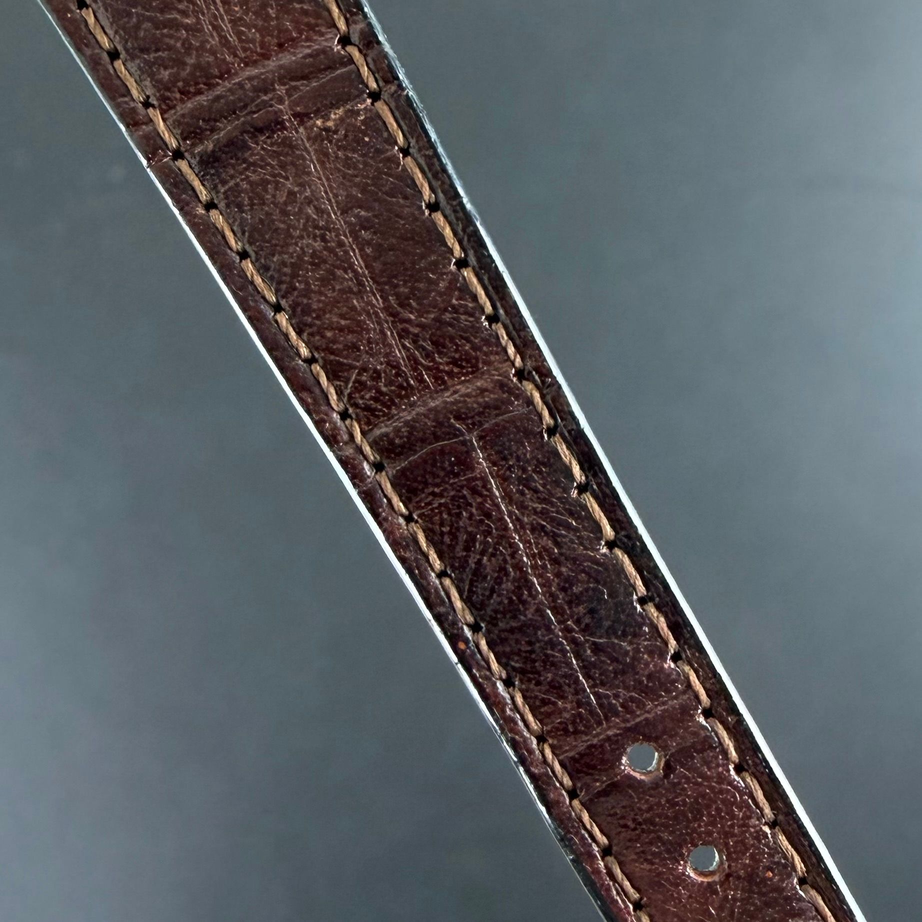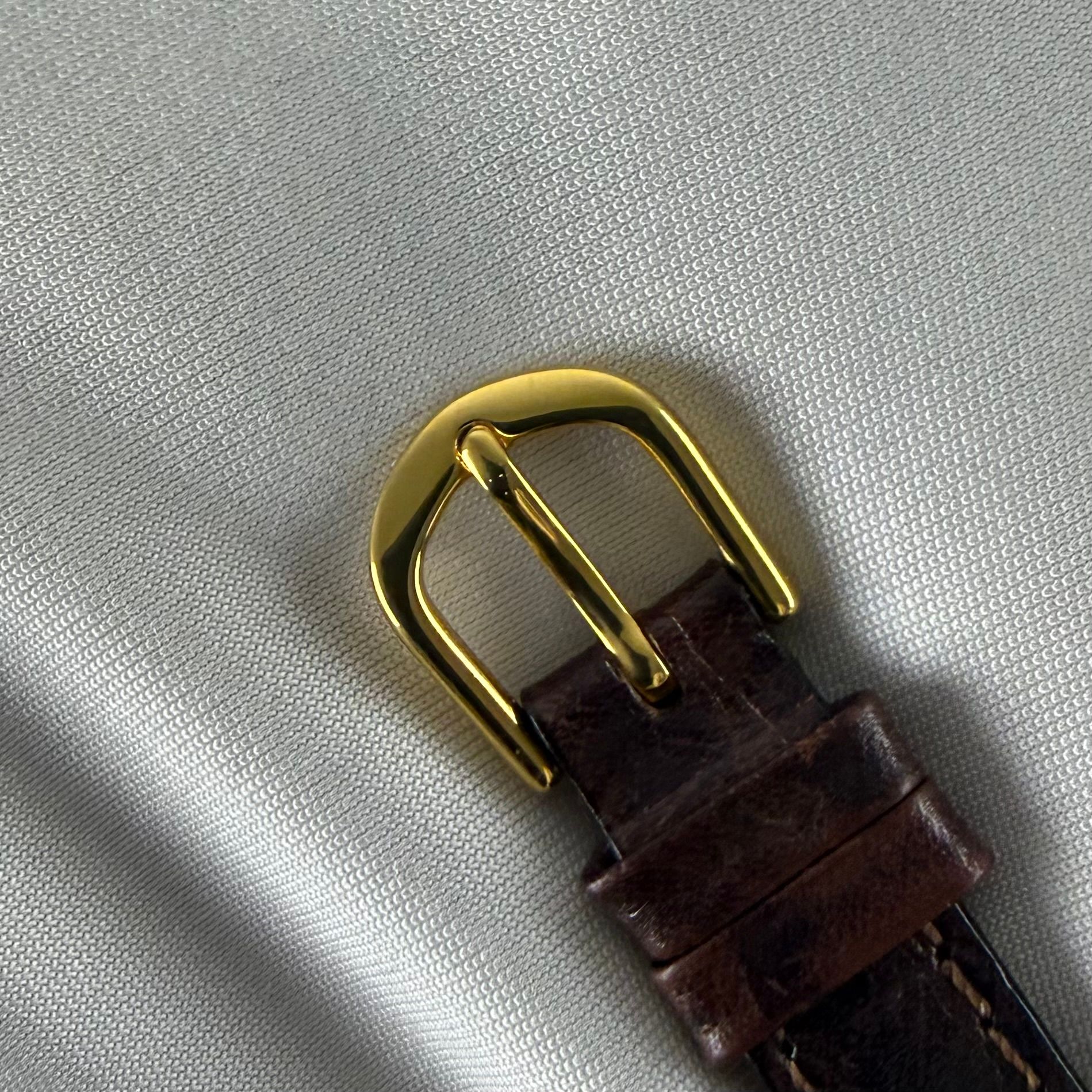 The watch has a blue ruby cabochon crown and runs on a Quartz 90 movement, overhauled in November and functioning perfectly. It comes on a brown leather strap. Great condition, especially for its age.