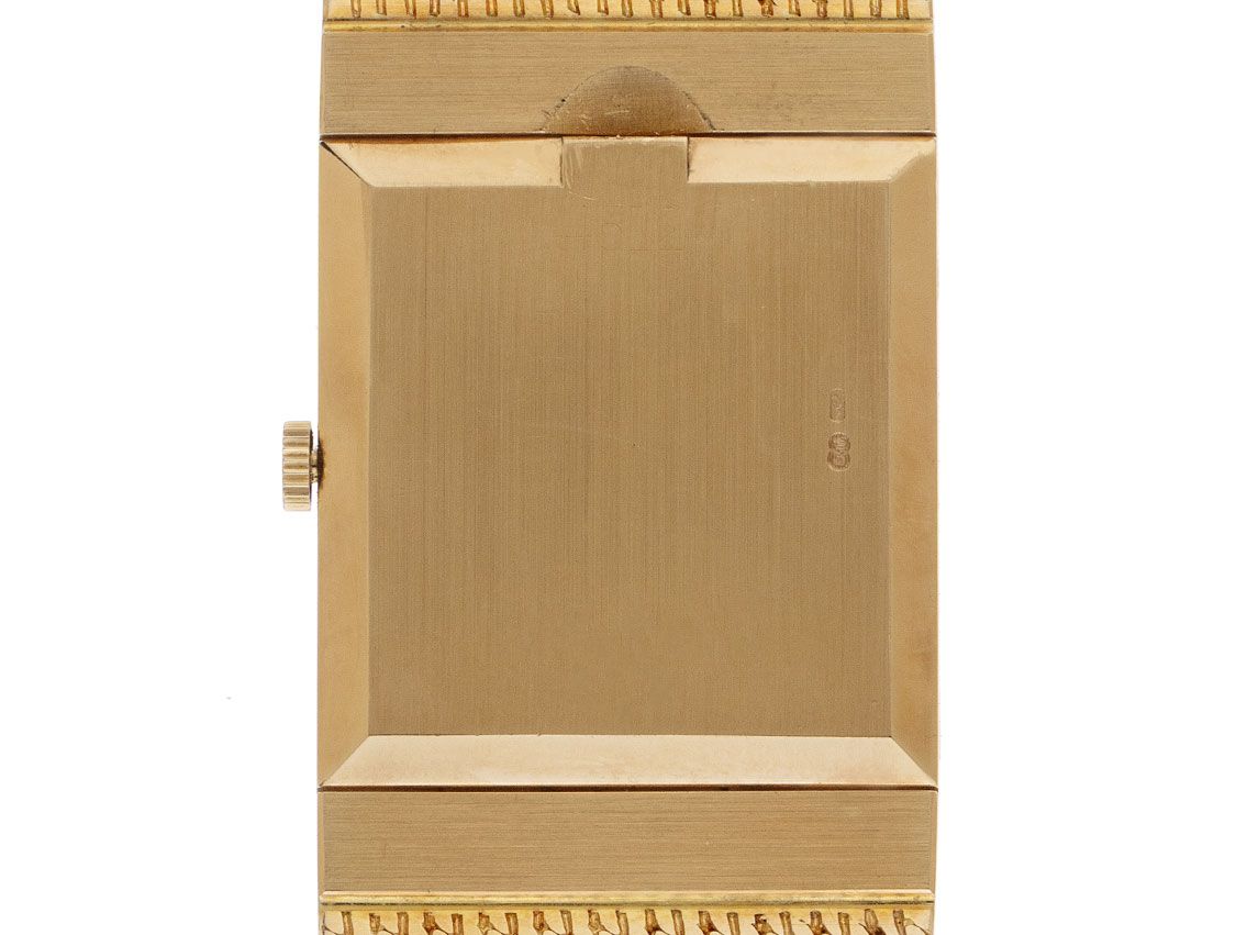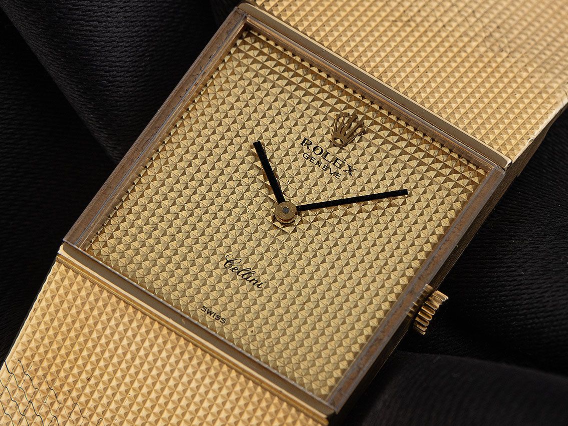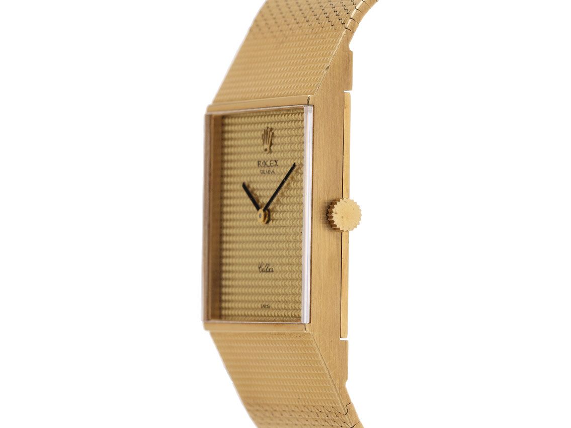 Gehäuse 18kt Gelbgold poliert und satiniert, rechteckig, Gehäusemaße ohne Krone (L x B x H) 24 x 24 x 6,0mm. Armband 18kt Gelbgold Clous de Paris, Klappschließe 18kt Gelbgold mit Hersteller-Logo. Zifferblatt champagnerfarben Clous de Paris Hobnail mit schwarzen Zeigern. Uhrwerk quarzgesteuert, Rolex Manufakturkaliber 651 mit 18 Edelsteinen. Anzeige von Stunde und Minute über Zeiger aus der Mitte. Saphirglas kratzfest. Krone geriffelt. Boden 18kt Gelbgold graviert. Gewicht der Uhr inklusive Armband 102g, Länge des Armbandes inklusive Gehäuse 180 - 185mm. Referenznummer: 4312, Gehäusenummer: 6920XXX, Baujahr: 1981, ID: KH1731240001125H-25500, Artikelnummer: 10000083191. Mit Gangkontrolle, neuer Batterie und kompletter äußerlicher Aufarbeitung von November 2025. Original Rolex Cellini Box mit Umkarton und Beschreibung sowie Übersetzungsheft, Ledermäppchen, Rolex Poliertuch, Tag und Watchregister Auszug von November 2025, The Watch Register Zertifikat / ohne Eintrag (Internationale Datenbank für verlorene oder gestohlene Uhren). Superschnäppchen, Kapitalanlage mit Wertsteigerungspotential, extrem seltenes Sammlerstück. Sehr guter Zustand. Lieferzeit sofort.