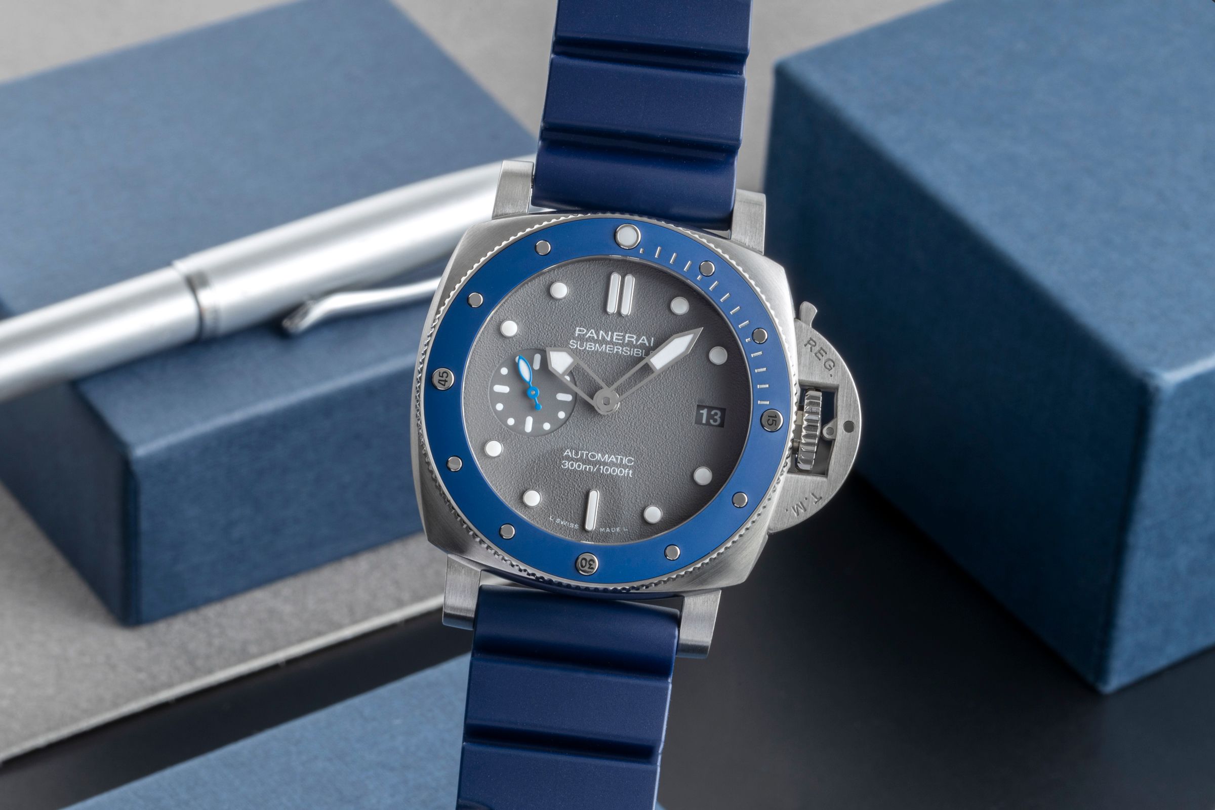 Alternative title: Panerai PAM00959 Luminor Submersible 42 3 Days Automatic Acciaio Blue Ceramic / Shark Grey; Panerai Luminor Submersible Edelstahl Automatik Herrenuhr Ref. PAM00959 B&P 2021 [2506386]