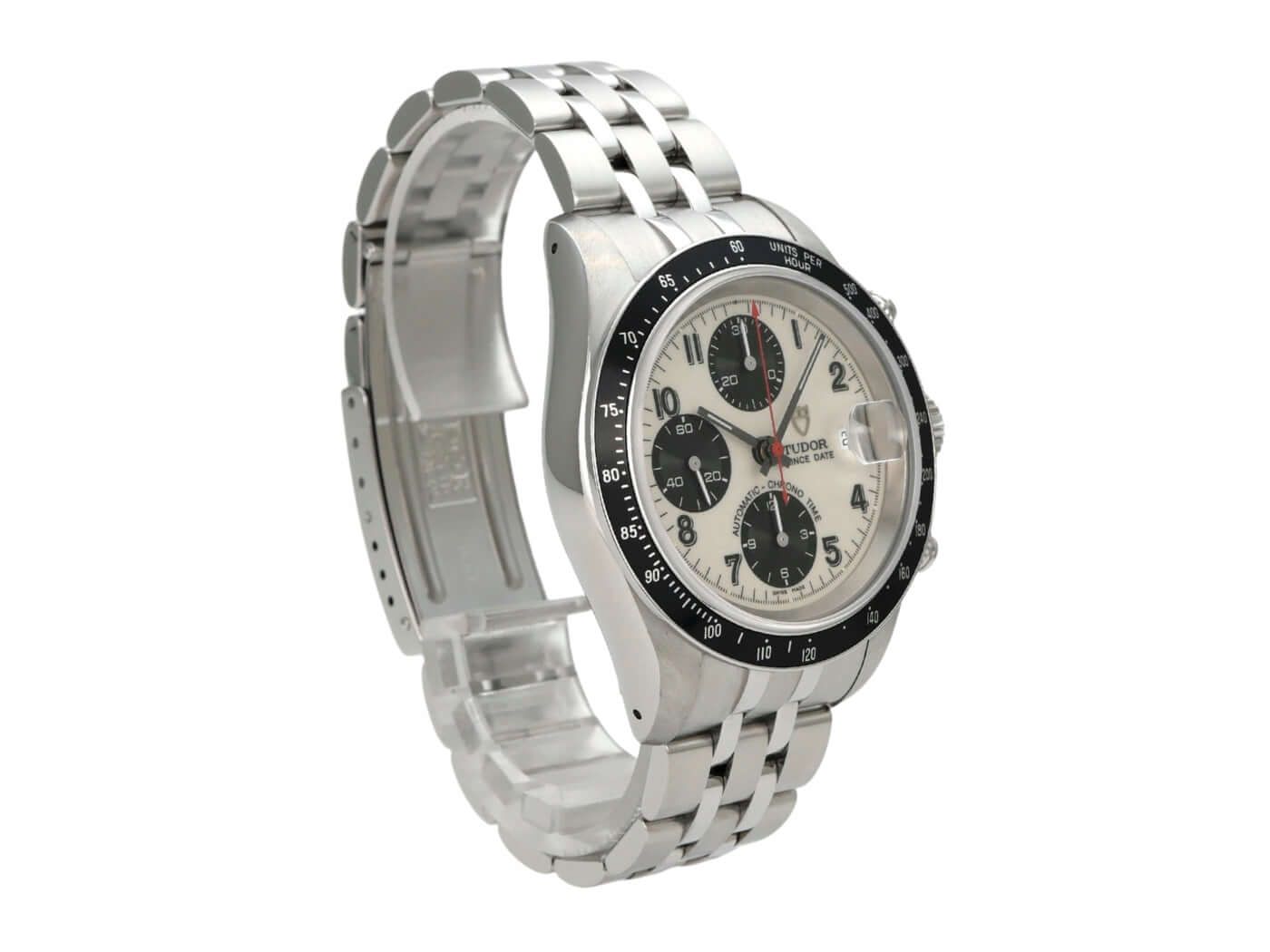 Case made of polished and satin-finished stainless steel, case diameter 40 mm, stainless steel bezel with tachymeter, stainless steel bracelet with folding clasp, white dial with applied luminous indices, black subdials, luminous hands, automatic, Tudor, 42 hours power reserve, chronograph, date, chronometer, sapphire crystal, screw-down crown, screwed and engraved stainless steel case back, water resistant up to 10 bar.