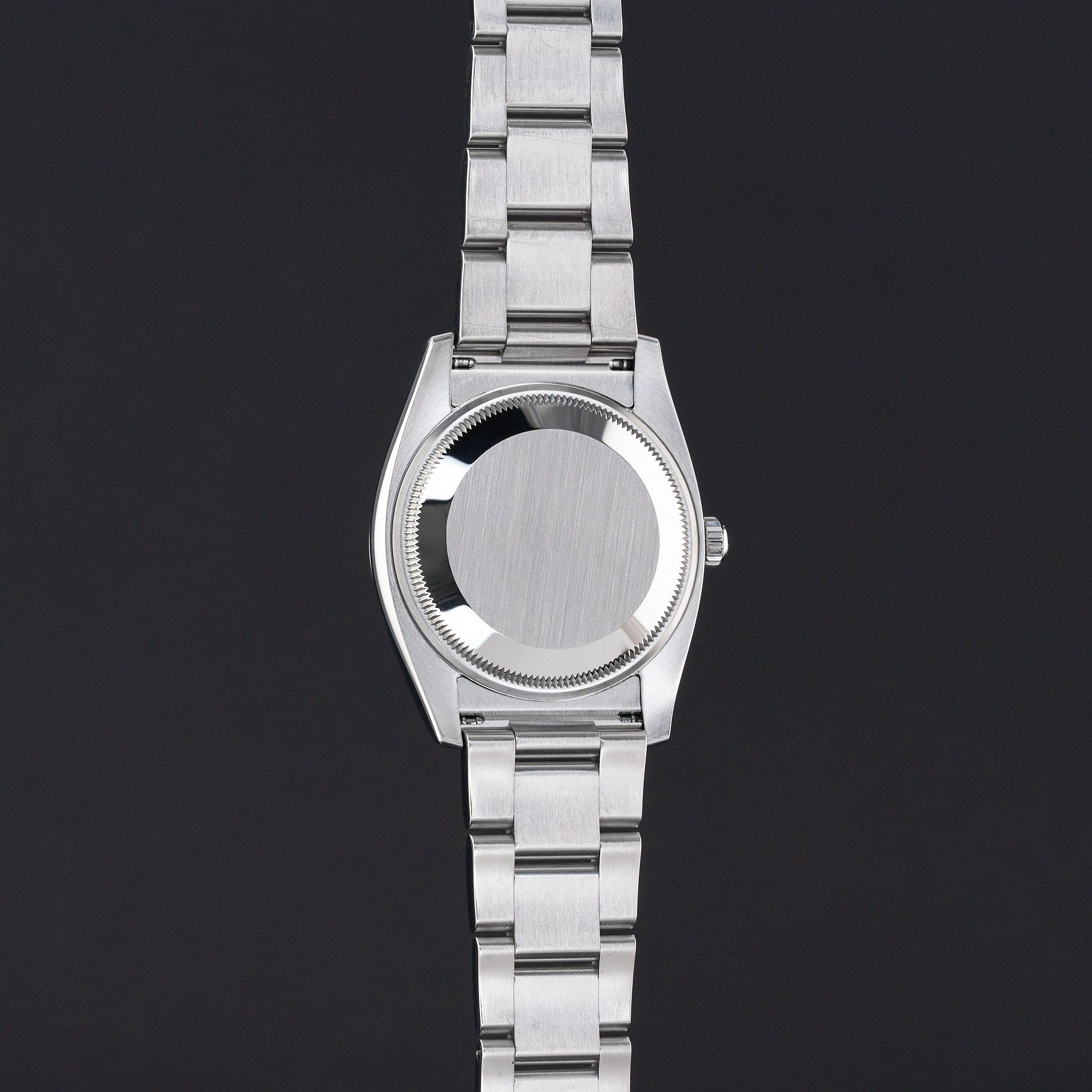 This Rolex Oyster Perpetual 114200 features a Red grape dial and is crafted from stainless steel.