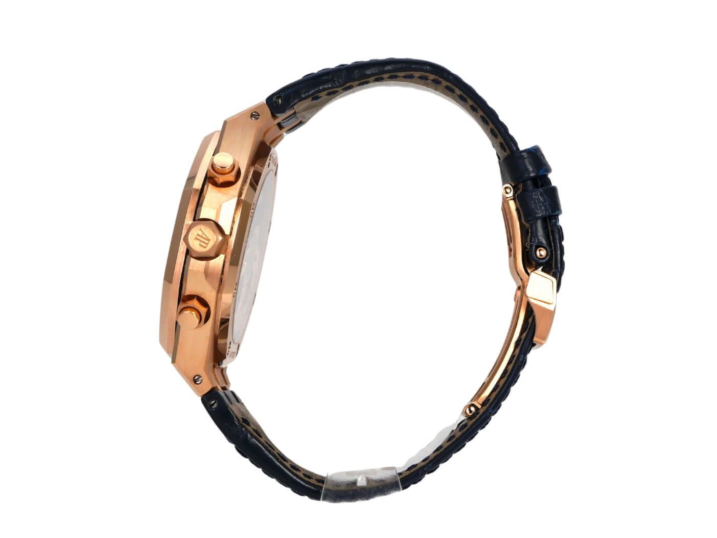 Audemars Piguet Royal Oak Chronograph 26240OR.OO.D315CR.02 Gehäuse aus 18 kt Roségold poliert und satiniert, Gehäusedurchmesser 41 mm, Gehäusehöhe 11 mm, Roségold Lünette poliert und satiniert, blaues Lederband mit Faltschließe, blaues Zifferblatt mit Leuchtindizes, Leuchtzeiger, Totalisatoren Rosé, Automatikwerk, Manufakturkaliber 4401 mit 40 Steine, Schwingung 28.800 A/h, Gangreserve für ca. 70 Stunden, Datumsanzeige, entspiegeltes Saphirglas, 18 kt Roségoldboden verschraubt und graviert mit Sichtfenster, wasserdicht bis zu 5 bar. Gebrauchte Uhr, sehr guter Zustand, komplett mit Box und Papieren, Auslieferung aus 2023.