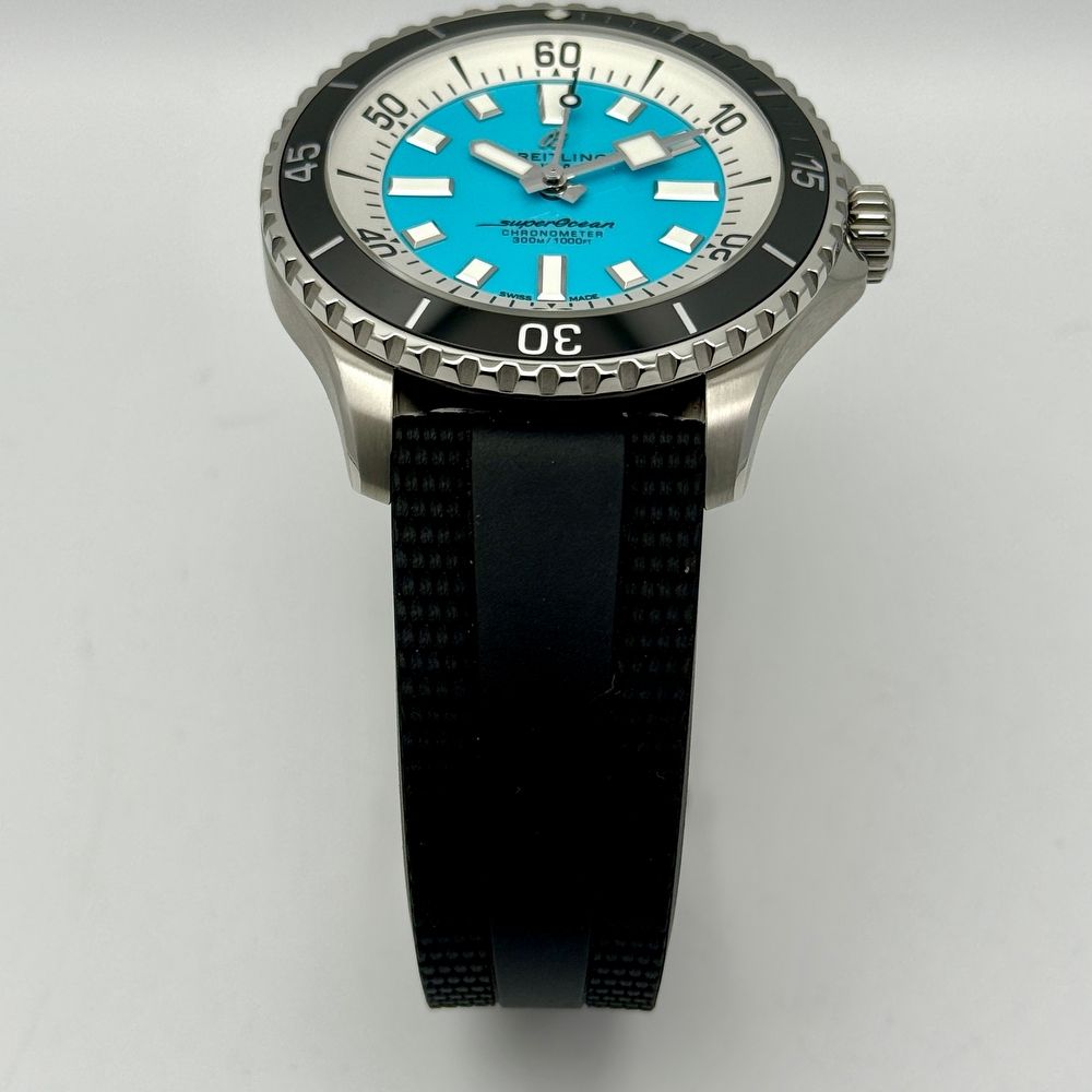 A scratch-resistant sapphire crystal with anti-reflective coating ensures clarity, while the unidirectional rotating bezel with ceramic inlay enhances durability and adds a refined, sporty look. With 300 meters of water resistance, a screw-down crown, and Breitling’s solid dive construction, the watch is engineered for both aquatic performance and daily wear. This model is fitted on a turquoise rubber strap with a stainless steel folding clasp, complementing the dial’s vivid color.