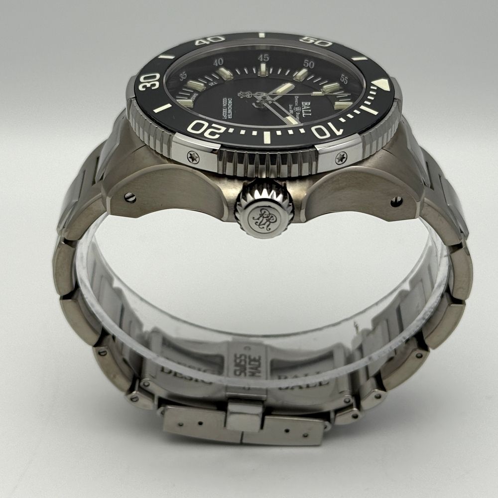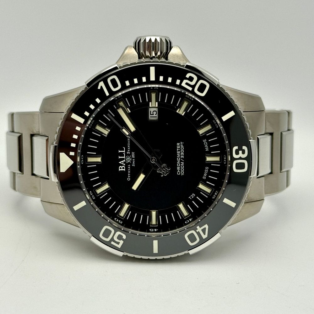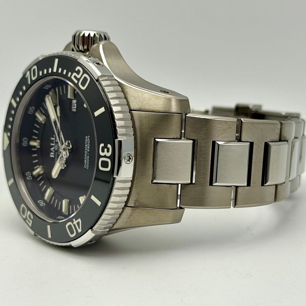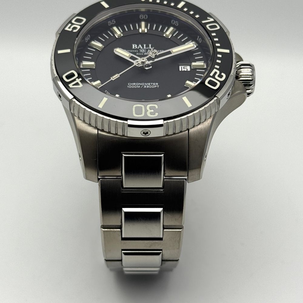 The Ball Engineer Hydrocarbon DeepQUEST, reference DM3002A-S3Cj-BK, features a 42 mm monobloc titanium case engineered from a single block of metal, offering extreme structural integrity and impressive lightweight strength. Its matte black dial with applied micro gas tubes provides unmatched luminosity without requiring external light charging, ensuring perfect legibility in any environment. Powered by the Ball caliber RR1101-C automatic movement (COSC-certified and based on the ETA 2892-A2), it delivers a 42-hour power reserve, a frequency of 28,800 vph, and functions including hours, minutes, central seconds, and a date display at 3 o’clock.